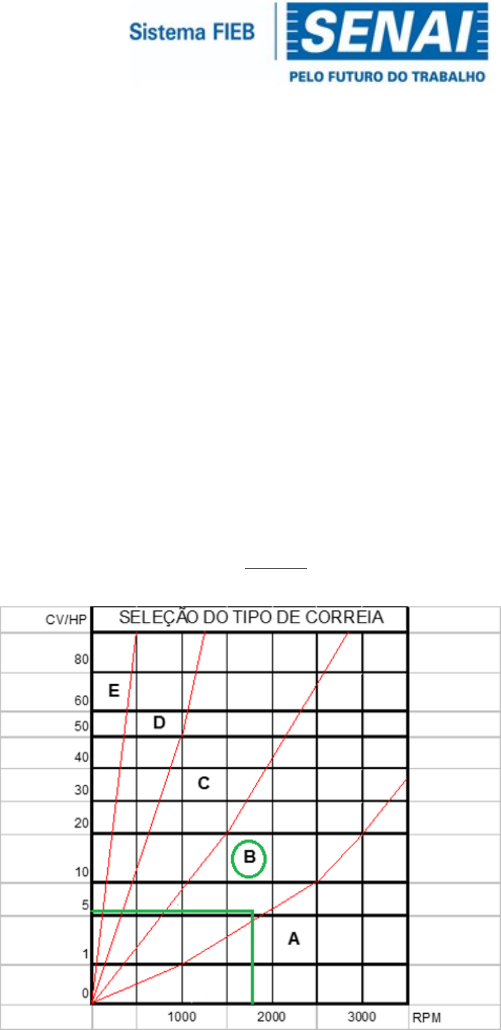 Professora: Aluno:Roberto EXERCÍCIO DE FIXAÇÃO A furadeira de bancada acionada por um motor elétrico em C.A. e síncrono com potência de ½ cv e 1160 rpm trabalha 18 horas por dia e o eixo da árvore deverá girar a 400 rpm. Determine o tipo de correias em V necessárias e escolha os diâmetros das polias. Passos: 1) Definir perfil da correia; 2) Escolha dos diâmetros nominais das polias. 1º ‐ SELEÇÃO DO PERFIL DA CORREIA ATRAVÉS DA ROTAÇÃO DO EIXO MAIS RÁPIDO E DA POTÊNCIA DO MOTOR, DETERMINA‐SE O PERFIL DA CORREIA NO GRÁFICO ABAIXO. CONFORME EXEMPLO GRIFADO EM VERDE TEMOS: (5 CV e 1800 rpm = Perfil “B”). 2º ‐ ESCOLHA DOS DIÂMETROS NOMINAIS DAS POLIAS Através da tabela nº 1, a seguir, escolhe‐se o diâmetro mínimo da polia menor, de acordo com o perfil da correia. TABELA Nº 1 Como no exemplo o perfil é “B”, o diâmetro nominal da polia menor será: D1 = 130 – 12,5 = 117,5 mm. O diâmetro da polia maior será encontrado através da relação de transmissão, onde o diâmetro da polia maior será a relação de transmissão. i = Relação de transmissão. i = n1 = D2 n2 D1 Resultado: D2 = 1800 x 117,5 = 705 mm. 300 Seguindo modelo do exemplo acima, temos: Correia perfil “B”; D1 = 117,5 mm; D2 = 705 mm. No caso o perfil selecionado é A* o diâmetro nominal da polia menor será D1=75 – 10 =65 mm O diâmetro da polia maior será encontrado através da relação de Transmissão, onde o diâmetro da polia menor será a relação de Transmissão. Fórmula para encontrar o valor D2. I= Resposta:D2= A Correia a ser utilizado do perfil (v ),tipo( A),cujo diâmetro das polias serão D1 =65 mm D2 =188,5. Código ou número da Correia A7,comprimento 1752 mm. Boa Sorte!!!