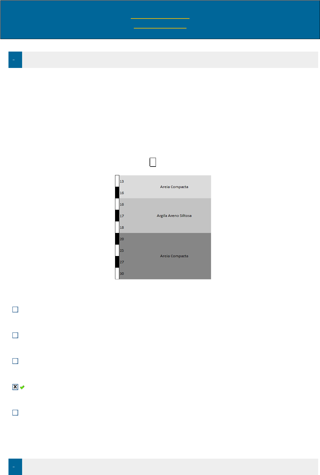 AV – ESTÁCIO FUNDAÇÕES 1. Pontos: 1,00 / 1,00 Para estimar os valores da Coesão em situações em que não se dispõem de resultados de ensaios de laboratório, Teixeira e Godoy (1996) propõem uma fórmula que permite estimar o valor da coesão não drenada, com base na resistência a penetração do solo obtida no ensaio de sondagem (Nspt), Equação 1. c=10Nspt(kPa)Equação 1 Para a realização da estimativa do ângulo de atrito interno (ϕ) no caso de areias a literatura recomenda a utilização das propostas feitas por Godoy em 1983 (Equação 2). ϕ=28°+0,4NsptEquação 2 Dado o perfil geotécnico abaixo, sabendo que a fundação será apoiada a 2 metros de profundidade, a carga aplicada no pilar é de 105 tf e a seção do pilar é = 25 x 45 cm, calcule o valor da coesão, ângulo de atrito e a área da sapata, considere para o cálculo da tensão admissível a Equação 3. σadm=0,1(√N−1)[MPa]Equação 3 Figura - Perfil Geotécnico (Da Autora) 180 kPa, 38,5° e 3,5 m². 160 kPa, 36,4° e 5,5 m². 170 kPa, 34,4° e 4,5 m². 160 kPa, 34,4° e 3,5 m². 165 kPa, 35,4° e 3,0 m². 2. Pontos: 1,00 / 1,00 Dada os dados abaixo extraídos de uma a curva de tensão x recalque, obtida a partir de um ensaio de carga sobre placa com diâmetro de 80 cm, realizada em uma argila porosa no Estado do Rio de Janeiro, estime o recalque de uma sapata quadrada de 1,50 metros de lado ao ser instalada na mesma cota e em local próximo à placa de ensaio, aplicando uma tensão de 0,100 MPa provoca-se um recalque de ρp=5mm. ρs=10,625mm ρs=10,225mm ρs=10,435mm ρs=11,335mm ρs=11,625mm 3. Pontos: 1,00 / 1,00 Ao se abordar o tema de fundações, é importante ressaltar as propriedades dos materiais que serão utilizados para a construção, além das características do solo de apoio. No dimensionamento de vigas de fundação, se faz necessário verificar se a força cortante de cálculo é menor que a força cortante resistente, condição essa necessária para que não haja o esmagamento do concreto. Considerando a seção da viga proposta abaixo, com força cortante de cálculo de 1200kN, considerando θ=45°, sendo o coeficiente de redução da resistência do concreto fissurado por força cortante 0,54 e o fck de 25MPa, calcule a Força Cortante Resistente e verifique se ocorre o Esmagamento do Concreto. Fonte: YDUQS - Estácio - 2021 VRd,2=13885,70kN≥Vd=1200kN→Não há esmagamento do concreto VRd,2=1680kN≥Vd=1200kN→Não há esmagamento do concreto VRd,2=1388,60kN≥Vd=1200kN→Não há esmagamento do concreto VRd,2=1450kN≥Vd=1200kN→Não há esmagamento do concreto VRd,2=138,85kN≤Vd=1200kN→Há esmagamento do concreto 4. Pontos: 1,00 / 1,00 (FCC / 2015 - adaptada) Ao se abordar o tema de fundações, é importante ressaltar as propriedades dos materiais que serão utilizados para a construção, além das características do solo de apoio. No dimensionamento das fundações de um pilar de 30 × 30 cm com carga solicitante de cálculo de 1600 kN incluindo o peso próprio. Se for considerada a tensão admissível do solo igual a 0,4 MPa, a sapata mais econômica terá forma Quadrada de lado igual a 1 m. Quadrada de lado igual a 2,0 m. Retangular de lados 1,0 m e 1,5 m. Quadrada de lado igual a 1,5 m. Retangular de lados 0,50 m e 1,50 m. 5. Pontos: 0,00 / 1,00 Para a elaboração e projetos de fundações, deve-se seguir uma série de normas que normatizam o dimensionamento de cargas e a resistência que a edificação deve apresentar para ser segura. Você é o engenheiro geotécnico responsável para elaboração de um projeto de fundações profundas. Diante do perfil de sondagem que lhe foi apresentado você obteve a Resistência Lateral de 50 kN e a Resistência de Ponta de 450 kN aplicando o método de Décourt-Quaresma. A fim de finalizar os cálculos, calcule a capacidade de carga admissível da estaca. Adote à estaca como sendo de uma estaca escavada de 0,70 m de diâmetro, executada ao longo de 15 m da camada de solo. 169,22 kN 150,96 kN 138,69 kN 125,78 kN 142,55 kN 6. Pontos: 0,00 / 1,00 Para a elaboração e projetos de fundações, deve-se seguir uma série de normas que normatizam o dimensionamento de cargas e a resistência que a edificação deve apresentar para ser segura. Suponha que você é o engenheiro de fundações e que se deseja construir um edifício de 20 andares. Sabendo que a Resistência Lateral obtida pelo Método de Aoki-Velloso é de 400 kN e que a Resistência na Ponta da Estaca é de 500 kN, calcule o número necessário de estacas escavadas, de diâmetro de 60 cm e 14 m de comprimento, para apoiarem um pilar com 1000 kN de carga vertical. 1 Estaca 5 Estacas 2 Estacas 4 Estacas 3 Estacas 7. Pontos: 1,00 / 1,00 (GUIMARÃES, 2018 - adaptada) O funcionamento mecânico dos diversos tipos de fundação trabalha de forma diferenciada e de acordo com a obra em andamento. Por exemplo, temos os tipos que trabalham por atrito ao logo do fuste e por resistência na ponta. De um modo geral, para elementos razoavelmente longos, o fuste responde com a totalidade da carga a ser suportada, e, a ponta, com uma carga adicional que garante o coeficiente de segurança. O tipo descrito se refere a: Vigas de Equilíbrio. Sapatas. Estacas. Radiers. Caixão. 8. Pontos: 1,00 / 1,00 (GUIMARÃES, 2018 - adaptada) Definida pela NBR 6122:2019 como estaca de concreto moldada in loco, executada mediante a introdução no terreno, por rotação, de segmentos de trado helicoidal de diâmetro constante. A injeção de concreto é feita pela haste centraldo trado, simultaneamente à sua retirada. A armadura é sempre colocada após a concretagem daestaca. Trata-se da estaca tipo: Microestaca. Metálica. Hélice Contínua. Tubulão. Raiz. 9. Pontos: 0,00 / 1,00 Aponte a alternativa correta em relação às sondagens de simples reconhecimento dos solos para as fundações de edifícios. Segundo a NBR 6484:2020, a cravação do amostrador-padrão deverá ser interrompida ant