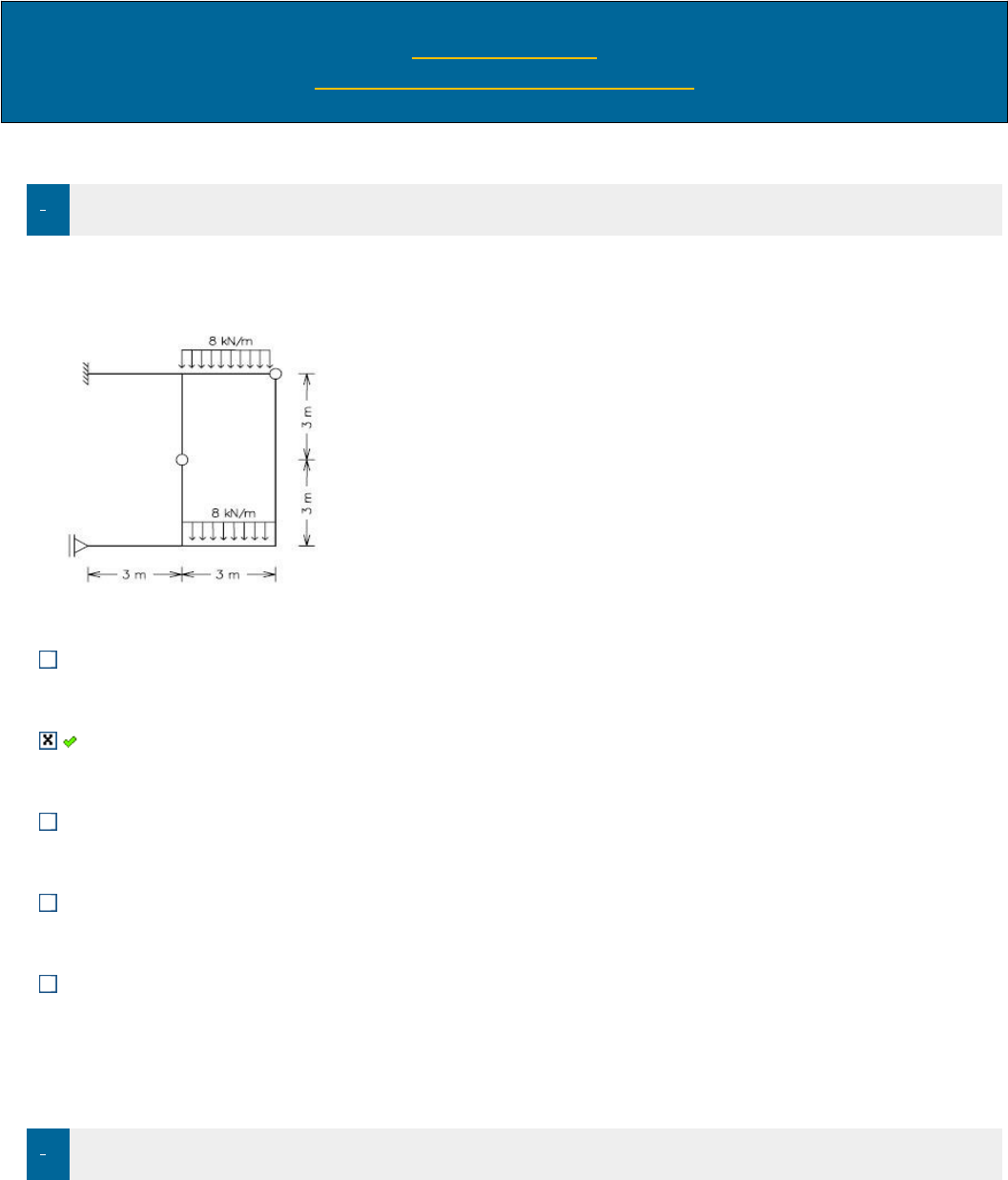 AV – ESTÁCIO TEORIA DAS ESTRUTURAS II 1. Pontos: 2,00 / 2,00 Determine o número total de deslocabilidades da estrutura abaixo: 7 4 3 5 2 2. Pontos: 0,00 / 2,00 A sapata central de uma viga de concreto armado com dois vãos (6m e 5m), apoiada em três sapatas, sofreu um recalque de 5 cm. Considere que o problema foi modelado como representado na figura abaixo, considerando o momento de inércia da seção igual a 0.002 m4 e o módulo de elasticidade de 23000000 kN/m2. Determine o valor da reação de apoio na sapata que sofreu o recalque. 38,33 kN 230 kN 46,00 kN 175,33 kN 84.33 Kn 3. Pontos: 0,00 / 2,00 A sapata central de uma viga de concreto armado com dois vãos (6m e 5m), apoiada em três sapatas, sofreu um recalque de 5 cm. Considere que o problema foi modelado como representado na figura abaixo, considerando o momento de inércia da seção igual a 0.002 m4 e o módulo de elasticidade de 23000000 kN/m2. Determine o valor do momento fletor no apoio central 230,00 kNm 46,00 kNm 84,33 kNm 115,00 kNm 38,33 kNm 4. Pontos: 2,00 / 2,00 Quantas rótulas precisam ser colocadas em um pórtico plano composto por duas colunas e uma viga, engastado nas bases, de modo que ele tenha um grau de hiperestaticidade igual a 1? 1 2 4 0 3 5. Pontos: 2,00 / 2,00 Obter o valor de momento fletor no engaste da viga abaixo, usando o método rigidez direta: Dados: E = 100GPa = 1,0x108 kN/m2 Seção transversal = 150 mm x 300 mm M engaste = -257,21 kNm Nenhuma resposta acima M engaste = 257,21 kNm M engaste = 297,21 kNm M engaste = -297,21 kNm
