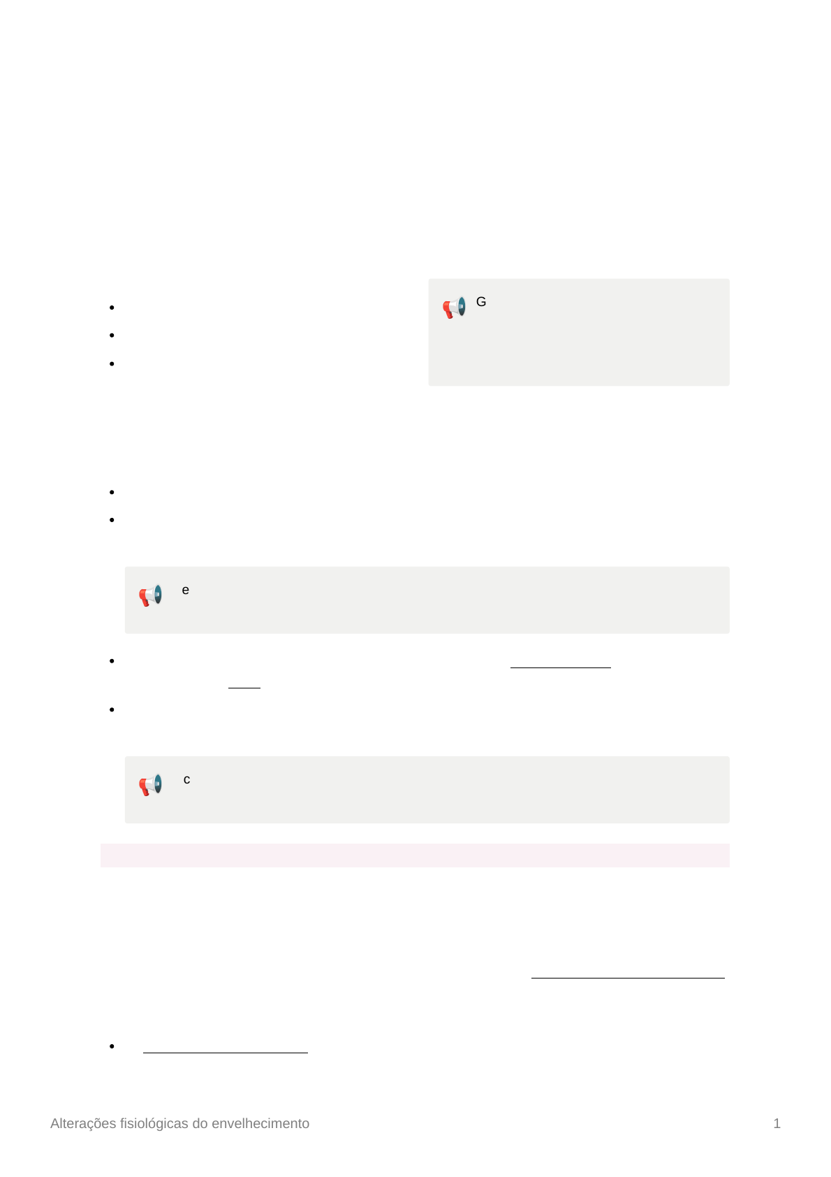 Alterações fisiológicas do envelhecimento 1 Alterações fisiológicas do envelhecimento O envelhecimento é caracterizado por alterações previsíveis, progressivas, associadas ao aumento da suscetibilidade para muitas doenças. Esse processo não é uniforme entre as pessoas. Concorrem para a variação da longevidade: fatores genéticos estilo de vida escolhido exposições ambientais 📢 Gerontologia = estudo dos fenômenos fisiológicos, psicológicos e sociais relacionados ao envelhecimento do ser humano Composição corporal Por volta dos 25 anos já podemos observar modificações na composição corporal. Toda a celularidade diminui, reduzindo a função dos órgãos, continuamente. Ocorre diminuição da água intracelular, tornando o organismo da pessoa idosa desidratado, fisiologicamente. 📢 Devemos ficar alertas ao prescrever fármacos hidrossolúveis, como a digoxina, pois elas estarão em maior concentração, podendo ocorrer efeitos indesejáveis. A musculatura vai diminuindo, especialmente as fibras tipo II, de contração rápida, como as encontradas nas mãos. Com isso a força muscular vai diminuindo. Em contrapartida, há aumento proporcional da gordura, especialmente em torno da cintura pélvica, provocando modificações da silhueta. 📢 Ficar alerta para as substâncias lipossolúveis, como as de ação central, pois terão seu tempo de ação aumentado. Pele A pele é um importante órgão pelas várias funções que exerce. Além de ser o invólucro que nos separa do meio externo, previne a perda de água, regula o equilíbrio hidreletrolítico, controla a temperatura corporal e recebe os estímulos sensoriais de tato, pressão, temperatura e dor A pele se torna seca, por diminuição das glândulas sebáceas, e espessada, com as papilas dérmicas menos profundas, levando a menor junção entre a epiderme e a derme, facilitando a formação de bolhas e predispondo a lesões. O número de melanócitos diminui de 8 a 20%, por década, após os 30 anos. Esse fato, associado: ao alentecimento da reposição das células da epiderme Alterações fisiológicas do envelhecimento 2 ao maior tempo de exposição aos raios UV à redução das células de Langerhans (células mediadoras da resposta imunológica na pele) contribui para o aumento da incidência do câncer de pele. Na derme do indivíduo idoso, observa-se menor número de fibras elásticas e colágenas, levando a uma perda da resiliência e à formação de rugas. Também há diminuição da vascularização, justificando a palidez e a diminuição da temperatura da pele, aumentando a frequência de dermatites. Pálpebras A flacidez das pálpebras superiores leva a uma limitação do campo visual lateral, podendo a pessoa não ver objetos ao seu lado, não ver um veículo se aproximar ao atravessar a rua, aumentando o risco de sofrer acidentes. Apesar da diminuição da secreção lacrimal, a flacidez nas pálpebras inferiores desloca o orifício de entrada do canal lacrimal, provocando um lacrimejamento incomodativo, obrigando a pessoa a limpar os olhos, nem sempre com as mãos limpas, provocando infecções oculares. A atrofia da fáscia palpebral pode levar à herniação da gordura orbitária para dentro do tecido palpebral, produzindo “bolsas” embaixo dos olhos. Há tratamento cirúrgico simples para essas modificações. Nosso dever é estar atento e fazer a indicação para as correções. Ocorre também atrofia da aponeurose do músculo elevador da pálpebra, podendo cobrir a pupila, como visto na ptose senil. Essa alteração provoca lentidão nos idosos ao olharem o retrovisor quando estão dirigindo, podendo causar acidentes. Fâneros A diminuição do número das glândulas sudoríparas somada à diminuição dos vasos sanguíneos da derme e da espessura do tecido celular subcutâneo dificultam a termorregulação. As glândulas sebáceas mantêm seu número constante, mas seu tamanho aumenta enquanto a liberação de gordura e a produção de cera diminuem. O embranquecimento dos cabelos ocorre pela perda progressiva de melanócitos nos bulbos capilares. O número dos corpúsculos de Pacini e Meissner, responsáveis pela sensação de pressão e tato leve, diminuem predispondo a lesões e diminuindo a destreza para certos movimentos com as mãos. O crescimento longitudinal das unhas diminui. Elas se tornam mais quebradiças e frágeis. Musculatura A massa muscular diminui quase 50% entre os 20 e 90 anos, e a força muscular, que é máxima por volta dos 30 anos, sofre perda de 15% por década a partir dos 50 anos. 📢 Essa redução ocorre tanto em número quanto no volume das fibras. Entretanto, a força muscular do diafragma sofre pouca alteração. A força da musculatura da panturrilha diminui significativamente ao longo dos anos. Alterações fisiológicas do envelhecimento 3 📢 Foi observada uma associação entre níveis baixos de vitamina D e fraqueza muscular. A suplementação de vitamina D traz benefícios na força muscular quando os níveis dessa vitamina estão abaixo de 20 ng/ml (50 nmol/l). 📢 A atividade física, independentemente da idade, aumenta a força e a velocidade muscular, além de prevenir perda óssea, quedas, hospitalizações e melhorar a função articular. Os exercícios praticados com regularidade diminuem os fatores de risco para doenças cardíacas, diabetes e alguns tipos de câncer. Promovem o bem-estar, melhoram o ritmo do sono e alcançam benefícios para além do físico, como maior integração social, ajudando na esfera psicológica. Sistema cardiovascular O coração é um órgão autorregenerativo. Ao longo da vida essa população de miócitos é reposta 18 vezes, independente de doenças cardíacas. No coração idoso ocorre perda progressiva dos miócitos, devido a um declínio progressivo da habilidade de duplicação das células-tronco cardíacas. Entretanto, observa-se aumento de seu volume celular. 📢 A diminuição da capacid