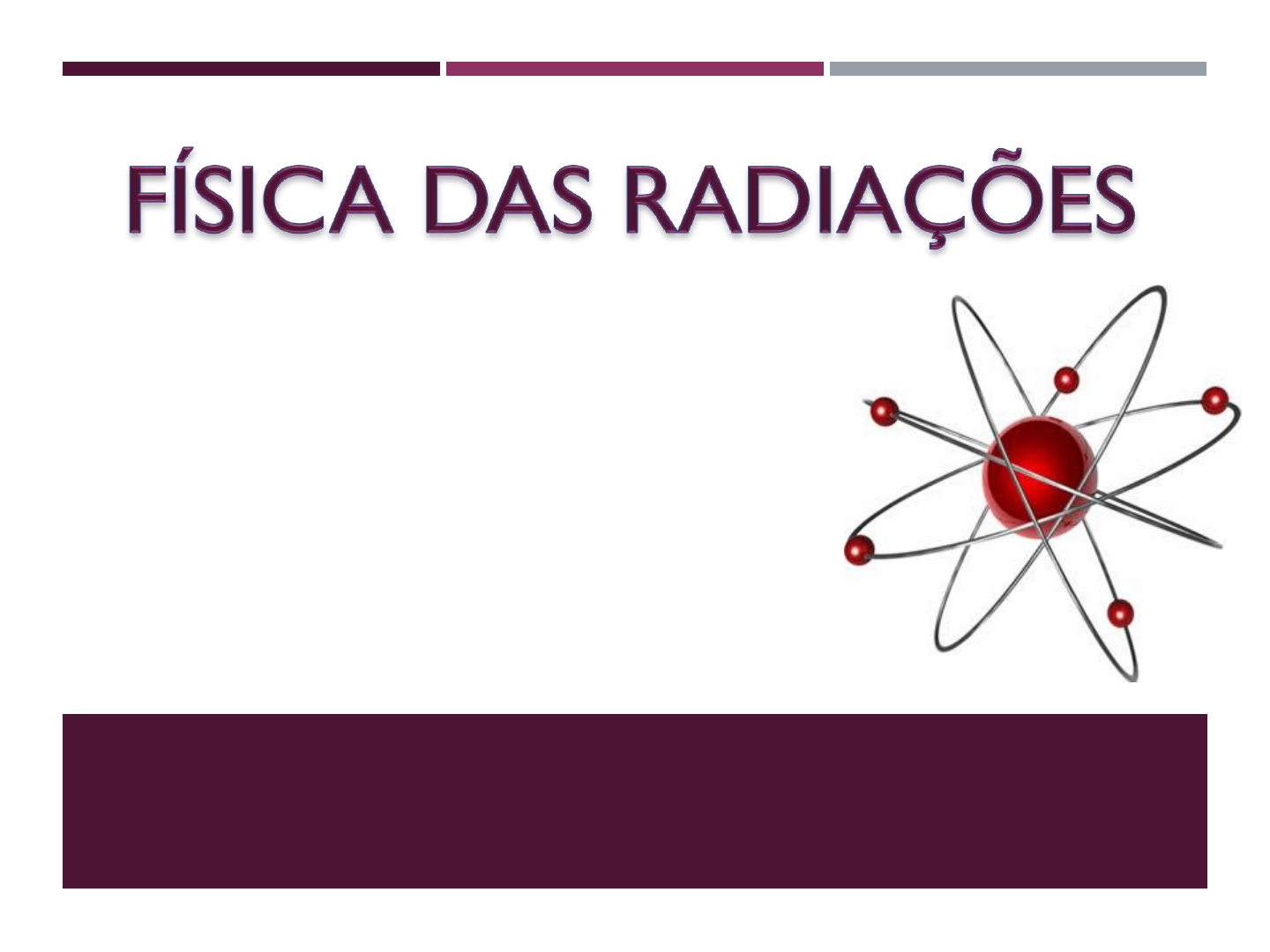 PROFA. CAROLINA ABREU 22 DE NOVEMBRO DE 2018 Radiação e suas Interações • Passando por materiais transparentes, a velocidade da luz (v) é reduzida a uma fração de c , sendo esse seu índice de refração (n), uma característica do material. Radiação eletromagnética (REM) Forma de energia que se propaga no espaço como onda, a enorme velocidade e em linha reta. • A velocidade da REM depende do meio em que se propaga. No vácuo a velocidade da luz (c) é igual a 299.792.458m/s n = c / v Radiação eletromagnética (REM) O movimento ondulatório da REM é caracterizado por parâmetros como comprimento de onda, frequência, velocidade e amplitude. Comprimento de onda (λ) é a distância linear entre dois máximos ou mínimos de onda. λ depende do meio onde a onda se propaga Radiação eletromagnética (REM) Algumas definições: • Freqüência (ν): número de oscilações do campo por segundo (Hertz (Hz) ou ciclo/s). • Velocidade (c): o produto da freqüência (ν) pelo comprimento de onda (λ)dá a velocidade da radiação no meio. c = ν . λ • Número de Onda (ν): número de ondas por centímetro é igual a 1/ λ (cm-1) • Energia (E): a energia de um fóton depende da frequência da radiação E = h . ν h = cte de Planck = 6,63 x 10 -34 J.s Um fóton de alta frequência (curto λ) é mais energético do que um de baixa frequência (longo λ) Radiação eletromagnética (REM) Algumas definições: • Quando a radiação electromagnética tem energia maior que a energia de ligação dos elétrons (maior que vários eV) ao átomo, essa radiação tem a capacidade de libertar o átomo desses elétrons. Essa radiação diz-se ionizante. • Se a energia não é suficiente para ionizar ela diz-se não ionizante. • Em Física, muitas vezes o comportamento de uma onda electromagnética é muito semelhante ao de uma partícula. Nessas circunstâncias dizemos que temos um fóton. Espectro eletromagnético • Arranjo ordenado das radiações conforme seu comprimento de onda. “Sempre que uma solução for colorida seu λ estará entre 400 e 700 nm” Espectro eletromagnético Espectro eletromagnético "RADIAÇÃO” → Energia transmitida por ondas eletromagnéticas ou partículas subatômicas . O QUE É RADIAÇÃO? CLASSIFICAÇÃO CLASSIFICAÇÃO "RADIAÇÃO” → Energia transmitida por ondas eletromagnéticas ou partículas subatômicas . O QUE É RADIAÇÃO? Espectro Eletromagnético Interação da Radiação com a Matéria • A radiação ao interagir com a matéria perde parte ou toda a sua energia. À energia depositada na matéria (E) sob a forma de radiação por unidade de massa (m), chama-se Dose (D): A unidade de dose do sistema internacional (SI) é o J/Kg. Esta unidade é conhecida como Gray (1 Gy = 1J/Kg). Interação da Radiação com a Matéria • A radiação electromagnética ionizante pode interagir com a matéria de três formas diferentes: • Efeito Fotoelétrico; • Efeito Compton; • Produção de Pares; Interação da Radiação com a Matéria • Efeito Fotoelétrico: - O fóton cede toda a sua energia (E) a um elétron do átomo. - Parte da energia é utilizada para libertar o elétron (EL). - O resto da energia o elétron conserva sob a forma de energia cinética (EC) - Em suma, o fóton foi completamente absorvido e um elétron foi absorvido localmente depois de uma série de colisões. Efeito Fotoelétrico Interação da Radiação com a Matéria Efeito Fotoelétrico Interação da Radiação com a Matéria Raio X Característico Interação da Radiação com a Matéria • Efeito Compton: -O fóton colide com um elétron atômico mais externo e segue segundo uma nova direção com menor energia. - A energia perdida pelo fóton é recebida pelo elétron sob a forma de energia cinética. - É como se fosse uma colisão entre duas partículas. - Uma diferença importante entre o efeito de Compton e o fotoelétrico é que no primeiro o fóton não desaparece. É desviado mas não é absorvido. Interação da Radiação com a Matéria Efeito Compton Interação da Radiação com a Matéria • Produção de Pares: - Como um fóton é uma onda electromagnética, quando passa perto de um átomo, é perturbado pela presença das cargas elétricas dos elétrons e prótons. - Essa perturbação pode iniciar uma transformação surpreendente. - O fóton desaparece e transforma toda a sua energia em matéria e energia cinética. - A matéria assim obtida é um par elétron-pósitron. - O excesso de energia que ele porventura tiver será dividido igualmente pelas duas partículas. - Assim que um pósitron reencontra um elétron os dois aniquilam-se, desaparecendo, e fazendo surgir dois fótons que se deslocam segundo a mesma direção mas em sentido contrário. Interação da Radiação com a Matéria Produção de Pares Probabilidade de Interação Interação da Radiação com a Matéria Probabilidade de Interação Interação da Radiação com a Matéria ATENUAÇÃO DOS FÓTONS NA MATÉRIA PODER DE PENETRAÇÃO DA RADIAÇÃO Descreve o potencial de penetração em um meio material. PODER DE PENETRAÇÃO DA RADIAÇÃO Atenuação dos fótons na matéria: Radiação beta (β): trata-se de elétrons dotados de alta energia emitidos de núcleos atômicos instáveis em um processo denominado de emissão beta. → Conversão nuclear de um próton em um nêutron, um elétron e um neutrino INTERAÇÃO DA RADIAÇÃO MEDIDAS MEDIDAS Radiação Eletromagnética e o Corpo Humano Radiação Eletromagnética e o Corpo Humano ▪ Essa equação foi proposta por Einstein, que se baseou no conceito de quantização introduzido por Max Planck. Radiação Eletromagnética e o Corpo Humano ▪ Podemos agora definir intensidade de radiação eletromagnética monoenergética (monocromática), como o número de fótons N, multiplicado pela energia de cada fóton, por unidade de área e tempo. Radiação Eletromagnética e o Corpo Humano ▪ Podemos agora defini