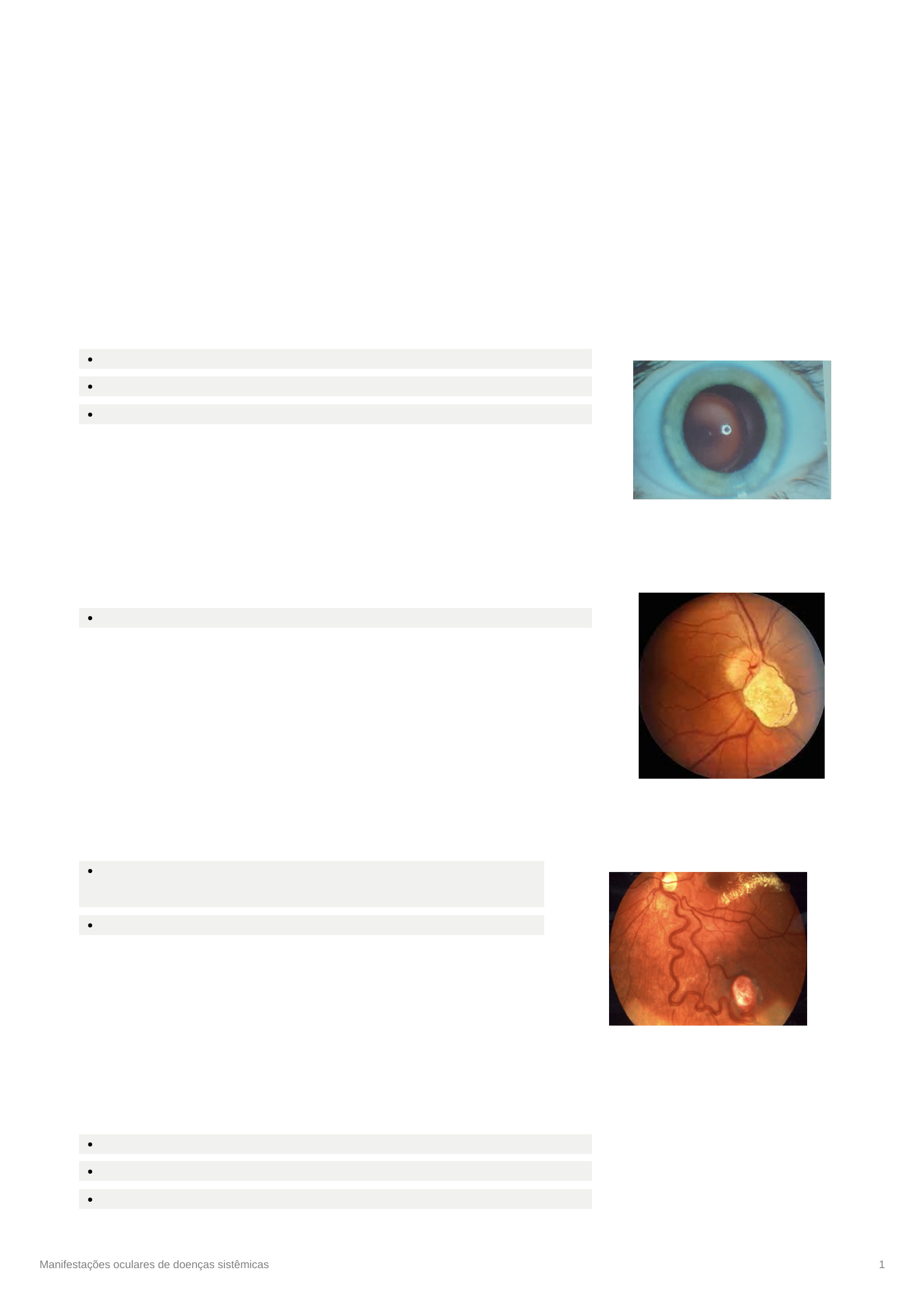 Manifestações oculares de doenças sistêmicas 1 Manifestações oculares de doenças sistêmicas Objetivo Reconhecer pacientes que necessitam de avaliação oftalmológica mesmo se assintomáticos. Importância → acesso à microcirculação e SNC. Fazer FO. Sd. Marfan Alta estatura, membros longos, aracnodactilia, peito escavado e dissecção de aorta. Subluxação do cristlino. Predisposição ao glaucoma. Alta incidência de miopia axial → descolamento de retina. Esclerose tuberosa Autossômico dominante. Retardo mental, epilepsia e adenoma sebáceo. Astrocitomas de retina ou de NO Sd. de Von Hippel-Lindau Hemangioblastoma de retina Aparece entre a 2-3° década de vida e causa BAV. Hemangioblastoma de ME ou cerebelo Tumores, como carcinoma renal ou feocromocitoma, cistos em rins, pâncreas, fígado, ovários, pulmões, policitemia. Anemia falciforme Oclusão de aa. ou vv. Isquemia retiniana Neovascularização da retina (glaucoma neovascular, hemorragia vítrea) Manifestações oculares de doenças sistêmicas 2 Sd. de Sturge-Weber: facomatoses Hemangiomas em pele e meninges. Glaucoma congênito pode estar presente no mesmo lado do nevus flameus, principalmente se a lesão da pele afeta a pálpebra superior Também pode desenvolver hemangioma da episclera ou de corpo ciliar Zika, dengue e chikungunya Anormalidades oculares em lactentes clinicamente diagnosticado com microcefalia relacionada ao zika: Alterações grosseiras da pigmentação macular Atrofia corioretiniana macular Hipoplasia do NO Aumento da escavação Zika → alta inflamação, atrofia retiniana Microangiopatia do HIV Presença de exsudatos algodonosos em toda a retina = isquemia retiniana. Hipoplasia e atrofia corioretiniana Alterações da pigmentação macular, hipoplasia e atrofia corioretiniana Manifestações oculares de doenças sistêmicas 3 Associação com CMV → retina “queijo com ketchup”. Rosácea Eritema facial e formação de pústulas, pápulas e telangiectasias na fase inflamatória. Blefaroconjuntivite, meibomite (inflamação das glândulas de Meibômio localizadas nas pálpebras) e telangiectasias na margem palpebral Hordéolos (infecção bacteriana das glândulas sebáceas e sudoríparas, localizadas nas pálpebras) recorrentes e calázio (processo não infeccioso por oclusão da glândula meibomiana) são frequentes Eritema multiforme Máculas que evoluem para vesículas e úlceras autolimitadas. Conjuntivite bilateral com lesões (crostas) nas pálpebras; leva à: Cicatrização com formação de simbléfaro e queratinização Aderências por conta de alta inflamação na episclera Relação com Stephen-Johnson. Doença de Behçet Pan-uveíte com hipópio Retinite, vitreíte e fenômenos vaso-oclusivos decorrentes de periflebite Manifestações oculares de doenças sistêmicas 4 Xeroderma pigmentoso Aumento da sensibilidade cutânea à luz solar com incapacidade de recuperação celular ao dano causado pelos raios UV e surgimento de lesões neoplásicas malignas. Ceratoconjuntivite seca Deformidades palpebrais com ceratite de exposição Neoplasias conjuntivais (CEC) Colagenoses e vasculites AR → ceratoconjuntivite seca, esclerite, ceratite e uveíte AIJ → uveíte bilateral assintomática Esclerodermia → olho seco e cicatrização palpebral Granulomatose de Wegner → conjuntivite, esclerite, uveíte anterior e vasculite retiniana LES → esclerite, olho seco e vasculite retiniana Sd. Sjogren Doença sistêmica inflamatória crônica que afeta, principalmente, gll. salivares e lacrimais → xeroftalmia e xerostomia. Doença primária ou associadas a outras doenças autoimunes (AR, LES, graves). Dx com teste de Schimer (fluoresceína) e rosa bengala → tem tempo de quebra de filme lacrimal diminuído. Orbitopatia de Graves Doença autoimune com acometimento orbitário, que causa inflamação de todos os tecidos da órbita. 90% com acometimento sistêmico. SINTOMAS: Retração palpebral Exoftalmia “Escleroshow” - exposição da esclera inferior Estrabismo Neurite compressiva Hiperemia ou não Compressão da a. central da retina. Retinopatia hipertensiva Elevação da PA aguda geralmente provoca vasoconstrição reversível nos vasos sanguíneos da retina, e crise hipertensiva pode causar edema do DO. Hipertensão mais grave ou prolongada leva a alterações vasculares exsudativas como consequência de lesão endotelial e necrose. Outras mudanças (p. ex., o espessamento da parede das arteríolas, nicking arteriovenosa), normalmente, requerem anos de PA elevada para se desenvolver. Tabagismo complica os efeitos adversos da retinopatia hipertensiva. Se a HAS se mantem de forma crônica, ocorrem anormalidades arterioloscleróticas na parede: Manifestações oculares de doenças sistêmicas 5 1. Espessamento da camada muscular e elástica 2. Depósito de material hialino e colágeno a longo prazo, resultando em artérias em fio de cobre e fio de prata Se a HAS é severa e de curta evolução, poderá apresentar uma retinopatia hipertensiva sem sinais de esclerose arteriolar. Se a HAS é muito severa e se instala de forma aguda (HAS maligna ou acelerada), observaremos uma coroidopatia hipertensiva. Os sintomas geralmente só se desenvolvem no final da doença e incluem visão turva ou defeitos do campo visual. Nas fases iniciais, FO identifica constrição arteriolar, com uma diminuição na relação entre a largura das arteríolas retinianas e das vênulas da retina. Se mal controlada, a HAS crônica pode causar: Estreitamento do calibre arterial permanente Cruzamentos arteriovenosos patológicos (entalhe arteriovenoso) Arteriosclerose com mudanças moderadas da parede vascular (fios de cobre) para mais hiperplasia da parede vascular e espessamento (fiação de prata) Por vezes, ocorre oclusão vascular total. Entalhe arteriovenoso é um dos principais fatores de predisposição para o desenvolvimento de uma oclusão do ramo da v. da retina. Se a doença aguda é grave, podem 