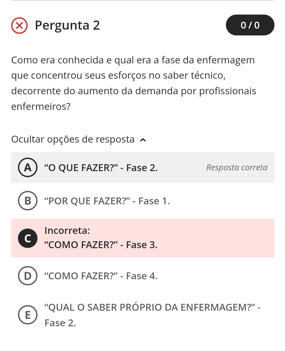 A) 'O QUE FAZER?' - Fase 2. B) 'POR QUE FAZER?' - Fase 1. C) 'COMO FAZER?' - Fase 3. D) 'COMO FAZER?' - Fase 4. E) 'QUAL o SABER PRÓPRIO DA ENFERMAGEM?' - Fase 2.