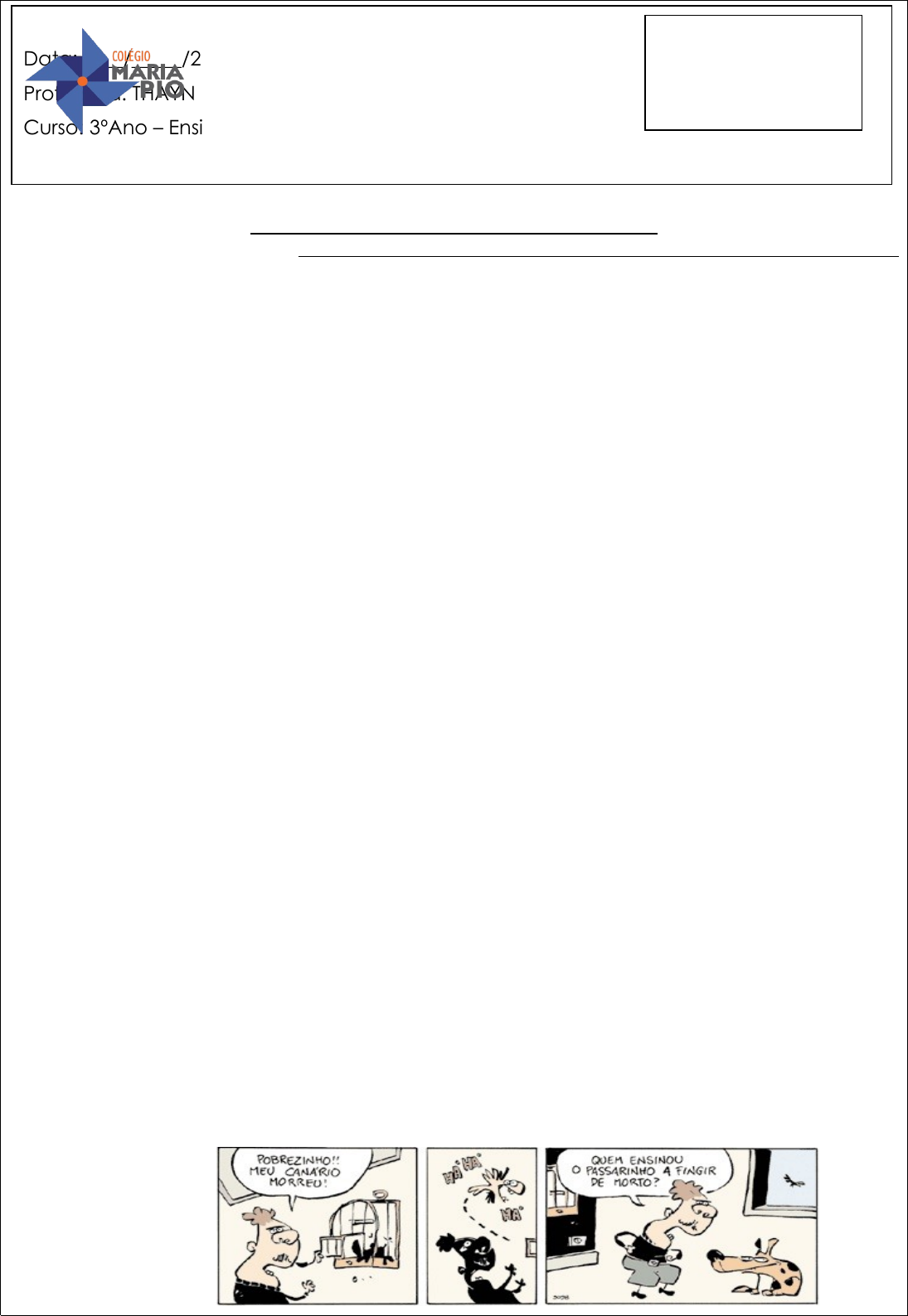 Colégio Maria Pio. Data: ____/_____/2023. Professora: THAYNÁ RAMOS Curso: 3ºAno – Ensino Fundamental. Aluno (a): ____________________________________________________ Leitura = _______ Prova = _______ Média _______ Prova de Língua Portuguesa – 2º BIMESTRE Ser criança é diversão, alegria e paz. Que toda sua vida seja assim. LÍNGUA PORTUGUESA 1)Leia o texto e responda .(1,0) Resgate da autoconfiança Sem querer, Luiz Lataria fez um gol contra na partida de rodobol. Os colegas do seu time ficaram muito brabos com ele! – Estamos quase perdendo o campeonato, por sua culpa! – disse Chico Antena no final do jogo. Luiz Lataria assumiu sua forma de carro e foi para sua garagem, envergonhado e solitário. Pensou até em não jogar mais! No dia seguinte, arrumou suas coisas para ir embora. Mas o goleiro do time veio conversar com ele. – Quero pedir desculpas pelo nosso time. Colocaram a culpa em você. Mas errar não é o fim – disse o goleiro Carlos Rampa. Luiz Lataria nem queria saber de voltar, mas o goleiro insistiu tanto que convenceu a fazer mais um treino de rodobol. – Não ligue para os colegas maldosos. O importante é se concentrar no jogo – disse o goleiro Carlos Rampa. Na final, Luiz Lataria jogou tão bem que fez o gol da vitória! Tudo porque um grande amigo o ajudou a recuperar sua autoconfiança. Questões a)Qual é o título do texto ? ________________________________________________________________________ b)Por que os colegas de Luiz ficaram bravos com eles? ________________________________________________________________________ 2)Escreva outras palavras que rimem com: (1,0) a) Aninha – amarelinha ______________________________________________________ b) Marcelo – castelo _________________________________________________________ c) Renato – rato ______________________________________________________________ 3) Geralmente, o grau diminutivo é usado para indicar o tamanho pequeno de um ser ou de um objeto. Entretanto, o diminutivo pode ser usado, também, para expressar um sentimento. A palavra “pobrezinho”, no primeiro quadrinho, foi utilizada no sentido de:( 1,0 ) a) agradecimento. b) desgosto. c) compaixão. d) exaltação. 4) Qual das palavras abaixo não é um diminutivo da palavra MALA? ( 1,0 ) a) malinha b) maleta. c) malote. d) malona. 5) Complete as frases com adjetivos pátrios: A) Quem nasce em Portugal é? __________________________________________ B) Quem nasce no Brasil é? __________________________________________ C) Quem nasce em São Paulo é? __________________________________________ D) Quem nasce no Canadá é? __________________________________________ E) Quem nasce no Japão é? __________________________________________ 6) Qual palavra abaixo está no seu grau aumentativo? a) Sabão. b) Bração. c) Feijão. d) Canção. 7) Leia a tirinha e resolva a questão . Quais palavras no texto estão no grau diminutivo? ______________________________________________________________________________ 8) Complete as frases escrevendo qualidades para os substantivos. a) Hoje a tempestade está ______________. (Substantivo) (Adjetivo) b) O vestido de mamãe é _______________. (Substantivo) (Adjetivo) c)O quarto ficou ________________. (Substantivo) (Adjetivo) 09)Escreva o diminutivo e aumentativo das palavras .(1,0) 10) Leia a receita abaixo e responda . FAZENDO UM BOLO INGREDIENTES: 2 xícaras de açúcar; 3 xícaras de farinha de trigo; 4 colheres de margarina; 3 ovos; 1 xícara de leite; 1 colher bem cheia de fermento em pó. MODO DE PREPARO: Bata as claras em neve e reserve. Misture as gemas, a margarina e o açúcar até obter uma massa homogênea. Acrescente o leite e a farinha de trigo aos poucos, sem parar de bater. Por último, adicione as claras em neve e o fermento. Depois, asse em forno médio 180 °C e sirva-se à vontade. Responda: O gênero do texto é: a) manual de instrução. b) diário pessoal. c) receita culinária. d) anúncio publicitário. Colégio Maria Pio. Data: ____/_____/2023. Professora: THAYNÁ RAMOS Curso: 3ºAno – Ensino Fundamental. Aluno (a): ____________________________________________________ Tabuada = _______ Prova = _______ Média _______ Prova de Matemática – 2º BIMESTRE Ser criança é diversão, alegria e paz. Que toda sua vida seja assim. 1) Paulo precisa montar 4 bicicletas. De quantas rodas ele precisará? A) ( ) 4 rodas. B) ( ) 8 rodas. C) ( ) 12 rodas. D) ( ) 6 rodas. 2) Resolva as operações . 3)Observe o relógio abaixo e responda : 4)Sávio deve tomar um remédio a cada 6 horas. Sabendo que ele tomou o medicamento às 3:00 horas da tarde, qual o horário Sávio tomará novamente? a) 12:00 horas da noite. b) 8:00 horas da noite c) 9:00 horas da noite. d) 5:00 horas da tarde. 5) Observe o relógio da casa de Marina: Qual o horário o relógio está marcando? a) 10:10 b) 10:02 c) 10:30 d) 10:50 6) João e Gustavo são amigos. Eles marcaram de se encontrar na sorveteria de sua cidade às 4:00 horas da tarde. Sabendo que eles passaram 2 horas no local marcado, qual o horário que eles foram embora? a) 10:00 horas. b) 9:00 horas. c) 8:00 horas d) 6:00 horas. 7) A professora de Lucas montou uma tabela na sala de aula com os dias e as provas que irão ocorrer. Observe: Em qual dia da semana acontecerá as provas de História e Geografia? a) Segunda-feira. b) Terça-feira. c) Quarta-feira. d) Quinta-feira. 8) Existem vários instrumentos criados pelo homem para marcar a passagem do tempo. Qual dos instrumentos abaixo é o mais antigo? a) Relógio 1. b) Relógio 2. c) Relógio 3. d) Relógio 4. 9) Observe a tabela abaixo: Qual é o 4º dia da semana? a) Domingo. b) Sábado. c) Quarta-feira. d) Quinta-feira. 10)Resolva as contas de adição . Colégio Maria Pio. Data: ____/_____/2023. Professora: THAYNÁ RAMOS Curso: 3ºAno – Ensino Fundamental. Aluno (a): ____________________________________________________ Trabalho = _______ Prova = _______ Média _______ Prova de Ciências – 2º BIMES