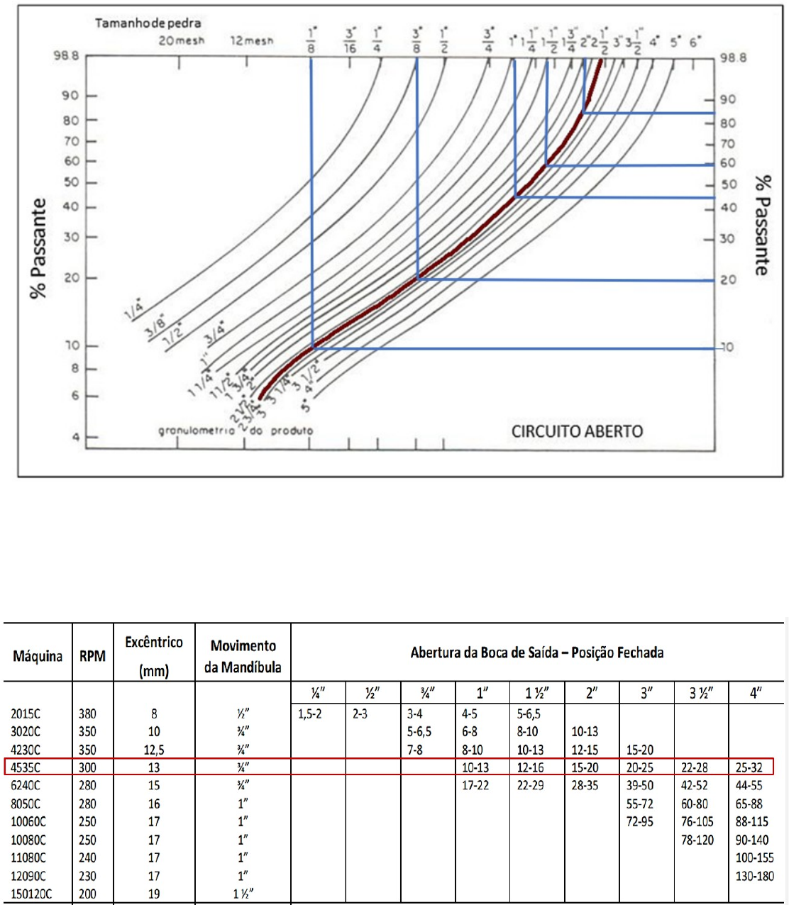 Gráfico de distribuição granulométrica de Britadores de mandíbula Tabela de modelo dos britadores de mandíbulas Fator A Fator B Fator C Fator D Gráfico Capacidade da peneira Grafico fator f1 peneira 1 Fator f2 Fatores de f3 a f8 Tabela de Área aberta da tela peneira 1 Tabela Modelo da peneira 1