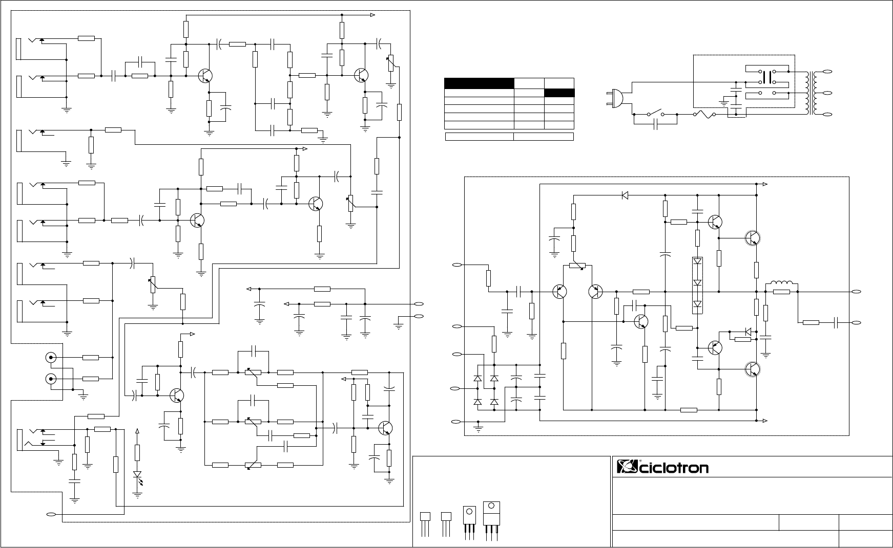 ARQUIVO:..\POPLINE300_V1.DSN FOLHA: 01/01CIRCUITO: PRÉ / POWER / FONTE I N D Ú S T R I A E L E T R Ô N I C A L T D A. 4-29 POP LINE 300 O ajuste de 0V deverá ser feito nos terminais de saída, estando o aparelho sem carga e sem sinal de entrada, para aproximadamente 0Vdc. * A corrente quiescente deve ser medida sobre um dos resistores de 0.47Rx5W, estando o aparelho com carga e sem sinal de entrada. BD 140 VISTA FRONTAL BC 549 BC 556 Todos resistores são de 1/4 W e todos capacitores eletrolíticos são de 25V, exceto aqueles com indicação. BC 337 PL573 BD 139 10 K B C 5 49 22 uF 22K 5 6 p F 68K 47 0K 68 K 1uF 33 0R 68K470K GUITAR HIGH GUITAR LOW 100pF 1K5 1K 10 K 47 K 82 K 27 K 15K 68K B C 5 49 10 K 33 0R 1uF 5 6 p F 68 K 2 2 u F V O LU M E 10 0K A 56 pF 4K7 5 6 p F 10uF 47K 33K 8K2 47 K B C 5 49 33 0R 10 K 3 3 0R 8K2MIC2 10 0K A 10uF10 K 10uF MIC1 2 M 210K 68 0K V O LU M E B C 5 49 33 K 68 K 68 K VIDEOKE SCORE 47K 22 K KEY R 10KKEY L 10K CD/MD L CD/MD R 270K 270K 10uF V O LU M E 10 0K A 10 K 1K5 2K7 6K8 1K5 15K 1K5 100KB 100KB 1K10K 10K MID 22K 10K 100KB 6K8 HIGH LOW 5 6 0R 10uF 2 2 p F B C 5 49 56 K 1 u F 1 0 u F 1K 6K 8 MIX MIC / LINE OUT B C 5 49 10uF 2 2 u F 10uF 5 6 0R 3, 3p F 2 M 2 10 K 68 0K 100R 47 K POWER OUT 220K 47 K 1K 1K8 1Kx1W 10 0u F 1 0 0 uF 10 0K 10 0u F +VCC GND 4 K 7 O N TIP 41C TPOPLINE300 220V - 0,8A 110V - 1,0A 12 K 0. 47 R x5 W 8 OHMS 10 0K x5 0V 47R 2 K 2 2 2 00 uF x 50 V 470pF x100V 1K x2 W AC 2 2 00 uF x 50 V 10 0K x5 0V 39K TW B C 63 9 10Rx1W 1 2 0R x1 /2 W 6 8 0R 12 K 2 7 0R x1 /2 W B D 14 0 470R 1K 2 T IP 41 C 4 x 1N4001 100pF 10 0K 1 0 0 uF x4 0V 2 x B C 55 6 AC 1N4001 2.2uFx100V 33 K T IP 41 C 100Rx1/2W 1 0 0 pF B D 13 9 A.F. 4 7 u F x4 0V 1 2 0R x1 /2 W 10 R x1 W 33 R GND 220K 4 7 0p F x1 00 V 10 0u F x4 0V 4 7 u F 47 K x5 0V 1R PL589 1K 3K9 x5 0V 33Rx5W 3x 1N 40 01AJUSTE OV + VCC 390R 19AWG 0. 47 R x5 W POWER IN BC 327 B C 63 9 47 0K 1K 10K 1K 1N4001 TENSÃO DO TRAFO + 32.1 Vdc POT. MÁX. + 38.8 Vdc CORRENTE QUIESCENTE 6 mA ( 3 mV DC)* TENSÃO DA FONTE (+B) 28.6 Vac REPOUSO TENSÃO DA FONTE (-B) - 38.8 Vdc - 32.1 Vdc 220V REDE 110V PLA007 2x 2K2x500V GND 10Kx1000V AC AC + 17.5 Vdc + 21.2 Vdc + 20.5 VdcTENSÃO DA FONTE (+B2) TENSÃO DA FONTE (+B1) + 17.8 Vdc DATA:17/06/2003 CBE B C EBCE + B1 + B2 + B1 + B2 + B2 + B1 +B1 CBE + B - B + + + + + + + + + + + + + + + + + + + + ++ +