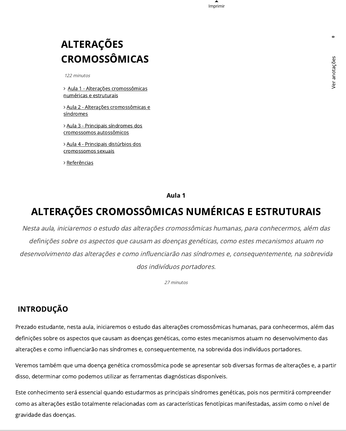 Imprimir INTRODUÇÃO Prezado estudante, nesta aula, iniciaremos o estudo das alterações cromossômicas humanas, para conhecermos, além das de�nições sobre os aspectos que causam as doenças genéticas, como estes mecanismos atuam no desenvolvimento das alterações e como in�uenciarão nas síndromes e, consequentemente, na sobrevida dos indivíduos portadores. Veremos também que uma doença genética cromossômica pode se apresentar sob diversas formas de alterações e, a partir disso, determinar como podemos utilizar as ferramentas diagnósticas disponíveis. Este conhecimento será essencial quando estudarmos as principais síndromes genéticas, pois nos permitirá compreender como as alterações estão totalmente relacionadas com as características fenotípicas manifestadas, assim como o nível de gravidade das doenças. Aula 1 ALTERAÇÕES CROMOSSÔMICAS NUMÉRICAS E ESTRUTURAIS Nesta aula, iniciaremos o estudo das alterações cromossômicas humanas, para conhecermos, além das de�nições sobre os aspectos que causam as doenças genéticas, como estes mecanismos atuam no desenvolvimento das alterações e como in�uenciarão nas síndromes e, consequentemente, na sobrevida dos indivíduos portadores. 27 minutos ALTERAÇÕES CROMOSSÔMICAS Aula 1 - Alterações cromossômicas numéricas e estruturais Aula 2 - Alterações cromossômicas e síndromes Aula 3 - Principais síndromes dos cromossomos autossômicos Aula 4 - Principais distúrbios dos cromossomos sexuais Referências 122 minutos 0 V e r a n o ta çõ e s ALTERAÇÕES CROMOSSÔMICAS: FUNDAMENTOS E DEFINIÇÕES As alterações cromossômicas podem ser do tipo numéricas, em que são observadas alterações quanto ao número de cromossomos, ou do tipo estruturais, em que temos modi�cações quanto às estrututas cromossômicas, podendo haver também modi�cações no número deles. O genoma humano é classi�cado como diploide (di = “dois”; polid = “grupo”) por possuir dois conjuntos cromossômicos (2n): um advindo da mãe, e o outro do pai, cada um com 23 cromossomos. Lembrando que os gametas humanos possuem apenas 1 conjunto cromossômico (n), chamado haploide. Quando observamos a quantidade correta de conjuntos cromossômicos de qualquer ser vivo, dizemos que ele é euploide; quando esta quantidade de conjuntos é alterada, temos euploidias aberrantes ou poliploidias, que são os casos dos indivíduos triploides (3n) e tetraploides (4n). As poliploidias humanas não são compatíveis com a sobrevivência, e estima-se que a triploidia seja responsável por 15% dos abortamentos por alterações cromossômicas que ocorrem nos dois primeiros trimestres de gestação. Os bebês triploides que sobrevivem durante a gestação vão a óbito logo após o nascimento. A tetraploidia é ainda mais rara e letal. As aneuploidias ocorrem quando temos um único cromossomo a menos ou a mais. Podem acontecer com os cromossomos autossômicos e com os sexuais. Na ausência de um cromossomo, denomina-se monossomia, e são quase sempre incompatíveis com a sobrevivência após o nascimento. O caso mais comum de monossomia é a Síndrome de Turner (45, X), em que temos apenas uma cópia do cromossomo sexual X. Nas trissomias, temos uma cópia a mais de algum dos cromossomos, e são mais frequentemente encontradas em nascidos vivos. São exemplos: a Síndrome de Down (47, X__ +21) e a Síndrome de Edwards (47, X__ +18). O mosaicismo ocorre quando temos dois ou mais tipos de cariótipos em um mesmo indivíduo, sendo originados de um mesmo zigoto. Isso ocorre quando temos alterações cromossômicas nas mitoses que ocorrem nas primeiras divisões celulares do embrião. Quanto mais cedo estas alterações ocorrerem no desenvolvimento embrionário, maior será a gravidade das malformações, já que um maior número de células do indivíduo será atingido pela alteração. A dissomia uniparental ocorre quando um par de cromossomos homólogos é oriundo do mesmo genitor (paterno ou materno). As alterações estruturais são rearranjos que acontecem nos cromossomos, que podem ser classi�cados em balanceados ou não-balanceados. Um rearranjo ocorre por uma ruptura em determinada localização cromossômica, com subsequente ligação com combinação anormal. O rearranjo balanceado ocorre quando não há perda ou adição de novos fragmentos de DNA, e o rearranjo não- balanceado, quando há deleções ou duplicações. Os rearranjos também podem ser classi�cados em estáveis ou instáveis, sendo estáveis quando a estrutura cromossômica permanece igual com a divisão celular, e ele ocorre quando os cromossomos continuam apresentando dois telômeros e um centrômero ativo. São instáveis quando as células �lhas sempre apresentam conjunto cromossômico diferente da célula mãe, devido aos problemas de homologia que levam ao pareamento e à divisão incorretos dos cromossomos. ALTERAÇÕES CROMOSSÔMICAS: ENTENDENDO COMO ACONTECEM 0 V e r a n o ta çõ e s Alterações cromossômicas numéricas As triploidias surgem, na maioria das vezes, por fecundações de dois espermatozoides em um único ovócito; também podem acontecer pela fusão de um ovócito a um corpúsculo polar, ou então, por anomalias na meiose, que geram ovócitos ou espermatozoides diploides. Neste último caso, em meiose I podemos ter a migração dos cromossomos homólogos para o mesmo polo, ou em meiose II, quando não há a separação das cromátides irmãs (Figura 1). Este processo é denominado não-disjunção e, no caso das triploidias, deve ocorrer em todo o conjunto cromossômico. As tetraploidias podem ocorrer por não-disjunção das cromátides irmãs em todo o conjunto cromossômico em mitose nas primeiras divisões celulares do embrião (podendo gerar indivíduos mosaicos), ou então pela fusão de dois zigotos diploides. Figura 1 | Não-disjunção em meiose Fonte: adaptada de Jorde, Carey e Bamshad (2017, p. 109). As aneuploidias