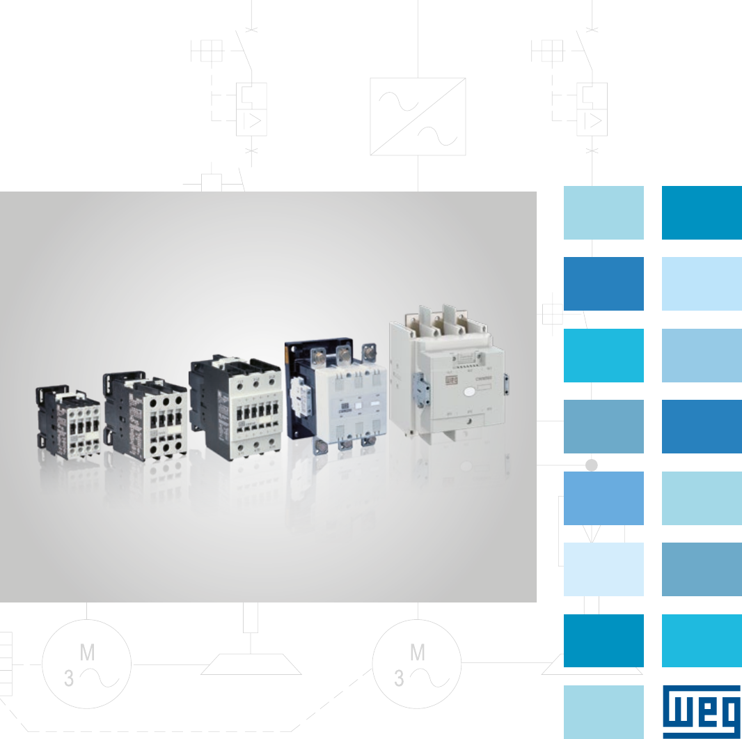 Motores | Automação | Energia | Transmissão & Distribuição | Tintas Automação Contatores - Linha CWM www.weg.net Contactores Compactos CWC02 Sumário Contatores CWM9...40, CAWM4 4 Dados Técnicos 20 Dimensões (mm) 46 Contatores - Linha CWM 6Contatores CWM50...105 8Contatores CWM112...300 10Contatores CWM450 / CWM560 11Contatores CWM400 / CWM500 / CWM630 / CWM800 12Contatores de Potência 13Contatores Auxiliares 14Acessórios www.weg.net Contatores - Linha CWM 4 Contatores CWM9...40, CAWM4 6 5 8 5 5 6 5 8 7 7 7 7 1 1 2 2 3 3 4 4 4 9 9 9 1 - Contatores CWM9...18 ou CAWM4 2 - Contator CWM25 3 - Contatores CWM32/40 4 - Blocos de contatos auxiliares frontais BCXMF 5 - Blocos de contatos auxiliares laterais BCXML 6 - Blocos de contatos auxiliares laterais BCXMRL 7 - Blocos de intertravamento mecânico BLIM 8 - Barramentos para conexões rápidas 9 - Blocos supressores de surto BAM 8 8 8 8 www.weg.net Contatores - Linha CWM 5 Ie máx. (Ue ≤440 V) Ie = Ith (Ue ≤690 V) θ ≤55 °C Potência nominal de emprego em AC-31) Motor trifásico - IV polos - 60 Hz - 1.800 rpm Contatos auxiliares por contator Bloco de contato auxiliar fornecido separadamente Referência para completar com a tensão de comando Peso5) kg AC-3 AC-1 220 V 230 V kW / cv 380 V 400 V kW / cv 415 V 440 V kW / cv 500 V kW / cv 660 V 690 V kW / cv 4 3 NA 2 1 NF BCXMF10 BCXMF01 A A 9 25 2,2 / 3 3,7 / 5 4,5 / 6 4,5 / 6 5,5 / 7,5 1 - Integrado - CWM9-10-30♦ 0,360 - 1 - Integrado CWM9-01-30♦ 1 1 Integrado 1 CWM9-11-30♦ 2 2 1 2 CWM9-22-30♦ 12 25 3 / 4 5,5 / 7,5 5,5 / 7,5 5,5 / 7,5 7,5 / 10 1 - Integrado - CWM12-10-30♦ 0,360 - 1 - Integrado CWM12-01-30♦ 1 1 Integrado 1 CWM12-11-30♦ 2 2 1 2 CWM12-22-30♦ 18 32 4,5 / 6 7,5 / 10 9,2 / 12,5 9,2 / 12,5 11 / 15 1 - Integrado - CWM18-10-30♦ 0,360 - 1 - Integrado CWM18-01-30♦ 1 1 Integrado 1 CWM18-11-30♦ 2 2 1 2 CWM18-22-30♦ 25 45 5,5 / 7,5 11 / 15 11 / 15 11 / 15 11 / 15 - - - - CWM25-00-30♦ 0,330 1 - 1 - CWM25-10-30♦ - 1 - 1 CWM25-01-30♦ 1 1 1 1 CWM25-11-30♦ 2 2 2 2 CWM25-22-30♦ 32 60 9,2 / 12,5 15 / 20 15 / 20 15 / 20 18,5 / 25 - - - - CWM32-00-30♦ 0,620 1 - 1 - CWM32-10-30♦ - 1 - 1 CWM32-01-30♦ 1 1 1 1 CWM32-11-30♦ 2 2 2 2 CWM32-22-30♦ 40 60 11 / 15 18,5 / 25 22 / 30 22 / 30 22 / 30 - - - - CWM40-00-30♦ 0,6501 1 1 1 CWM40-11-30♦ 2 2 2 2 CWM40-22-30♦ Contatores de Potência 9 A a 40 A (AC-3) J Fixação por parafusos ou diretamente em trilho DIN 35 mm J Protegido contra corpos estranhos e toques J Contatos auxiliares integrados até 18 A J Acessórios para montagem frontal e lateral J Permite montagem direta aos relés de sobrecarga RW J Mesmo dimensional até 25 A J Possibilidade de acrescentar: 4 contatos auxiliares (CWM9...25) e 6 contatos auxiliares (CWM32/40) Substitua “♦” pelo código da tensão de comando2). Corrente Alternada Tripolares de 9 A a 40 A (AC-3) Corrente Contínua Código V04 V06 V10 V11 V15 V18 V26 V30 V32 V37 V41 V42 V45 V46 V47 V50 V (50 Hz) 20 24 42 48 95 110 190 208 220 240 325 380 - 400 415 440 V (60 Hz) 24 28 48 56 110 120 220 240 255 277 380 440 400 460 480 510 Código D02 D07 D13 D23 D25 D33 D34 D35 D36 V (50/60 Hz) 24 48 110 220 240 380 400 415 440 Código (CWM9...25) C02 C03 C07 C12 C13 C15 V cc 12 24 48 110 125 220 Código (CWM32/40) C34 C37 C40 C44 V cc 24...28 42...50 110...130 208...240 Notas: 1) Valores orientativos; 2) Outras tensões sob consulta; 3) Blocos de contatos auxiliares e demais acessórios ver páginas 13 a 17; 4) Para maiores informações consulte a seção de Dados Técnicos; 5) Pesos para contatores com circuito de comando em corrente alternada. Para circuito de comando em corrente contínua acrescentar 0,260 kg aos modelos CWM9...25 e 0,020 kg aos modelos CWM32/40 em corrente alternada. www.weg.net Contatores - Linha CWM 6 Contatores CWM50...105 1 1 2 2 3 3 8 8 7 7 7 7 6 6 5 4 5 4 1 - Contatores CWM50...80 2 - Contatores CWM95/105 3 - Blocos de contatos auxiliares frontais BCXMF 4 - Blocos de contatos auxiliares laterais BCXML 5 - Blocos de contatos auxiliares laterais BCXMRL 6 - Blocos de intertravamento mecânico BLIM 7 - Barramentos para conexões rápidas 8 - Blocos supressores de surto BAM www.weg.net Contatores - Linha CWM 7 Contatores de Potência 50 A a 105 A (AC-3) J Fixação por parafusos ou diretamente em trilho DIN 35 mm J Protegido contra corpos estranhos e toques J Acessórios para montagem frontais e laterais J Permite montagem direta aos relés de sobrecarga RW J Sistema “Box” (grampo de conexão duplo) nos contatos principais, para conexão perfeita de condutores com seções diferentes J Possibilidade de até 8 contatos auxiliares Substitua “♦” pelo código da tensão de comando2). Corrente Alternada Tripolares de 50 A a 105 A (AC-3) Corrente Contínua Código V04 V06 V10 V11 V15 V18 V26 V30 V32 V37 V41 V42 V45 V46 V47 V50 V (50 Hz) 20 24 42 48 95 110 190 208 220 240 325 380 - 400 415 440 V (60 Hz) 24 28 48 56 110 120 220 240 255 277 380 440 400 460 480 510 Código D02 D07 D13 D23 D25 D33 D34 D35 D36 V (50/60 Hz) 24 48 110 220 240 380 400 415 440 Código C34 C37 C40 C44 V cc 24...28 42...50 110...130 208...240 Notas: 1) Valores orientativos; 2) Outras tensões sob consulta; 3) Blocos de contatos auxiliares e demais acessórios páginas 13 a 17; 4) Para maiores informações consulte a seção de Dados Técnicos; 5) Pesos para contatores com circuito de comando em corrente alternada. Para circuito de comando em corrente contínua acrescentar 0,050 kg. Ie máx. (Ue ≤440 V) Ie = Ith (Ue ≤690 V) θ ≤55 °C Potência nominal de emprego em AC-31) Motor trifásico - IV polos - 60 Hz - 1.800 rpm Contatos auxiliares por contator Bloco de contato auxiliar fornecido separadamente Referência para completar com a tensão de comando Peso5) kg AC-3 AC-1 220 V 230 V kW / cv 380 V 400 V kW / cv 415 V 440 V kW / cv 500 V kW / cv 660 V 690 V kW / cv 4 3 NA 2 1 NF BCXMF10 BCXMF01 A A 50 90 15 / 20 22 / 30 30 / 40 30 / 40 30 / 40 - - - - CWM50-00-30♦ 1,2051 