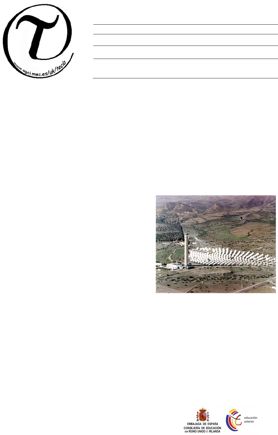 © Consejería de Educación en el Reino Unido e Irlanda - 1 - TECLA. REVISTA ELECTRÓNICA DE LA CONSEJERÍA DE EDUCACIÓN EN EL REINO UNIDO E IRLANDA Fecha 12 de mayo de 2006 NIPO: 651 – 05 – 081 - 9 Nivel B1 Intermedio Título: ENERGÍA SOLAR Autor: Manuel Balaguer Carmona. Asesor Técnico de la Consejería de Educación en el Reino Unido e Irlanda Antes de leer 1. Por grupos, decid qué ventajas tienen las llamadas energías alternativas, como la eólica, la solar y la de las mareas. 2. ¿Qué medidas concretas tomarías para mantener limpio nuestro planeta? Texto El Sol es una fuente de energía natural, limpia e inagotable. Cada año el sol vierte sobre la tierra cuatro veces más energía de la que necesitamos. El ser humano ha aprovechado su energía desde el principio de los tiempos, aunque siempre de forma elemental. Hoy en día las necesidades energéticas no son las mismas que en épocas anteriores. Es por ello que el hombre moderno intenta aprovechar esta energía de forma más eficiente. Con ese objeto se crearon los llamados módulos o placas de energía solar. Hay dos tipos de placas de energía solar: las térmicas y las fotovoltaicas. Las primeras sirven para generar calor y se usan para obtener agua caliente, calefacción e incluso refrigeración. Las segundas, las placas fotovoltaicas, sirven para obtener electricidad. La energía solar tiene, sin embargo, algunas desventajas: de un lado, no es una fuente energética estable, ya que el flujo energético oscila según las estaciones; de otro lado, y de momento, la instalación resulta cara y eso desanima a muchos consumidores. Actualmente la investigación se encamina a la mejora de la tecnología para la generación de energía solar termoeléctrica, gracias a la cual se puede generar electricidad a partir de un fluido calentado por el sol. Contra lo que se pudiera pensar, la energía solar cuenta con escasa implantación en España, a pesar de que nuestro país alberga en Tabernas (Almería) la planta de energía solar más grande de Europa. Sin embargo, las previsiones de futuro son esperanzadoras. Para 2010 se prevé que la instalación de placas térmicas haya aumentado desde los alrededor de 700.000 m2 actuales hasta los cerca de 5.000.000 de m2; se espera, así mismo, poder generar una potencia de 400MWp con la energía fotovoltaica y de 500MW gracias a las nuevas instalaciones termoeléctricas Planta solar de Tabernas, en Almería. TECLA. REVISTA ELECTRÓNICA DE LA CONSEJERÍA DE EDUCACIÓN EN REINO UNIDO E IRLANDA © Consejería de Educación en el Reino Unido e Irlanda - 2 - Comprensión del texto 3. Busca la respuesta correcta y discute con tus compañeros por qué la has elegido. 3.1 Con la energía solar se puede producir… a) Calor y electricidad solamente. b) Calor solamente. c) Calor, refrigeración y electricidad. 3.2. La energía solar… a) Tiene un flujo regular. b) No es constante: sufre variaciones. c) Es contaminante. 3.3. Se puede obtener electricidad… a) Sólo con las placas fotovoltaicas. b) Con las llamadas energías solar termoeléctrica y solar fotovoltaica. c) Con las placas térmicas. 3.4. España… a) Es un país muy avanzado en energía solar, ya que cuenta con la planta solar más grande de Europa. b) Tiene importantes planes de futuro para la implantación de energía solar. c) No usa la energía solar. 4. Resuelve este crucigrama HORIZONTALES 1. Nombre que recibe la energía que produce el viento. 3. Así se llama la energía que produce el sol. 5. Llamamos así a las energías que mantienen un flujo continuo, que se renuevan constantemente. 7. Lugar en que está instalada la planta de energía solar más grande de Europa. 9. Placa solar que sirve para obtener agua caliente y calefacción. VERTICALES 1. Que no se acaba nunca. 6. Al revés: a la energía que produce el mar se le llama energía mareomotriz o, más comúnmente, de las … 8. Al revés: planeta que influye en los flujos de las mareas. 1 2 3 4 5 6 7 8 9 1 2 3 4 5 6 7 8 9 TECLA. REVISTA ELECTRÓNICA DE LA CONSEJERÍA DE EDUCACIÓN EN REINO UNIDO E IRLANDA © Consejería de Educación en el Reino Unido e Irlanda - 3 - 5. Por parejas, haced hipótesis sobre lo que quieren decir estos modismos; luego, buscad en un diccionario su significado. 5.1. Ser un sol. 5.2. Arrimarse al sol que más calienta. 5.3. No dejar ni a sol ni a sombra. 5.4. Meter a alguien donde no vea el sol. 5.5. Trabajar de sol a sol (o de sol a sombra) 6. Fíjate en los párrafos segundo y tercero. Observarás que se utilizan ciertos operadores para distribuir la información: la primera, la segunda; de un lado, de otro... Escribe un texto sobre las ventajas y desventajas de la energía eólica utilizando los operadores del cuadro siguiente. De un lado… de otro lado… Por una parte… por otra… En primer lugar… en segundo… Puedes informarte sobre la energía eólica en: www.windpower.org/es/tour/ SOLUCIONES 3.1 Con la energía solar se puede producir. c) Calor, refrigeración y electricidad. 3.2. La energía solar b) No es constante: sufre variaciones. 3.3. Se puede obtener electricidad b) Con las llamadas energías solar termoeléctrica y solar fotovoltaica. 3.4. España. b) Tiene importantes planes de futuro para la implantación de energía solar. 4. Resuelve este crucigrama 5. 5.1. Ser una persona encantadora 5.2. Adular al más poderoso. 5.3. Perseguir a alguien constantemente. 5.4. Encarcelar. 5.5. Trabajar todo el día. 1 2 3 4 5 6 7 8 9 1 E O L I C A 2 N A 3 S O L A R N 4 G S U 5 R E N O V A B L E 6 A E 7 T A B E R N A S 8 L A 9 T E R M I C A