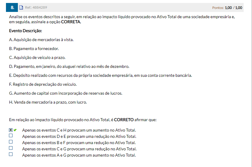 Analise os eventos descritos a seguir, em relação ao impacto líquido provocado no Ativo Total de uma sociedade empresária e, em seguida, assinale a opção CORRETA. Evento Descrição: A. Aquisição de mercadorias à vista. B. Pagamento a fornecedor. C. Aquisição de veículo a prazo. D. Pagamento, em janeiro, do aluguel relativo ao mês de dezembro. E. Depósito realizado com recursos da própria sociedade empresária, em sua conta corrente F. Registro de depreciação do veículo. G. Aumento de capital com incorporação de reservas de H. Venda de mercadoria a prazo, com lucro. Em relação ao impacto líquido provocado no Ativo é CORRETO afirmar que: Apenas os eventos A e H provocam um aumento no Ativo Total. Apenas os eventos D e E provocam uma redução no Ativo Total. Apenas os eventos B e C provocam uma redução no Ativo Total. Apenas os eventos F e G provocam uma redução no Ativo Total. Apenas os eventos A e G provocam um aumento no Ativo Total.