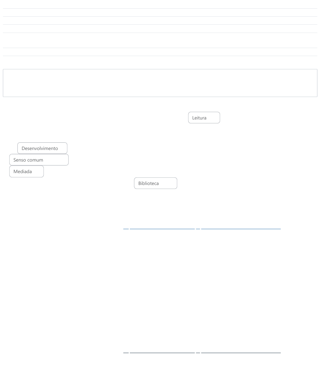09/06/23, 20:08 Questão Discursiva: Revisão da tentativa https://avaead.unisanta.br/mod/quiz/review.php?attempt=307356&cmid=294468 1/2 Iniciado em sexta-feira, 9 jun. 2023, 20:04 Estado Finalizada Concluída em sexta-feira, 9 jun. 2023, 20:07 Tempo empregado 3 minutos 12 segundos Notas 1,00/1,00 Avaliar 10,00 de um máximo de 10,00(100%) Questão 1 Correto Atingiu 1,00 de 1,00 Parece impossível aprender a nadar sem ter água, piscina ou rio, mas o tratamento que a tem recebido na escola é como se isso fosse possível. Se para nadar é preciso piscina e água, para aprender a ler é preciso que haja livros, biblioteca e mediação de leitura, entretanto, ainda permanece na escola a ideia de formar leitores apenas com o discurso aos alunos de que a leitura é importante, que ela faz bem ao sujeito, auxilia no seu e ainda pode ser uma fonte de prazer, de lazer. Embora essas reafirmações façam parte do no discurso de professores, na escola falta espaço para a reflexão acerca de como a leitura tem sido em seu âmbito e há muito a se indagar a esse respeito. Por isso, cabe à equipe docente perguntar-se: qual é o incentivo à leitura que a escola oferece aos alunos? Qual é o acesso dos alunos à ? Ao seu acervo? Há momentos para a troca de ideias sobre o que foi lido? SILVA (2015) SILVA, Rovilson José da. Formar leitores na escola: o projeto pedagógico, a biblioteca escolar e a mediação. Informação & Informação, [S.l.], v. 20, n. 3, p. 487 - 506, dez. 2015. ISSN 1981-8920. Disponível em: <http://www.uel.br/revistas/uel/index.php/informacao/article/view/15390/17677>; Leitura Desenvolvimento Senso comum Mediada Biblioteca Sua resposta está correta. A resposta correta é: Parece impossível aprender a nadar sem ter água, piscina ou rio, mas o tratamento que a [Leitura] tem recebido na escola é como se isso fosse possível. Se para nadar é preciso piscina e água, para aprender a ler é preciso que haja livros, biblioteca e mediação de leitura, entretanto, ainda permanece na escola a ideia de formar leitores apenas com o discurso aos alunos de que a leitura é importante, que ela faz bem ao sujeito, auxilia no seu [Desenvolvimento] e ainda pode ser uma fonte de prazer, de lazer. Embora essas reafirmações façam parte do [Senso comum] no discurso de professores, na escola falta espaço para a reflexão acerca de como a leitura tem sido [Mediada] em seu âmbito e há muito a se indagar a esse respeito. Por isso, cabe à equipe docente perguntar-se: qual é o incentivo à leitura que a escola oferece aos alunos? Qual é o acesso dos alunos à[Biblioteca] ? Ao seu acervo? Há momentos para a troca de ideias sobre o que foi lido? SILVA (2015) SILVA, Rovilson José da. Formar leitores na escola: o projeto pedagógico, a biblioteca escolar e a mediação. Informação & Informação, [S.l.], v. 20, n. 3, p. 487 - 506, dez. 2015. ISSN 1981-8920. Disponível em: <http://www.uel.br/revistas/uel/index.php/informacao/article/view/15390/17677>; http://www.uel.br/revistas/uel/index.php/informacao/article/view/15390/17677%3E http://www.uel.br/revistas/uel/index.php/informacao/article/view/15390/17677%3E 09/06/23, 20:08 Questão Discursiva: Revisão da tentativa https://avaead.unisanta.br/mod/quiz/review.php?attempt=307356&cmid=294468 2/2