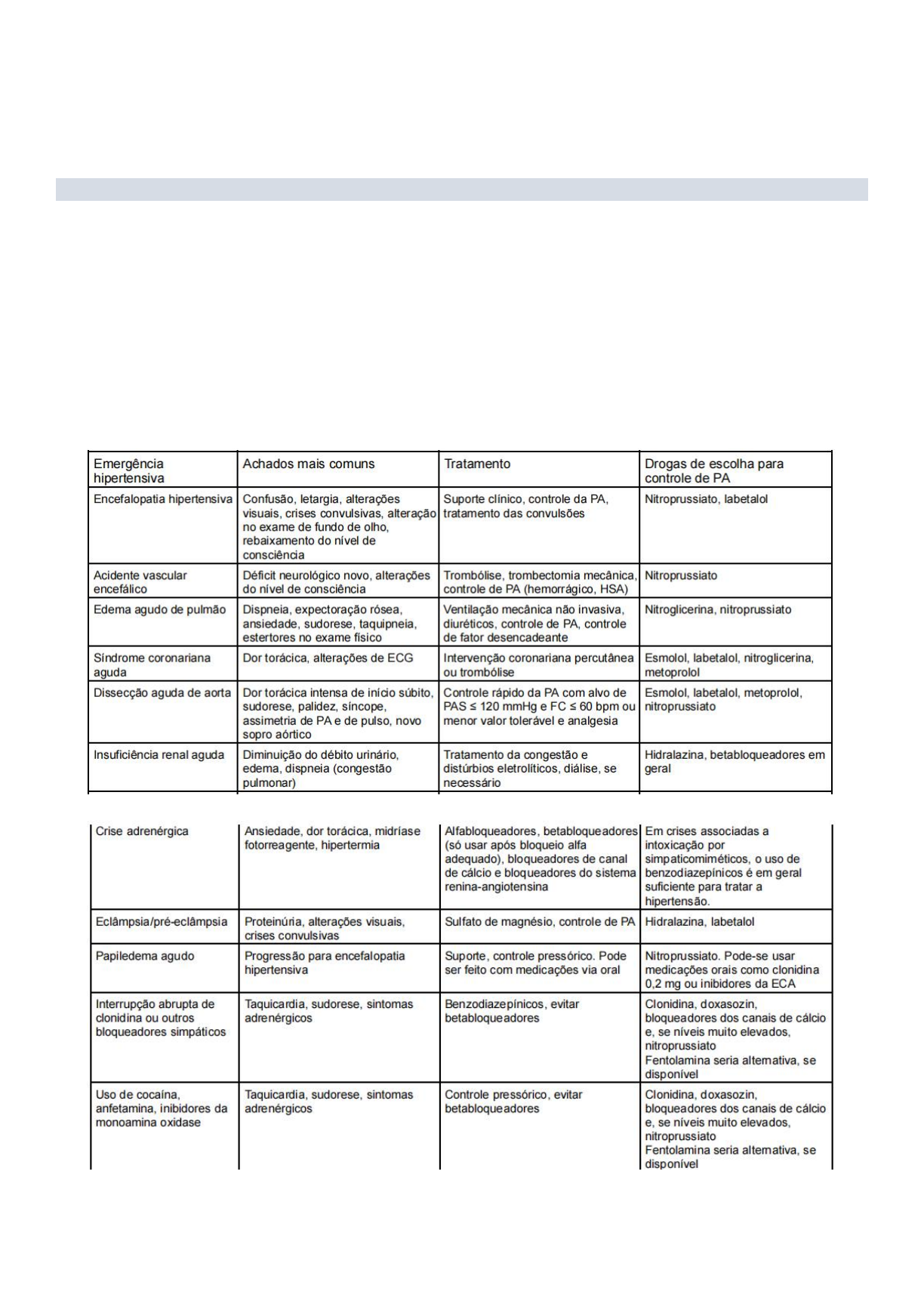 Alana M. Foresti Emergências Hipertensivas Referência: Medicina de Emergência - Prática Clínica - USP 14ed → Abordagem Geral; → Encefalopatia hipertensiva e edema agudo de pulmão. Introdução e Definições Consideramos URGÊNCIA HIPERTENSIVA (UH) quando há elevação acentuada da PA sintomática, sem lesão aguda ou disfunção iminente de órgão-alvo. EMERGÊNCIA HIPERTENSIVA (EH) tipicamente têm elevação acentuada da PA (PA sistólica [PAS] > 180 mmHg e PA diastólica [PAD] > 120 mmHg), com lesão aguda ou piora de lesão crônica de órgão-alvo. Algumas diretrizes utilizam o ponto de corte de 110 mmHg de PAD para definir UH ou EH. A minoria dos pacientes que se apresentam no DE com níveis pressóricos > 180/120 mmHg necessita de algum tipo de intervenção médica imediata, com o risco de eventos cardiovasculares em curto prazo não muito diferente dos hipertensos crônicos controlados ambulatorialmente. Por outro lado, alguns pacientes podem apresentar emergências hipertensivas com valores pressóricos < 180/120 mmHg. As mais comuns são edema agudo de pulmão e acidente vascular encefálico. As crises hipertensivas podem ocorrer em pacientes com e sem diagnóstico prévio de HAS. Mais comuns em homens, em pacientes mal aderentes, obesos e com doença renal crônica. Há maior incidência com o aumento da idade. Etiologia e Fisiopatologia A fisiopatologia da crise hipertensiva ainda não está bem elucidada. O início abrupto sugere um mecanismo de gatilho, possivelmente relacionado a vasoconstritores séricos, sobreposto a hipertensão preexistente. Elevação abrupta da PA→ estresse mecânico vascular→ lesão do endotélio→ ativação inflamatória celular → aumento da permeabilidade vascular → ativação da cascata de coagulação e deposição de fibrina → isquemia tecidual → liberação de mediadores inflamatórios e substâncias vasoativas → ativação do sistema renina-angiotensina-aldosterona → e vasoconstrição que acaba perpetuando o processo de elevação pressórica. Entre as substâncias vasoativas, ocorre liberação de vasopressina, provocando natriurese e podendo resultar em hipovolemia, ampliando, então, a resposta vasoconstritora. A vasoconstrição inicial também pode ser provocada por excesso de sódio e por excesso de catecolaminas (como em uma crise adrenérgica por feocromocitoma). Pacientes com EH apresentam uma falha nos mecanismos autorregulatórios e a resposta ao aumento abrupto da pressão arterial ocorre através da vasoconstrição arteriolar e arterial, que mantém a pressão de perfusão tecidual constante e protege os órgãos-alvo desse aumento pressórico. Esses pacientes apresentam oclusão vascular e microtromboses evidentes, principalmente em exame de fundo de olho, e necrose fibrinoide em arteríolas. Pacientes com EH apresentam com maior frequência HAS secundária se comparados a outros pacientes hipertensos. Causas comuns de HAS secundária incluem hipertensão renovascular, doença renal crônica, hiperaldosteronismo primário e feocromocitoma. Achados Clínicos Os pacientes com uma emergência hipertensiva devem ter sua pressão arterial aferida nos dois braços e eventualmente nos quatro membros, em um ambiente calmo e repetidas vezes, até a estabilização (no mínimo três medidas). Coletar informações sobre a PA usual do paciente e sobre situações que possam desencadear o seu aumento (ansiedade, dor, sal, comorbidades, uso de fármacos anti-hipertensivos – dosagem e adesão) ou que possam aumentar a PA (anti-inflamatórios, corticoides, simpaticomiméticos, álcool). O uso de drogas ilícitas é um fator de risco para crises hipertensivas, principalmente uso de drogas adrenérgicas, como a cocaína. No exame neurológico, buscar alterações do nível de consciência, como agitação e sonolência. Déficit de força ou sensibilidade e rigidez de nuca, que pode ser um indicativo de hemorragia subaracnóidea. Deve-se também testar os reflexos em mulheres grávidas ou no puerpério, sendo a hiperreflexia um dos sinais de eclâmpsia. A assimetria de pulso ou de PA, assim como um novo sopro aórtico e abdominal, pode indicar uma dissecção de aorta. Sinais de congestão pulmonar, dispneia e tosse com expectoração rósea podem ser indicativos de edema pulmonar. Na avaliação inicial o mais importante é excluir lesão aguda, contínua e de órgão-alvo. O exame de fundo de olho ou a ultrassonografia de nervo ótico é essencial nessa avaliação. Pode-se, pela fundoscopia, utilizar a classificação de Keith-Wagener-Barker de retinopatia hipertensiva: Grau 0 – normal. Grau 1 – estreitamento arterial mínimo. Grau 2 – estreitamento arterial óbvio com irregularidades focais. Grau 3 – estreitamento arterial com hemorragias retinianas e/ou exsudato. Grau 4 – grau 3 acrescido de papiledema. Os achados de retinopatia hipertensiva aguda incluem: transudatos periarteriolares, lesões epiteliais pigmentares da retina, edema do disco óptico e macular, exsudatos algodonosos (lesões brancas macias que consistem em axônios isquêmicos edemaciados causados por oclusão de pequenos vasos) e exsudatos duros (depósitos lipídicos retinianos). Tais anormalidades fundoscópicas são consideradas diagnósticas (MAS podem estar ausentes em mais de 30% dos pacientes, com uma emergência hipertensiva clinicamente evidente). As lesões da retinopatia aguda são distintas das alterações mais crônicas, que incluem estreitamento arterial, fio de cobre ou prata das arteríolas, estreitamento arteriovenoso e hemorragias retinianas. ACHADOS QUE SUGEREM EMERGÊNCIAS OU URGÊNCIAS HIPERTENSIVAS Sintomas neurológicos generalizados, como agitação, delírio, estupor, convulsões ou distúrbios visuais; Traumatismo craniano agudo; Sintomas neurológicos focais, acidente vascular cerebral isquêmico ou hemorrágico; Hemorragias retinianas agudas, exsudatos ou papiledema na fundoscopia direta; Náuseas e 