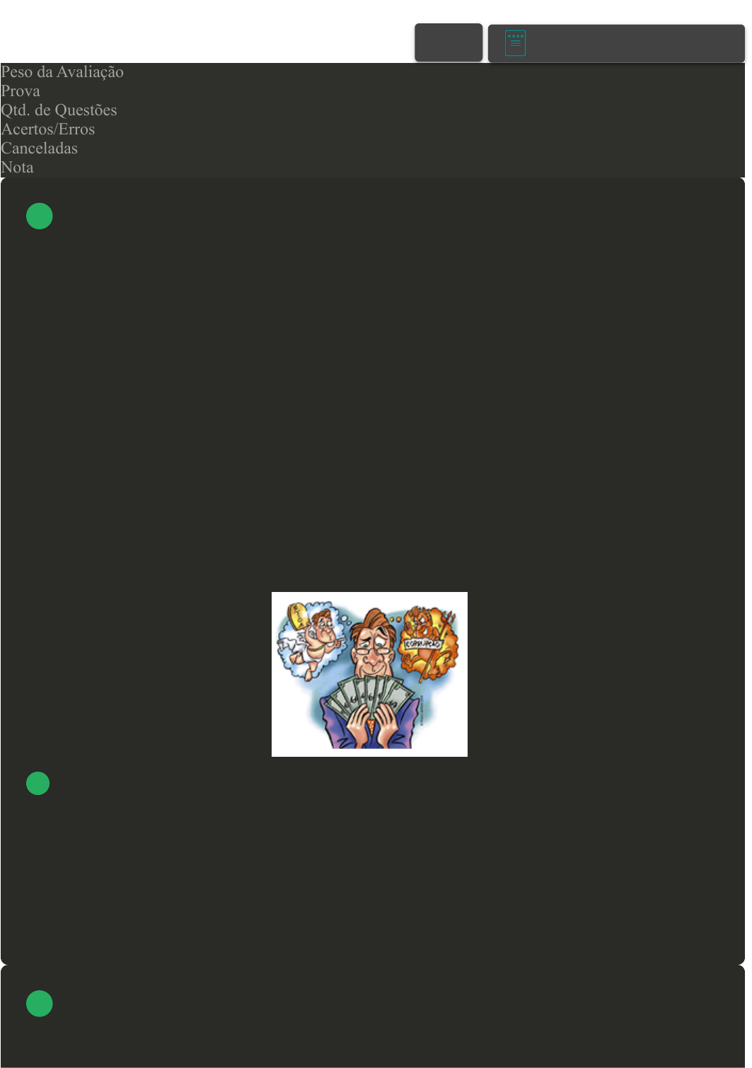 24/03/2023 17:08 Avaliação I - Individual about:blank 1/6 Prova Impressa GABARITO | Avaliação I - Individual (Cod.:821332) Peso da Avaliação 1,50 Prova 60257792 Qtd. de Questões 10 Acertos/Erros 8/1 Canceladas 1 Nota 9,00 Quando se fala em ética, sempre nos referimos aos políticos, mas os empresários também deveriam ter, pois, depois das operações da Polícia Federal, a “Lava Jato" e o "Petrolão”, ocorrido em 2015, mostraram que ambas as partes não possuem o compromisso com a população, a ganância por mais dinheiro atropela toda as expectativas da ética e da moral. As escolhas entre o correto e o errado dependem de nós mesmos, cabe escolher o caminho a seguir. Representando as nossas escolhas entre o correto e o incorreto ou o que se pode dizer entre a ética e a corrupção, observe a charge sobre as ideias que podem representar esse perfil de pessoas, o que ela transmite com relação aos dias atuais, e analise as afirmativas a seguir: I- Considera-se a ética como um recurso de induzir as pessoas a fazer as coisas erradas. II- Pode-se considerar que a ética estuda a moral através de nossas escolhas, valores, desejos, atitudes e sentimentos. III- As crenças sobre a ética se destacam apenas nas escolhas do tipo de religião sobre a sociedade. IV- A ética tem a função de apresentar formas para melhorar o comportamento de cada indivíduo ou grupo social. Agora, assinale a alternativa CORRETA: FONTE DA IMAGEM: Disponível em: . Acesso em: 10 ago. 2015. (Bem = Ética) x (Mau = Corrupção) A As afirmativas II e IV estão corretas. B As afirmativas II e III estão corretas. C Somente a afirmativa I está correta. D As afirmativas I e II estão corretas. Uma Organização Social é uma qualificação, um título, conferido a uma entidade para que ela possa receber determinados benefícios do Poder Público. As Organizações Sociais devem atender a uma demanda específica da comunidade, estando presentes atualmente na gestão de hospitais, VOLTAR A+ Alterar modo de visualização 1 2 24/03/2023 17:08 Avaliação I - Individual about:blank 2/6 museus e institutos de fomento à pesquisa. Sobre as Organizações Sociais no Brasil, assinale a alternativa CORRETA: A São de iniciativas privadas que buscam suprir uma utilidade de ordem pública. B Apresentam uma gestão determinada pelo poder público. C São de iniciativa pública. D Podem apresentar fins lucrativos. É notável que a humanidade vive um tempo de reflexão sobre seu modo de ver o mundo e a própria essência humana, tendo em vista, ao menos na intenção, superar as mazelas causadas pelas guerras, violência e desigualdade social. Assinale a alternativa CORRETA que apresenta um horizonte de esperança para a humanidade: A Os parâmetros de mercado que visam o sucesso absoluto do indivíduo, devem ser os norteadores da humanidade, pois só assim conseguiremos progredir e garantir uma vida socialmente sustentável para todos. B Mudanças comportamentais são necessárias para promover a dignidade humana, por exemplo, continuar trabalhando individualmente, seguindo a lógica do mercado, produzir mais e mais. C Na busca por um mundo melhor, a humanidade precisa ser mais humana, praticar o diálogo, que pressupõe o reconhecimento mútuo e desejar uma vida mais digna e prazerosa para todos. D A humanidade deve reconhecer que o diálogo pressupõe o reconhecimento individual, aspecto fundamental para promover a paz e uma vida menos prazerosa e esperançosa. A questão da corrupção no meio político é assunto constante na mídia, tanto no Brasil quanto em outros países. Esse tipo de conduta criminosa nos faz refletir sobre a ética e a moral humana, especialmente quando ocorre no serviço público, com os representantes políticos do povo. Um caso curioso foi o ocorrido em novembro de 2016, quando a Assembleia Legislativa do Amapá (Alap) viveu uma condição atípica em razão da prisão de um de seus Deputados. Na ocasião, mesmo o deputado estando preso, a ALAP não poderia cassá-lo por falta de um instrumento considerado fundamental para reger os bons costumes e nortear medidas administrativas dentro da Assembleia Legislativa do Amapá: o Código de Ética e Decoro Parlamentar. Sobre os conceitos de ética e moral e sua aplicação em sociedade, classifique V para as sentenças verdadeiras e F para as falsas: ( ) Ética é uma das áreas da filosofia que investiga sobre o agir humano na convivência com os outros. ( ) Nossas ações perante a sociedade em que vivemos são orientadas por princípios éticos e morais. ( ) A ética investiga o agir humano tanto com os outros quanto consigo mesmo. ( ) A expressão da ética ocorre no meio público e privado, e que é normativa a conduta antiética. Assinale a alternativa que apresenta a sequência CORRETA: FONTE: Disponível em: . Acesso em: 30 jan. 2018. A F - V - V - V. B V - F - V - V. 3 4 24/03/2023 17:08 Avaliação I - Individual about:blank 3/6 C F - F - F - V. D V - V - V - F. O Brasil possui uma divisão sociopolítica, na qual encontramos o Primeiro Setor (caracterizado pelo Estado), o Segundo Setor (que abarca as instituições privadas) e o Terceiro Setor contempla as Organizações Não Governamentais (ONGs), que têm algumas particularidades: "No que concerne às formas como as ONGs se movem no espaço público, vale chamar a atenção para o potencial de construção de redes, abrangendo os espaços locais, regionais e globais, como também as potencialidades de incluir, nessas redes, desde organizações internacionais, como as do sistema ONU e fundações financiadoras, até grupos semimarginalizados em bairros da periferia das grandes cidades. A noção de rede em relação às ONGs pode ser pensada de duas formas: uma é a rede entre ONGs incluindo também os movimentos sociais, na qual cada organização é ponto de transmissão para outras, maiores ou menores, locais ou globais. Outra forma de pensar a rede é como um espaço tridim