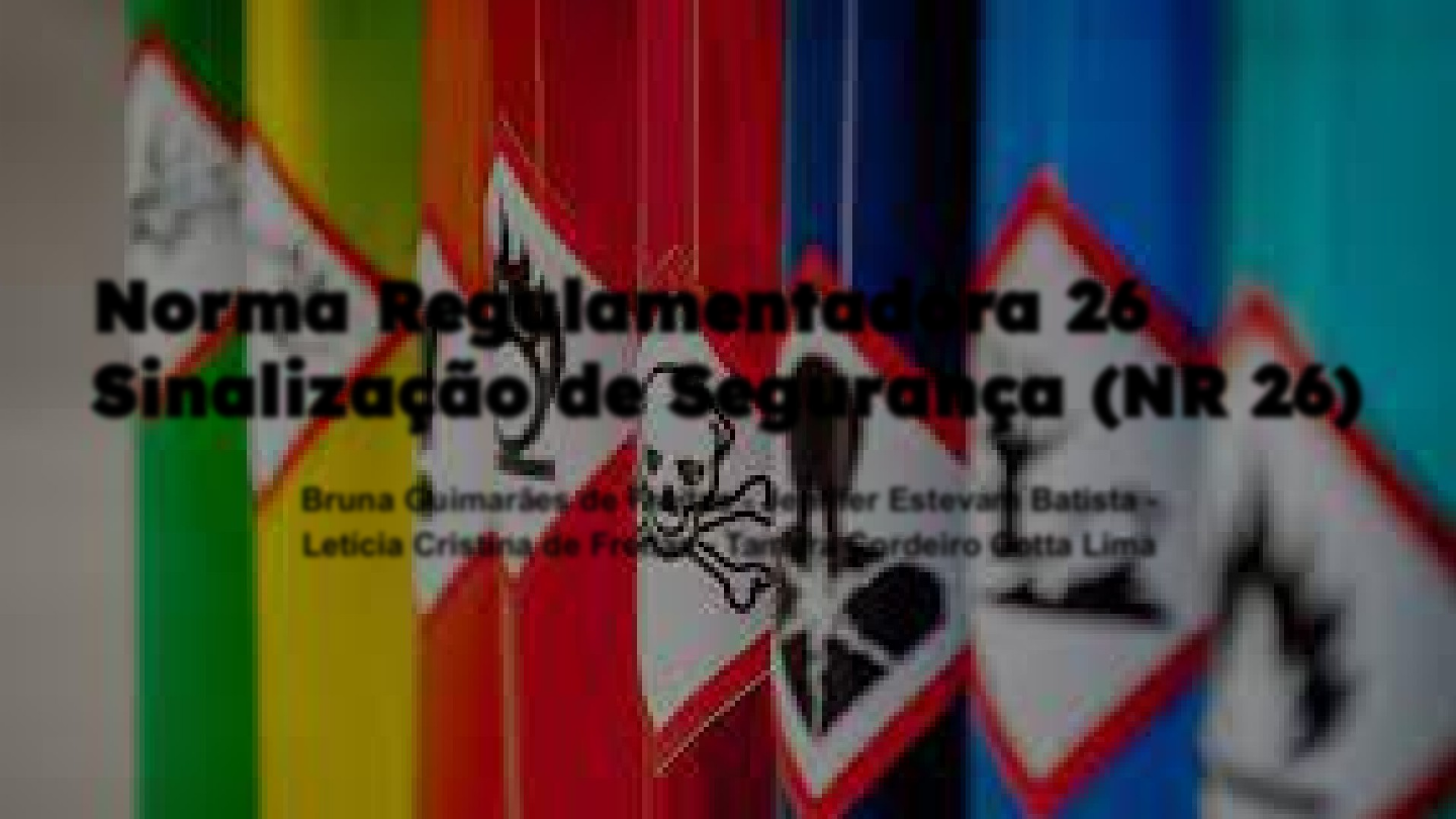 Norma Regulamenĺadora 26 Sinalização de Segurança (NR 26) Bruna Guimarães de Freitas - Jeniffer Estevam Batista - Letícia Cristina de Freitas - Tamara Cordeiro Cotta Lima O que é a NR 26? A NR 26 é uma norma simples de entender, descreve as regras para sinalizações de informações dentro de uma empresa, prezando pela segurança dos trabalhadores. Foi publicada pela primeira vez em 1978 com sua última atualização em 2022.. O que é a NR 26? Assim a NR 26 foi criada com o intuito de alcançar todas as gestões dentro de uma empresa, oferecendo mais segurança aos seus trabalhadores. Além disso, transmitindo informações de fácil compreensão, reduzindo os erros de interpretação e riscos, pois todo o mercado trabalha com as mesmas regras, tendo grande melhoria dos processos. Qual é o seu principal objetivo da NR 26? Alertar para a necessidade de prevenção de acidentes, oferecendo medidas a tomar para garantir a segurança de todos. Em todas as situações de sinalização de segurança do trabalho, são usadas cores para indicar riscos a saúde de um profissional. Além disso pode delimitar áreas ou mostrar tubulações para condução de gases e líquidos. As placas devem ser posicionadas estrategicamente, você deve tomar muito cuidado para não utilizá-las de forma errada, podendo ocasionar distrações ou confusões dos trabalhadores. Classificações e Roĺulagens A NR 26 determina que produtos químicos devem ser identificados como perigosos à segurança ou saúde dos profissionais. Estes riscos podem vir das características físico-químicas ou toxicológicas dos produtos. Os produtos quando não identificados, podem ser manipulados de forma incorreta, ocorrendo acidentes como explosões, incêndios e derramamentos. Além de perigo com queimaduras e intoxicações, pode ser prejudicial ao meio ambiente. Estas embalagens têm a possibilidade de serem descartadas na natureza ou em lugar inapropriado. As classificações e rotulagens de substâncias são baseadas em uma lista harmonizada ou tem levada em consideração resultados obtidos em ensaios e testes. Essas informações devem seguir critérios estabelecidos pela GHS, Sistema Globalmente Harmonizados de Classificação e Rotulagem de Produtos. Classificações e Roĺulagens Vermelho: Deverá ser usado para distinguir e indicar equipamentos e aparelhos de proteção e combate a incêndio, inclusive portas de saída de emergência. Não deverá ser usado na indústria para assinalar perigo, por ser de pouca visibilidade em comparação com o amarelo (de alta visibilidade) e o alaranjado (que significa Alerta). Amarelo: É a cor usada para indicar “cuidado!”. É utilizada, por exemplo, em: partes baixas de corrimões, parapeitos, pisos e portas de elevadores que fecham verticalmente. Este cor é normalmente utilizada para equipamentos de transporte e manipulação de material (ex: empilhadeiras e tratores industriais). Onde há presença da listra amarela na vertical ou inclinada, associadas com preto, pode significar perigo duplo. Classificações e Roĺulagens Branco: Utilizada em faixas para demarcar passadiços, passarelas e corredores pelos quais circulam exclusivamente pessoas; setas de sinalização de sentido e circulação; localização de coletores de resíduos; áreas em torno dos equipamentos de socorros de urgência e outros equipamentos de emergência; abrigos e coletores de resíduos de serviços de saúde. Preto: É a cor empregada para identificar coletores de resíduos, exceto os de origem de serviços de saúde. Normalmente identifica canalizações de inflamáveis e combustíveis de alta viscosidade. Classificações e Roĺulagens Azul: É a cor utilizada para indicar uma ação obrigatória, como determinar o uso de EPI (Equipamento de Proteção Individual) (por exemplo: “Use protetor auricular”); impedir a movimentação ou energização de equipamentos (por exemplo: “Não ligue esta chave”, “Não acione”). Verde: É a cor usada para caracterizar “segurança”. É empregada para identificar a localização de caixas de equipamentos de primeiros socorros; caixas contendo equipamentos de proteção individual; faixas de delimitação de áreas seguras quanto a riscos mecânicos; faixas de delimitação de áreas de vivência (áreas para fumantes, áreas de descanso, etc.); sinalização de portas de entrada das salas de atendimento de urgência; Nos equipamentos de soldagem oxiacetilênica, a mangueira de oxigênio deve ser de cor verde. Classificações e Roĺulagens Laranja: É a cor empregada para indicar “perigo”. É utilizada, por exemplo, em partes móveis e perigosas de máquinas e equipamentos; faces e proteções internas de caixas de dispositivos elétricos que possam ser abertas; equipamentos de salvamento aquático, como boias circulares, coletes salva-vidas, flutuadores salva-vidas e similares. Púrpura: É a cor usada para indicar os perigos provenientes das radiações eletromagnéticas penetrantes e partículas nucleares. É empregada, por exemplo, em portas e aberturas que dão acesso a locais onde se manipulam ou armazenam materiais radioativos ou contaminados por materiais radioativos; locais onde tenham sido enterrados materiais radioativos e equipamentos contaminados por materiais radioativos; recipientes de materiais radioativos ou refugos de materiais radioativos e equipamentos contaminados por materiais radioativos; Uma dica é manter uma ficha de dados de segurança para cada produto químico, assim a NR 26 será cumprida integralmente. Com isso os trabalhadores terão acesso à esses dados referentes aos produtos químicos utilizados em sua rotina. Além disso, é um dever das empresas treinar seus funcionários para que haja conhecimento quanto aos riscos e medidas em sua rotina de trabalho. Com a NR 26 o trabalhador terá compreensão sobre rotulagem preventiva, ficha de perigos, precauções para manipulação segura e procedimento e
