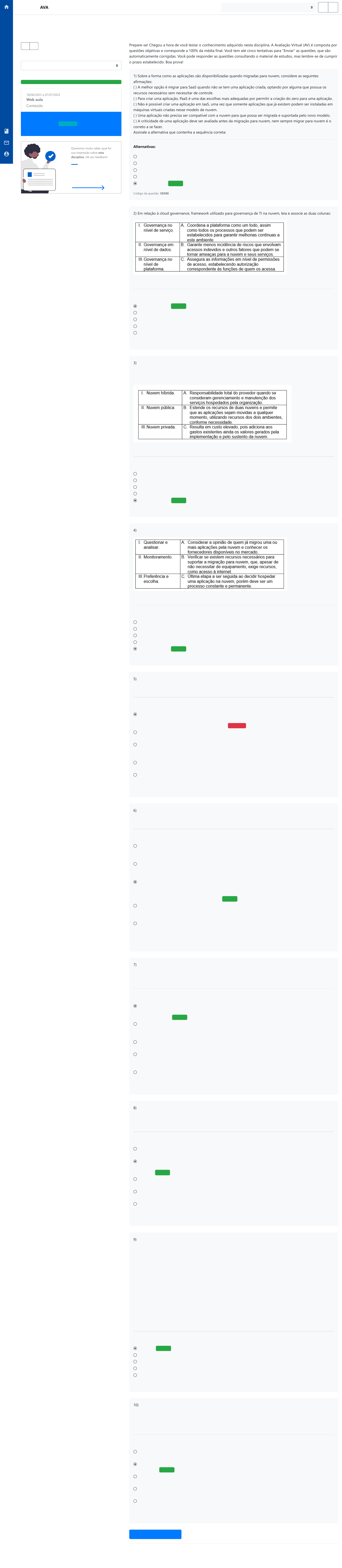 Cosmos • AVA Data center e computação em nuvem Cloud computing Professor(a): Fernanda Rosa da Silva (Especialização) Alterar Disciplina Cloud computing Progresso da Disciplina 100% Queremos muito saber qual foi sua impressão sobre esta disciplina. Dê seu feedback! Pesquisa de opinião 18/06/2023 a 07/07/2023 Web aula Conteúdo 1) 2) 3) 4) 5) 6) 7) 8) 9) 10) Prepare-se! Chegou a hora de você testar o conhecimento adquirido nesta disciplina. A Avaliação Virtual (AV) é composta por questões objetivas e corresponde a 100% da média final. Você tem até cinco tentativas para “Enviar” as questões, que são automaticamente corrigidas. Você pode responder as questões consultando o material de estudos, mas lembre-se de cumprir o prazo estabelecido. Boa prova! Sobre a forma como as aplicações são disponibilizadas quando migradas para nuvem, considere as seguintes afirmações: ( ) A melhor opção é migrar para SaaS quando não se tem uma aplicação criada, optando por alguma que possua os recursos necessários sem necessitar de controle. ( ) Para criar uma aplicação, PaaS é uma das escolhas mais adequadas por permitir a criação do zero para uma aplicação. ( ) Não é possível criar uma aplicação em IaaS, uma vez que somente aplicações que já existem podem ser instaladas em máquinas virtuais criadas nesse modelo de nuvem. ( ) Uma aplicação não precisa ser compatível com a nuvem para que possa ser migrada e suportada pelo novo modelo. ( ) A criticidade de uma aplicação deve ser avaliada antes da migração para nuvem, nem sempre migrar para nuvem é o correto a se fazer. Assinale a alternativa que contenha a sequência correta: Alternativas: Código da questão: 58386 Em relação à cloud governance, framework utilizado para governança de TI na nuvem, leia e associe as duas colunas: Assinale a alternativa que traz a associação correta entre as duas colunas: Alternativas: Código da questão: 58373 Para cada tipo de nuvem, existem responsabilidades e funcionalidades próprias que envolvem a escolha baseada no objetivo dos negócios e necessidades que devem ser atendidas ao migrar para nuvem. Leia e associe as duas colunas: Assinale a alternativa que traz a associação correta entre as duas colunas: Alternativas: Código da questão: 58366 Leia e associe as duas colunas: Assinale a alternativa que traz a associação correta entre as duas colunas: Alternativas: Código da questão: 58387 Sobre as principais decisões que envolvem a governança de TI na nuvem, podemos dizer que o principal benefício inclui isentar a organização de algumas responsabilidades, fazendo com que se tenha mais tempo para investir em pontos importantes do negócio. É verdadeiro afirmar que: Alternativas: Código da questão: 58370 O futuro da computação em nuvem é algo incerto, porém, com a evolução da tecnologia, diversas possibilidades já são consideradas, prevendo como as aplicações irão se desenvolver e as funcionalidades que ainda serão atribuídas a elas. Sobre isso, é correto afirmar que: Alternativas: Código da questão: 58390 A governança de TI é responsável por tratar os riscos identificados na nuvem, assim como já ocorria em uma infraestrutura tradicional. Porém, como resultado ainda pode-se ter a perda de controle sob a governança por parte do cliente, em que nenhum plano de ação é capaz de reparar alguns prejuízos. Sendo assim, assinale alguns dos maiores riscos que devem ser considerados ao migrar para nuvem, considerando o contexto apresentado: Alternativas: Código da questão: 58376 A computação em nuvem permite, com o uso de sua arquitetura, a entrega de recursos sob demanda, totalmente configuráveis, incluindo todos os meios físicos necessários, como servidores, equipamentos de rede, dispositivos de armazenamento e todas as aplicações e os serviços necessários para o funcionamento da nuvem. Assinale a alternativa que contém características nativas relacionadas com a arquitetura e infraestrutura da nuvem: Alternativas: Código da questão: 58368 A governança de TI inclui alguns fatores que devem ser considerados ao realizar um planejamento, além de uma estratégia bem definida que garanta o sucesso a este processo. Sobre esses fatores, podemos afirmar que: I. Interpretar a criticidade de forma minuciosa para cada aplicação é o primeiro passo para não enfrentar problemas relacionados à segurança ao migrar as aplicações para nuvem, faz parte da governança criar este planejamento. II. Mesmo com a transição dos serviços, manter seu nível continua sendo responsabilidade da organização, que deve estabelecer e gerenciá-los quanto ao seu suporte e tempo de atendimento para cada problema, considerando sua criticidade. III. Uma boa governança prepara a organização para que, em casos em que o provedor não atenda às suas expectativas ou não esteja pronto para atender às demandas do ambiente quando ele passa a apresentar necessidades específicas, seja mais fácil substituir o serviço, migrando suas soluções sem enfrentar contratempos. IV. Migrar para nuvem isenta a organização de monitorar qualquer serviço, analisar relatórios ou atribuir qualquer responsabilidade ou papel internamente, isso passa a ser governado inteiramente pelo provedor, bastando que ele seja de confiança. V. É importante avaliar todas as estratégias mantidas pelo provedor para garantir a segurança dos dados, sendo elas não somente lógicas, mas que envolvam também a segurança do data center em que os serviços estão hospedados. São verdadeiras: Alternativas: Código da questão: 58374 A Empresa XYZ migrou seus servidores web para nuvem pública contratando a plataforma Azure, da Microsoft, para esta hospedagem. Após concluir a migração e os testes, e atestar a funcionalidade do ambiente, sinalizou o gerente de TI que, apesar de satisfeito, ainda mantinha uma preocupação considerando a nuvem privada que a empresa tam