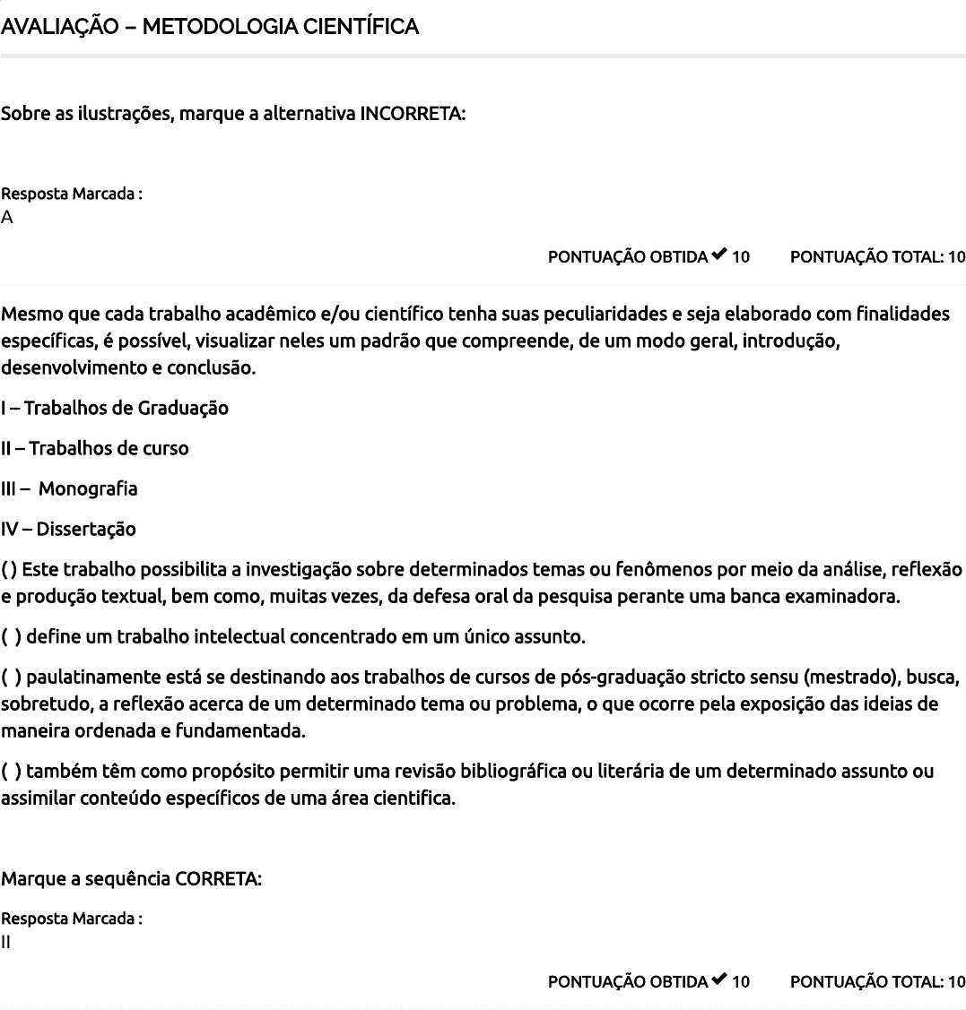 AVALIAÇÃO – METODOLOGIA CIENTÍFICA PONTUAÇÃO TOTAL: 10PONTUAÇÃO OBTIDA 10 Sobre as ilustrações, marque a alternativa INCORRETA: Resposta Marcada : A identi�cação das ilustrações deve aparecer na parte inferior da página. PONTUAÇÃO TOTAL: 10PONTUAÇÃO OBTIDA 10 Mesmo que cada trabalho acadêmico e/ou cientí�co tenha suas peculiaridades e seja elaborado com �nalidades especí�cas, é possível, visualizar neles um padrão que compreende, de um modo geral, introdução, desenvolvimento e conclusão. I – Trabalhos de Graduação II – Trabalhos de curso III – Monogra�a IV – Dissertação ( ) Este trabalho possibilita a investigação sobre determinados temas ou fenômenos por meio da análise, re�exão e produção textual, bem como, muitas vezes, da defesa oral da pesquisa perante uma banca examinadora. ( ) de�ne um trabalho intelectual concentrado em um único assunto. ( ) paulatinamente está se destinando aos trabalhos de cursos de pós-graduação stricto sensu (mestrado), busca, sobretudo, a re�exão acerca de um determinado tema ou problema, o que ocorre pela exposição das ideias de maneira ordenada e fundamentada. ( ) também têm como propósito permitir uma revisão bibliográ�ca ou literária de um determinado assunto ou assimilar conteúdo especí�cos de uma área cienti�ca. Marque a sequência CORRETA: Resposta Marcada : II,III,IV,I. PONTUAÇÃO TOTAL: 10PONTUAÇÃO OBTIDA 10 Hipótese é uma suposição que se faz na tentativa de explicar o que se desconhece. Esta suposição tem por característica o fato de ser provisória, devendo, portanto, ser testada para a veri�cação de sua validade. Sobre o pressuposto marque a alternativa CORRETA: Resposta Marcada : É uma suposta resposta ao problema a ser investigado. A origem das hipóteses poderia estar na observação assistemática dos fatos, nos resultados de outras pesquisas, nas teorias existentes, ou na simples intuição (GIL, 1999). PONTUAÇÃO TOTAL: 10PONTUAÇÃO OBTIDA 10 Marque a alternativa que de�ne CORRETAMENTE a �nalidade de pesquisa cientí�ca segundo (SILVA, 2008). Resposta Marcada : Produção de novos conhecimentos através da utilização de procedimentos cientí�cos. Assim, contribui para o trato dos problemas e processos do dia a dia nas mais diversas atividades humanas, no ambiente de trabalho, nas ações comunitárias, no processo de formação e outros. PONTUAÇÃO TOTAL: 10PONTUAÇÃO OBTIDA 10 São elementos para enriquecer o texto acadêmico: as citações, as notas de rodapé, as alíneas, as ilustrações, tabelas e grá�cos. Assim, as citações podem seguir os sistemas: Resposta Marcada : Numérico ou autor-data. PONTUAÇÃO TOTAL: 10PONTUAÇÃO OBTIDA 10 Analise as a�rmativas sobre conceitos de pesquisa cientí�ca e assinale V para verdadeiro e F para falso. ( ) Pesquisa metodológica: Quando são criados métodos e instrumentos para captar informações e se chegar a determinado �m. Esse tipo é mais ligado a caminhos, formas, maneiras e procedimentos para se chegar a alguma solução. ( ) Pesquisa exploratória: O único objetivo desse tipo é descrever características de alguma população ou fenômeno. Ela é a base para análises posteriores, mas não tem a responsabilidade de fazer nenhuma correlação entre os dados encontrados. ( ) Pesquisa descritiva: É utilizada quando ainda não se tem muitas informações sobre o campo que se pretende abordar. Por isso, naturalmente, ela não é baseada em hipóteses, já que as informações necessárias para isso ainda serão descobertas. ( ) Pesquisa intervencionista: Quando o objetivo não é apenas apresentá-la e/ou descrevê-la, mas interferir de algum modo, propondo e implementando soluções para os problemas encontrados, ela é de�nida como intervencionista. Marque a alternativa correta. Resposta Marcada : V, F, F, V. PONTUAÇÃO TOTAL: 10PONTUAÇÃO OBTIDA 10 Segundo a ABNT marque a alternativa CORRETA que relaciona as regras gerais de formatação: Resposta Marcada : Elementos pré-textuais: Iniciar no anverso da folha (somente frente), exceto a autorização do autor para a reprodução do trabalho e a �cha catalográ�ca que é impressa no verso da folha de rosto. PONTUAÇÃO TOTAL: 10PONTUAÇÃO OBTIDA 10 Marque a alternativa que NÃO está relacionado ao termo metodologia cientí�ca: Resposta Marcada : Metodologia Cientí�ca é uma disciplina que estuda o aluno e avalia os métodos, dos professores identi�cando limitações e implicações que dizem respeito a cada um. 100 / 100 PONTUAÇÃO TOTAL: 10PONTUAÇÃO OBTIDA 10 O que signi�ca ABNT? Resposta Marcada : Conjunto de regras que estabelecem formatações especí�cas para trabalhos acadêmico. PONTUAÇÃO TOTAL: 10PONTUAÇÃO OBTIDA 10 Citação é a menção, no texto, de informação extraída de outra fonte para esclarecer, ilustrar ou sustentar o assunto apresentado, podendo aparecer no texto ou em notas de rodapé. Todas as citações do texto devem constar nas Referências, assim como todos os documentos relacionados nas Referências devem ser citados no texto. É uma obrigação e respeito aos ‘direitos autorais’. Maque a alternativa que NÃO está de acordo com os modos básicos de se apresentar a citação: Resposta Marcada : Citação de citação: não se aplica referência direta ou indireta de um texto em que não se teve acesso ao original. Total