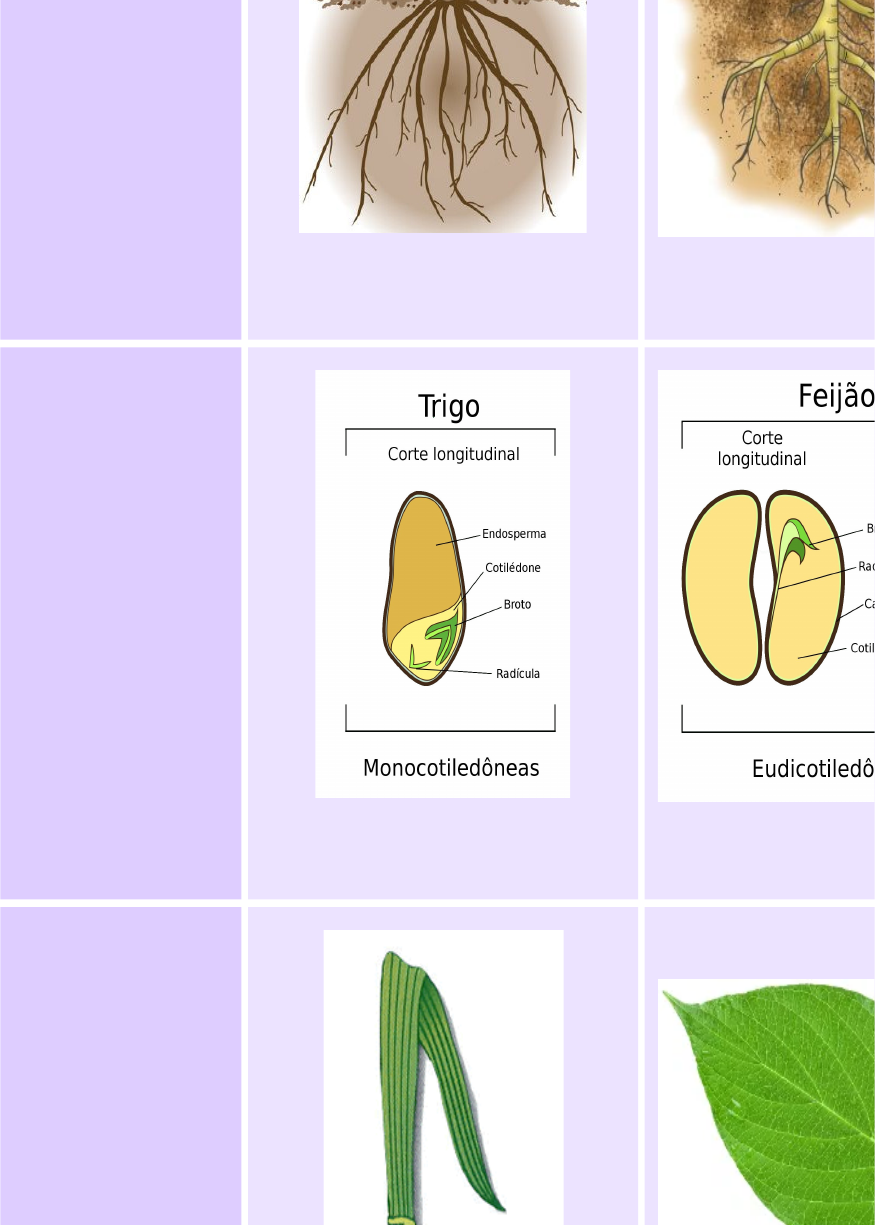 Triticum spp é um grão de cereal conhecido popularmente como o trigo, originário do sudoeste da Ásia, uma planta anual que é semeada na primavera ou no outono, o período de floração dessa planta se dá no final de maio até o início de junho, essa fase geralmente demora mais que uma semana, pois nem todas as flores da planta se abriram ao mesmo tempo. Esse cereal são classificados como eudicotiledôneas, suas folhas possuem nervuras paralelas, os elementos florais são múltiplos de 3 e sua raiz estão dispostas em cabeleira. Phaseolus spp seu representante mais conhecido é o feijão. Pertence à família Fabaceae e é composto por aproximadamente 70 espécies, e todas são nativas das Américas. As plantas de feijão preferem soltos, fofos e areados, que são ricos em matéria orgânica e livre de encharcamentos, são classificados como monocotiledôneas , com raízes pivotantes e com presença de flores como elementos múltiplos de 4 ou 5. Monocotiledôneas Eudicotiledôneas Raízes Fasciculada Pivotantes Sementes Um cotilédone Dois cotilédone Folhas Paralelinérvea Peninérvea/Palminérvea Flores Trímeras Pentâmeras/Tetrâmera