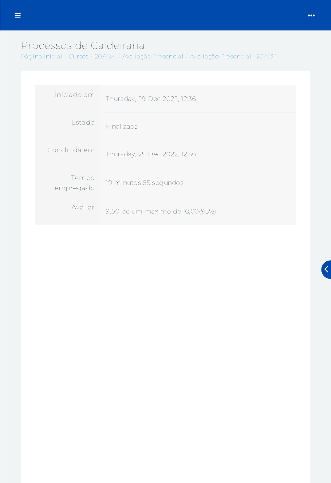 Página inicial / Cursos / 20A134 / Avaliação Presencial / Avaliação Presencial - 20A134 Processos de Caldeiraria Iniciado em Thursday, 29 Dec 2022, 12:36 Estado Finalizada Concluída em Thursday, 29 Dec 2022, 12:56 Tempo empregado 19 minutos 55 segundos Avaliar 9,50 de um máximo de 10,00(95%) https://ava.politecnicabr.com.br/ https://ava.politecnicabr.com.br/course/index.php https://ava.politecnicabr.com.br/course/view.php?id=971 https://ava.politecnicabr.com.br/course/view.php?id=971#section-12 https://ava.politecnicabr.com.br/mod/quiz/view.php?id=31378 https://ava.politecnicabr.com.br/ Questão 1 Completo Atingiu 1,00 de 1,00 As limas possuem um dentado responsável pela remoção de material durante sua utilização, portanto, para que tenham maior durabilidade, é necessário tomar alguns cuidados: Escolha uma opção: a. As limas devem ser guardadas em suportes que evitem o contato com outras ferramentas ou outras limas, e em locais protegidos contra a umidade. b. Não limar peças feitas de materiais de maior dureza do que o material com o qual a lima foi fabricada, por exemplo, aço temperado. c. Procurar utilizar primeiramente um dos lados. Passe para o segundo lado somente quando o primeiro já estiver gasto. d. Selecionar o tamanho da lima de acordo com a região da peça que será limada e do acaba- mento previsto para o limado. e. Todas as alternativas corretas. https://ava.politecnicabr.com.br/ Questão 2 Completo Atingiu 1,00 de 1,00 Associe corretamente sobre as Normas brasileiras para padronização de chapas: Bobinas e chapas laminadas a quente, de aço acalmado, com características melhoradas de propriedades mecânicas, conformidade e soldabilidade - Especi�cação. Chapas de aço-carbono-zincadas pelo processo semicontínuo de imersão a quente. Bobinas e chapas �nas de aço - carbono para uso geral - Especi�cação. Folhas laminadas de aço-carbono revestidas eletroliticamente com estanho ou cromo ou não revestidas - Especi�cação Produtos planos laminados de aço - esta Norma de�ne os termos aplicáveis aos produtos planos laminados de aço. Bobinas e chapas de aço bifásico revestidas com zinco ou liga zinco-ferro pelo processo contínuo de imersão a quente - Especi�cação. ABNT N ABNT N ABNT N ABNT N ABNT N ABNT N https://ava.politecnicabr.com.br/ Questão 3 Completo Atingiu 1,00 de 1,00 Marque a alternativa correta referente a acidente do trabalho: Escolha uma opção: a. Acidente de trabalho é toda ocorrência não programada, estranha ao andamento normal do trabalho, da qual possam resultar danos funcionais, morte do trabalhador e/ou danos materiais ou econômicos à empresa. b. Acidente de trabalho é toda ocorrência não programada, estranha ao andamento normal do trabalho, da qual possam resultar danos físicos, morte do trabalhador e/ou danos materiais ou econômicos à empresa. c. Acidente de trabalho é toda ocorrência não programada, estranha ao andamento normal do trabalho, da qual possam resultar danos físicos e/ou funcionais, morte do trabalhador e/ou danos materiais ou econômicos à empresa. d. Acidente de trabalho é toda ocorrência não programada, estranha ao andamento normal do trabalho, da qual possam resultar danos físicos e/ou funcionais e/ou danos materiais ou econômicos à empresa. https://ava.politecnicabr.com.br/ Questão 4 Completo Atingiu 1,00 de 1,00 Várias peças da caldeiraria utilizam a geometria do cone em sua construção. Para a plani�cação do cone, são necessários os seguintes procedimentos: Escolha uma opção: a. Dividir a meia circunferência com a do cone, em 7 partes iguais b. Traçar a plani�cação do cone, iniciando com o segmento de reta com a mesma medida da diagonal do cone (A 7) c. Traçar a vista de elevação do cone e uma meia circunferência com diâmetro médio na parte inferior d. Traçar o arco considerando o comprimento da circunferência da base do cone e dividir pelo mesmo número de divisões da circunferência e. Todas as alternativas correspondem. https://ava.politecnicabr.com.br/ Questão 5 Completo Atingiu 0,50 de 1,00 Associe corretamente as alternativas: Possui vértice em sua geometria, e é fabricada a partir de duas chapas. Quando estas forem plani�cadas, ao serem calandradas, vão gerar a inclinação desejada. Para o processo ___________________ com as duas bases inclinadas, deve-se proceder da mesma forma que nas fases de plani�cação do cilindro com uma base inclinada, repetindo a traçagem horizontal e o per�l com geometria da curvatura da inclinação para os dois lados. Os gomos são cilindros com um ou dois lados inclinados, dependendo da posição, portanto, a plani�cação é executada conforme o procedimento descrito na plani�cação do cilindro de uma ou duas bocas inclinadas. É desenvolvido de modo que, de acordo com o dimensionamento, a peça seja desenhada aberta, ou seja, ao curvar a chapa, a mesma deve estar de acordo com a geometria e o dimensionamento previstos no desenho técnico mecânico da peça. A divisão é indicada quando é preciso minimizar o choque do �uido na mudança de direção gerada pela curva, ou então quando a curva é muito grande e deve apresentar um raio em sua geometria, ou seja, sem vértice. Para o _____________________________________, ou, como são popularmente chamadas, “bocas” inclinadas, procede-se inicialmente da mesma forma que o cilindro de bases paralelas, ou seja, analisa-se o desenho técnico do cilindro e calcula-se seu diâmetro médio. Curvas Process Curvas Traçado Curvas Process https://ava.politecnicabr.com.br/ Questão 6 Completo Atingiu 1,00 de 1,00 Marque Verdadeiro ou Falso: As furadeiras são construídas para atender os diversos tipos de aplicação: desde os mais simples, como a utilização doméstica, até o uso em caldeirarias de grande porte. De acordo com suas características construtivas, as furadeiras podem ser: ( ) Furadeira com coluna de bancada: este tipo de fur