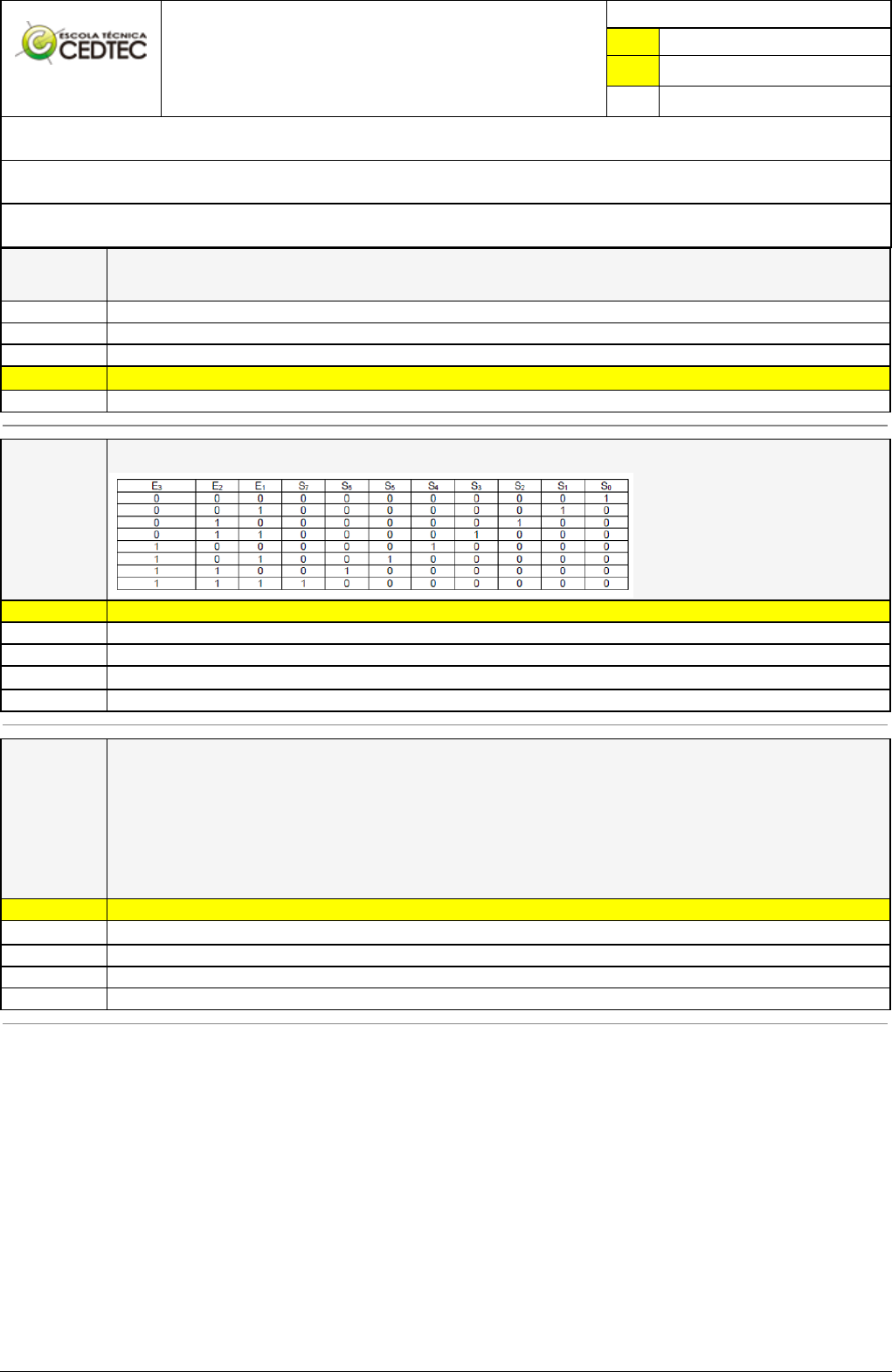 Pincel Atômico - 21/05/2023 11:40:19 1/2 WANDERSON SALVADOR CLEMENTE Exercício Caminho do Conhecimento - Etapa 11 (22706) Atividade finalizada em 20/05/2023 18:33:27 (909407 / 1) LEGENDA Resposta correta na questão # Resposta correta - Questão Anulada X Resposta selecionada pelo Aluno Disciplina: ELETRÔNICA [796043] - Avaliação com 4 questões, com o peso total de 13,00 pontos [capítulos - 113] Turma: Curso Técnico: Eletrotécnica - Grupo: EAD - 02/23 - EAD ELE [82543] Aluno(a): 91436804 - WANDERSON SALVADOR CLEMENTE - Respondeu 2 questões corretas, obtendo um total de 6,50 pontos como nota [349999_146133] Questão 001 São 3 blocos básicos de um microprocessador: Acumulador, gerador de clock e pilha operacional. Pilha operacional, contador de programa e DMA. Unidade lógica e aritmética, DMA e registradores. X Unidade de controle, unidade lógica e aritmética e registradores. Contador de programa, pilha operacional e acumulador. [349997_146140] Questão 002 Dada a tabela-verdade de um dispositivo lógico abaixo, assinale a alternativa que corresponde ao dispositivo lógico em questão. Considere os bits de entrada E e os bits de Saída S. Decodificador de 3 bits Display de 7 segmentos. Multiplexador de 8 bits. X Demultiplexador de 8 bits. Codificador de 3 bits. [349997_146131] Questão 003 Analise as afirmativas identificando com “V" as VERDADEIRAS e com “F" as FALSAS assinalando a seguir a alternativa CORRETA, na sequência de cima para baixo: ( ) Um decodificador é um dispositivo cuja saída será ativada apenas quando uma única combinação binária (código correto) estiver presente em suas entradas. ( ) Contadores atuam como chaves controladas digitalmente que selecionam e conectam uma entrada lógica de cada vez ao pino de saída. Muitos sinais de dados diferentes podem compartilhar a mesma via de dados. ( ) Em sistemas digitais, muitos dispositivos têm de compartilhar a via de dados, que costuma ser denominada barramento de dados. ( ) Circuitos osciladores possuem diversas aplicações em sistemas digitais, dentre elas estão seleção de dados, roteamento de dados, sequenciamento de operações, conversões paralelo-série, geração de formas de onda e geração de funções lógicas. V-F-F-V X V-F-V-F V-V-V-F F-F-V-V F-V-F-F Pincel Atômico - 21/05/2023 11:40:19 2/2 [349998_146129] Questão 004 Considere a montagem contendo um decodificador BCD - 7 segmentos e um display. Ao testar as entradas A, B, C e D do decodificador, a com a sequência de zero a 9, o resultado obtido foi: A cauda da não correspondênica entre o número decima pode ser consequência da inversão dos fios que ligam as entradas. C e D X B e C A e B A e D B e D