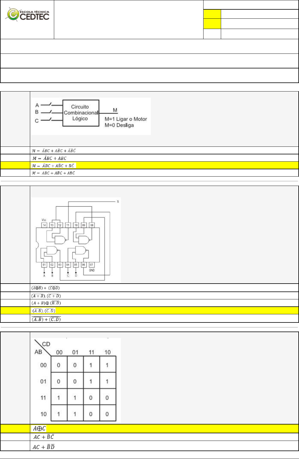 Pincel Atômico - 21/05/2023 12:13:10 1/2 WANDERSON SALVADOR CLEMENTE CAMINHO DO CONHECIMENTO Atividade finalizada em 21/05/2023 12:13:01 (tentativa: 2) LEGENDA Resposta correta na questão # Resposta correta - Questão Anulada X Resposta selecionada pelo Aluno Disciplina: ELETRÔNICA [capítulos - 113] - Avaliação com questões, com o peso total de 13,00 pontos Turma: Curso Técnico: Eletrotécnica - Grupo: EAD - 02/23 - EAD ELE [82543] Aluno(a): 91436804 - WANDERSON SALVADOR CLEMENTE - Respondeu 2 questões corretas, obtendo um total de 6,50 pontos como nota Questão 001 Um circuito lógico da figura foi programado para acionar um motor quando apenas duas das três chaves (A, B, C) estiverem ligadas. Para o acionamento, convencionou-se que as variáveis assumem valor lógico 1, quando ligadas, e 0, quando desligadas A expressão lógica da saída M é: A) B) X C) D) Questão 002 O circuito integrado (CI) apresentado abaixo tem 14 pinos e pertence à família TTL. É composto de quatro portas NAND, com as quais foi montado um circuito lógico, cujas ligações entre os pinos também se encontram indicadas junto ao diagrama do CI. A) B) C) D) X E) Questão 003 O mapa de Karnaugh mostrado acima representa a função lógica: A) B) X C) Pincel Atômico - 21/05/2023 12:13:10 2/2 D) E) Questão 004 São 3 blocos básicos de um microprocessador: A) Pilha operacional, contador de programa e DMA. X B) Unidade de controle, unidade lógica e aritmética e registradores. C) Acumulador, gerador de clock e pilha operacional. D) Contador de programa, pilha operacional e acumulador. E) Unidade lógica e aritmética, DMA e registradores.