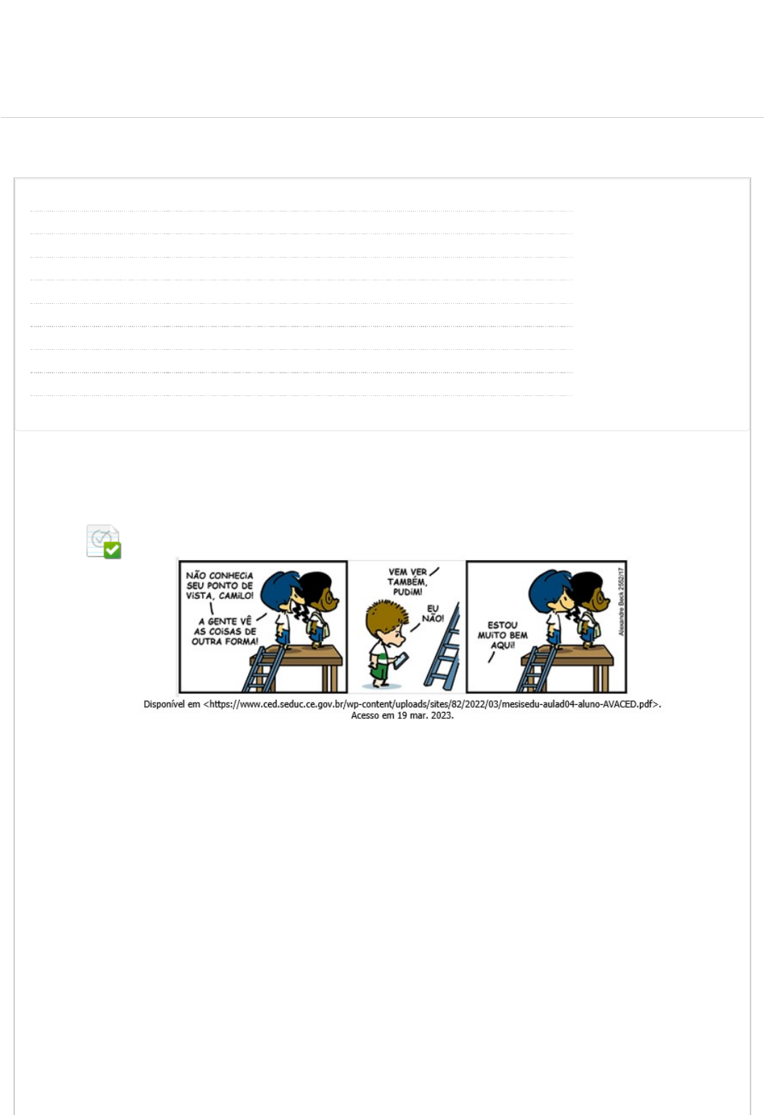 10/05/2023, 16:46 Revisar envio do teste: PSA 2023/1 – PSA 6937-00 https://ava.ead.unip.br/webapps/assessment/review/review.jsp?attempt_id=_94356466_1&course_id=_28560_1&content_id=_3414806_1&retur… 1/23 Revisar envio do teste: PSA 2023/1PSA 6937-00 CONTEÚDO Usuário natalia.dos1 @aluno.unip.br Curso PSA Teste PSA 2023/1 Iniciado 10/05/23 15:24 Enviado 10/05/23 16:44 Status Completada Resultado da tentativa 8,5 em 10 pontos Tempo decorrido 1 hora, 20 minutos Autoteste O aluno responde e o resultado do aluno não é visível ao professor. Resultados exibidos Respostas enviadas, Perguntas respondidas incorretamente Pergunta 1 Resposta Selecionada: a. Leia a tirinha. Com base na leitura, avalie as a�rmativas. I. O posicionamento do personagem Pudim representa o comportamento de pessoas que se recusam a ver novas perspectivas. II. A tirinha valoriza a superioridade e a empatia decorrente dessa superioridade. III. O objetivo da tirinha é criticar o mau comportamento de crianças que buscam diversão com ações inadequadas. É correto o que se a�rma apenas em I. Pergunta 2 UNIP EAD BIBLIOTECAS MURAL DO ALUNO TUTORIAISCONTEÚDOS ACADÊMICOS 0,5 em 0,5 pontos 0,5 em 0,5 pontos http://company.blackboard.com/ https://ava.ead.unip.br/webapps/blackboard/execute/courseMain?course_id=_28560_1 https://ava.ead.unip.br/webapps/blackboard/content/listContent.jsp?course_id=_28560_1&content_id=_439332_1&mode=reset https://ava.ead.unip.br/webapps/portal/execute/tabs/tabAction?tab_tab_group_id=_10_1 https://ava.ead.unip.br/webapps/portal/execute/tabs/tabAction?tab_tab_group_id=_27_1 https://ava.ead.unip.br/webapps/portal/execute/tabs/tabAction?tab_tab_group_id=_47_1 https://ava.ead.unip.br/webapps/portal/execute/tabs/tabAction?tab_tab_group_id=_29_1 https://ava.ead.unip.br/webapps/portal/execute/tabs/tabAction?tab_tab_group_id=_25_1 https://ava.ead.unip.br/webapps/login/?action=logout 10/05/2023, 16:46 Revisar envio do teste: PSA 2023/1 – PSA 6937-00 https://ava.ead.unip.br/webapps/assessment/review/review.jsp?attempt_id=_94356466_1&course_id=_28560_1&content_id=_3414806_1&retur… 2/23 Resposta Selecionada: c. Leia a charge. O objetivo da charge é valorizar o livro e as atividades pedagógicas não digitais como ferramentas importantes para a construção do conhecimento. Pergunta 3 Leia a charge, que faz o contraponto entre o �lósofo Sócrates e um indivíduo contemporâneo que se informa pelas redes sociais. Com base na leitura, avalie as asserções e a relação proposta entre elas. 0,5 em 0,5 pontos 10/05/2023, 16:46 Revisar envio do teste: PSA 2023/1 – PSA 6937-00 https://ava.ead.unip.br/webapps/assessment/review/review.jsp?attempt_id=_94356466_1&course_id=_28560_1&content_id=_3414806_1&retur… 3/23 Resposta Selecionada: e. I. A charge enaltece o interesse atual dos jovens pela informação e critica a falta de entusiasmo pelo conhecimento no período clássico da civilização grega. PORQUE II. O objetivo da charge é mostrar que a tecnologia permitiu a evolução do conhecimento e que, na “sociedade da informação”, somos mais sábios. A respeito dessas asserções, assinale a opção correta. As asserções I e II são falsas. Pergunta 4 Leia o texto. Não vacinados representam 75% das mortes por covid-19, diz estudo brasileiro Vacinação protegeu todas as faixas etárias de hospitalizações e mortes, inclusive indivíduos com mais de 80 anos Publicado em 04/03/2022 Uma pesquisa conduzida em Londrina, no Paraná, mostrou que 75% das mortes por covid-19 registradas nos primeiros dez meses de 2021 ocorreram em indivíduos que não foram imunizados contra a doença. Entre os idosos, o índice de morte foi quase três vezes maior entre os não vacinados do que entre os imunizados. Entre pessoas com menos de 60 anos, o número de mortes de não vacinados foi 83 vezes maior do que nos imunizados. O estudo foi conduzido pela Universidade Estadual de Londrina, pela Secretaria Municipal de Saúde de Londrina, pela Universidade Federal de São Carlos e pela Faculdade de Medicina Albert Einstein dos EUA. Foram incluídos no estudo dados de 59.853 casos con�rmados de covid-19 e 1.687 mortes pela doença, reportados entre janeiro e outubro de 2021. Dos óbitos registrados, 1.269 foram de indivíduos não vacinados. Já entre os casos con�rmados, 48.217 foram de pessoas que não tomaram a vacina, 7.207 de indivíduos parcialmente imunizados e 4.429 de pessoas com esquema vacinal completo. Dos vacinados que foram infectados, 54% tinham mais de 60 anos. Os cientistas analisaram as taxas de letalidade (proporção entre o número de mortes e o número de casos) em três modelos: de acordo com a idade dos participantes, com o status de vacinação e segundo a relação de ambas as características (idade e vacinação). No primeiro modelo, quanto mais velhos os indivíduos, maior a letalidade observada. A segunda análise mostrou que os vacinados apresentam uma taxa de letalidade 40,4% menor do que os não vacinados. Já o terceiro modelo con�rmou que a vacinação reduziu as mortes em todas as faixas etárias. "Nossos achados reforçam que a vacinação é uma medida de saúde pública essencial para reduzir os índices de fatalidade por covid-19 em todas as faixas etárias", a�rmam os autores do artigo. Os resultados da pesquisa corroboram os de outros trabalhos já publicados, como um estudo observacional com dados de 90 países que mostrou que, a cada aumento de 10% na cobertura vacinal, a mortalidade reduz 7,6%. Disponível em <https://butantan.gov.br/noticias/nao-vacinados-representam-75-das-mortes -por-covid-19-diz-estudo-brasileiro>. Acesso em 13 fev. 2023 (com adaptações). Com base na leitura, avalie as a�rmativas. I. A pesquisa indicou que a vacinação reduziu a morte e a contaminação por covid-19. II. Segundo os dados, 54% dos vacinados com mais de 60 anos foram infectados, mas, 0 em 0,5 pontos 10/05/2023, 16:46 Revisar envio do teste: PSA 2023/1 – PSA 6937-00 ht