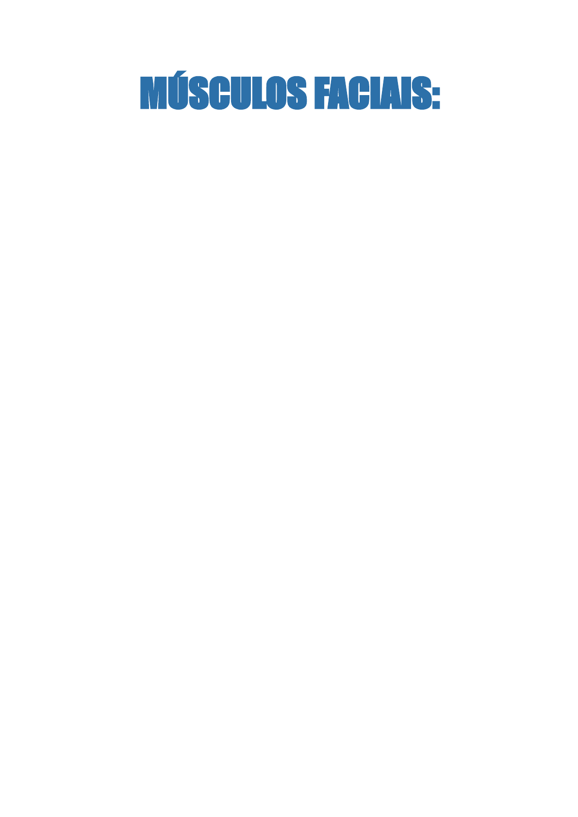 MÚSCULOS FACIAIS: Tud� o qu� vo�ê de�� sa��� ● Os músculos do nosso corpo são estruturas adaptadas para produzirem movimento, e na face não é diferente. Os músculos faciais abrangem cerca de 20 músculos esqueléticos e planos, que se localizam abaixo da pele do rosto. Portanto, a maior parte desses músculos se originam do crânio ou de estruturas fibrosas e se irradiam para a pele através de um tendão elástico. ● Diferentemente do restante dos músculos esqueléticos, os músculos da face não estão cercados por uma fáscia (exceto o músculo bucinador). Os músculos dessa região estão posicionados ao redor das aberturas do rosto (olhos, boca, nariz e ouvido), ou se estendem ao longo do crânio e pescoço. ● Então, neste texto vamos conversar um pouco sobre os músculos faciais: quantos temos, quais são eles e quais são suas origens e inserções, ações e funções. https://blogfisioterapia.com.br/o-que-e-origem-e-insercao-muscular/ Assim, estão descritos abaixo os músculos faciais que cada região abrange : ● Boca: músculo bucinador, músculo orbicular da boca, músculo risório, músculo mentoniano, músculo elevador do lábio superior, músculo depressor do lábio inferior, músculo elevador do lábio superior e da asa do nariz, músculo elevador do ângulo da boca, músculo depressor do ângulo da boca e músculos zigomáticos maior e menor ● Nariz: músculo nasal e músculo prócero. ● Palpebras: músculo orbicular do olho, músculo corrugador do supercílio e músculo depressor do supercílio. ● Ouvido externo: Músculos auriculares anterior, posterior e superior. ● Crânio e pescoço: musculatura epicraniana e músculo platisma. A finalidade dosmúsculos da face: ● A principal diferença entre os músculos da face e os outros músculos esqueléticos do corpo é que os músculos faciais não movimentam ossos e articulações, mas sim a pele. Entretanto, mesmo assim, em alguns casos tais músculos possuem uma relação óssea. ● Sendo assim, a localização desses músculos faciais permite que tenhamos diversos movimentos do rosto, que são conhecidos como mímica; movimentos como as expressões faciais. ● Também é importante saber que os músculos da face são inervados por ramos do nervo facial. Músculo Bucinador ● Este é um músculo acessório muito importante na mastigação. Ele mantém o alimento sob pressão direta dos dentes. Além disso, ele deprime e comprime as bochechas contra a mandíbula e maxila. ● Sua inervação vem de ramos bucais do nervo facial e ele se origina na superfície externa dos processos alveolares da maxila e se insere no ângulo da boca. Músculo Orbicular da boca ● Este músculo é responsável pelo fechamento direto dos lábios. O músculo orbicular da boca é inervado por ramos bucais do nervo facial. Além disso, sua origem é na parte marginal e labial da boca, e sua inserção se dá na rima da boca. Músculo Risório ● O músculo risório é um importante músculo da risada, uma vez que sua finalidade é retrair o ângulo da boca (riso forçado). Logo, ele se origina na fáscia do músculo masseter e se insere na pele do ângulo da boca. Também, o músculo risório é inervado pelos ramos mandibular e bucal do nervo facial. Músculo Mentoniano ● Este é um músculo que tem como ação principal elevar e projetar para fora o lábio superior e enrugar a pele do queixo. Ele tem origem na fossa incisiva da mandíbula e a sua inserção se dá na pele do queixo. A inervação deste músculo vem pelos ramos mandibular e bucal do nervo facial. Músculo Elevador do Lábio Superior ● Como o próprio nome diz, este músculo levanta o lábio superior e leva-o um pouco para frente. A inervação dele se dá pelos ramos bucais do nervo facial. O músculo elevador se origina na margem inferior da órbita acima do forame infra-orbital, maxila e zigomático. Além disso, ele se insere no lábio superior e na asa do nariz. Músculo Depressor do Lábio Inferior ● Este músculo repuxa o lábio inferior diretamente para baixo e lateralmente fazendo a expressão de ironia. Ele é inervado pelos ramos mandibular e bucal do nervo facial. Sua origem é na linha oblíqua da mandíbula e se insere na pele do lábio inferior. Músculo Elevador do Lábio Superior da Asa do Nariz ● Este é um músculo que dilata a narina e levanta o lábio superior e é inervado pelos ramos bucais do nervo facial. Sua origem é no processo frontal da maxila e sua inserção se divide em dois fascículos. Um se insere na cartilagem alar maior e na pele do nariz, e o outro se prolonga no lábio superior. Músculo Elevador do Ângulo da Boca ● Este músculo, como o próprio nome já diz, eleva o ângulo da boca e acentua o sulco nasolabial. Ele é inervado por ramos bucais do nervo facial, se origina na fossa canina (na maxila) e se insere no ângulo da boca. Músculo Depressor do Ângulo da Boca ● Este é um músculo que deprime o ângulo da boca, como o próprio nome explica, fazendo a expressão de tristeza. Sua inervação se dá pelos ramos mandibular e bucal do nervo facial. Além disso, ele se origina na língua oblíqua da mandíbula e se insere no ângulo da boca. Músculo ZigomáticoMaior ● O zigomático maior é um músculo que traciona o ângulo da boca para trás e para cima, responsável pela expressão de risada. Ele é inervado por ramos bucais do nervo facial; sua origem é na superfície malar do osso zigomático e ele se insere no ângulo da boca. Músculo ZigomáticoMenor ● Dentre os nossos músculos faciais, este é o que auxilia na elevação do lábio superior e acentua o sulco nasolabial. Ele é inervado por ramos bucais do nervo facial e sua origem se dá na superfície malar do osso zigomático e se insere no lábio inferior (mais especificamente entre o levantador do lábio superior e o zigomático maior). Músculo Nasal ● Também conhecido como transverso do nariz, este mús