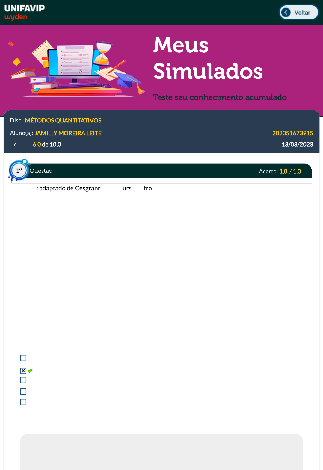 22/06/2023, 11:24 UNIFAVIP: Alunos https://simulado.wyden.com.br/alunos/ 1/8 Meus Simulados Teste seu conhecimento acumulado Disc.: MÉTODOS QUANTITATIVOS Aluno(a): JAMILLY MOREIRA LEITE 202051673915 Acertos: 6,0 de 10,0 13/03/2023 Acerto: 1,0 / 1,0 Fonte: adaptado de Cesgranrio, Concurso Petrobrás (2012), cargo: Analista de Pesquisa Operacional Júnior. Uma fábrica de móveis produz mesas, escrivaninhas e cadeiras de madeira, e todos esses produtos passam pelo setor de carpintaria. Se o setor de carpintaria se dedicasse apenas à fabricação de mesas, 1000 unidades seriam produzidas por dia; se o setor se dedicasse apenas à fabricação de escrivaninhas, 500 unidades seriam produzidas por dia; se o setor de carpintaria se dedicasse à fabricação de apenas cadeiras, seriam produzidas 1500 cadeiras por dia. Cada cadeira contribui em R$ 100,00 para o lucro da empresa, cada escrivaninha contribui em R$ 400,00, e cada mesa contribui em R$ 500,00 para o lucro da fábrica de móveis. Considere as seguintes variáveis inteiras como variáveis de decisão: X1 = quantidade de mesas produzidas; X2 = quantidade de cadeiras produzidas; X3 = quantidade de escrivaninhas produzidas. A fábrica de móveis deseja programar a sua produção de modo obter o maior lucro possível. A função objetivo desse problema é: Max Z=1000X1 + 500X2 + 1500X3 Max Z=500X1 + 100X2 + 400X3 Max Z=1000X1 + 1500X2 + 500X3 Max Z=X1 + X2 + X3 Max Z=500X1 + 400X2 + 100X3 Respondido em 13/03/2023 09:26:07 Explicação: A função objetivo desse problema é maximizar o lucro obtido pela fábrica. O lucro obtido por cada produto é diferente, então a função objetivo seria a soma dos lucros obtidos por cada produto multiplicado pela Questão1 a https://simulado.wyden.com.br/alunos/inicio.asp javascript:voltar(); 22/06/2023, 11:24 UNIFAVIP: Alunos https://simulado.wyden.com.br/alunos/ 2/8 quantidade produzida. O lucro obtido por cada mesa é de R$ 500,00, pelas cadeiras é de R$100,00 e pelas escrivaninhas é de R$400,00, então a função objetivo seria: Max Z=500X1 + 100X2 + 400X3 Acerto: 1,0 / 1,0 Foi desenvolvido um modelo para a análise de um problema complexo. Sabe-se que todas as variáveis de decisão desse modelo estão livres para assumir valores fracionais. Desse modo, pode-se a�rmar que esse modelo é: Estocástico Não linear Não inteiro Dinâmico Determinístico Respondido em 13/03/2023 09:26:43 Explicação: Um modelo é considerado não-inteiro quando as variáveis de decisão podem assumir valores fracionários. Isso signi�ca que a solução ótima pode não ser necessariamente um número inteiro, mas pode ser uma fração. Isso difere de um modelo inteiro, onde as variáveis de decisão devem ser números inteiros. Acerto: 1,0 / 1,0 (IBADE/2019) Na Programação Linear, a tarefa primordial é o reconhecimento e a formulação do problema de forma tal que ele possa ser trabalhado e, assim, fornecer um objetivo desejável a ser otimizado. O Método Grá�co da Programação Linear consiste em um sistema: de coordenadas ortogonais, onde se mostra um polígono convexo que contém os pontos representativos das possibilidades. de coordenadas ortogonais, onde se mostra um polígono convexo que não contém os pontos representativos das possibilidades. de coordenadas perpendiculares, onde se mostra um polígono côncavo que contém os pontos representativos das possibilidades. não coordenado, onde se mostra um polígono convexo que contém os pontos representativos das possibilidades. não coordenado, onde se mostra um polígono côncavo que contém os pontos representativos das possibilidades. Respondido em 13/03/2023 09:28:17 Explicação: O Método Grá�co da Programação Linear é uma técnica utilizada para resolver problemas de programação linear. Ele consiste em representar gra�camente as restrições do problema como equações lineares e encontrar a solução ótima como o ponto de interseção dessas equações, o qual estará dentro de um polígono convexo formado pelas equações. Esse método é geralmente utilizado para problemas pequenos e com poucas restrições, pois a complexidade aumenta rapidamente com o aumento do número de variáveis e restrições. Questão2 a Questão3 a 22/06/2023, 11:24 UNIFAVIP: Alunos https://simulado.wyden.com.br/alunos/ 3/8 Acerto: 1,0 / 1,0 (Adaptado de GOLDBARG; LUNA, 2005) A Tabela a seguir apresenta a proporção de cada material na mistura para a obtenção das ligas passíveis de fabricação por uma metalúrgica que deseja maximizar sua receita bruta. O preço está cotado em Reais por tonelada da liga fabricada. Também em toneladas estão expressas as restrições de disponibilidade de matéria-prima. A variável de decisão para a modelagem deste problema é xi que indica a quantidade em toneladas produzidas da liga especial de baixa resistência (i = 1) e especial de alta resistência (i = 2). Assim, a função objetivo deste problema é: Max f(x) = 5.000x1 + 3.000x2 Min f(x) = 5.000x1 + 3.000x2 Max f(x) = 0,25x1 + 0,50x2 Min f(x) = 3.000x1 + 5.000x2 Max f(x) = 3.000x1 + 5.000x2 Respondido em 13/03/2023 09:30:12 Explicação: A resposta certa é:Max f(x) = 3.000x1 + 5.000x2 Acerto: 0,0 / 1,0 Um fazendeiro está de�nindo a sua estratégia de plantio para as culturas de trigo, arroz e milho na próxima safra. A produtividade de sua terra para as culturas desejadas é: 0,3 kg/m² para o trigo; 0,4 kg/m² para o arroz; e 0,5 kg/m² para o milho. O lucro de produção é de 11 centavos por kg de trigo, 5 centavos por kg de arroz e 2 centavos por kg de milho. O fazendeiro dispõe de 400.000m² de área cultivável, sendo que, para atender às demandas de sua própria fazenda, deve ser plantado, no mínimo, 500m² de trigo, 1000m² de arroz e 20.000m² de milho. Ainda, devido à restrição de capacidade de armazenamento dos silos da fazenda, a produção está limitada a 100 toneladas. Adote a área a ser plantada como a variável de decisão p