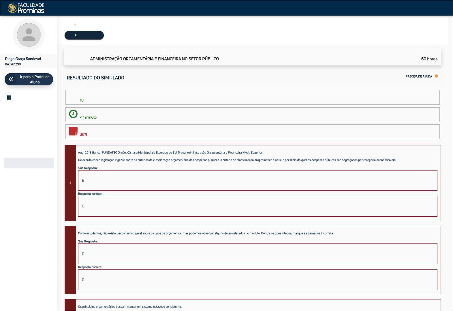 22/03/2023, 14:24 Simulado https://ava.institutoprominas.com.br/simulados/641b55942c927842b1f16f98/resultado 1/3 Extensão Curso ADMINISTRAÇÃO ORÇAMENTÁRIA E FINANCEIRA NO SETOR PÚBLICO Carga Horária 60 horas Início Resultado do Simulado HISTÓRICO RESULTADO DO SIMULADO PRECISA DE AJUDA Quantidade de questões:10 Tempo Gasto:< 1 minuto Seu aproveitamento foi:30% 1 Ano: 2018 Banca: FUNDATEC Órgão: Câmara Municipal de Eldorado do Sul Prova: Administração Orçamentária e Financeira Nível: Superior De acordo com a legislação vigente sobre os critérios de classificação orçamentária das despesas públicas, o critério de classificação programática é aquele por meio do qual as despesas públicas são segregadas por categoria econômica em: Sua Resposta: Elemento de Despesa e Desdobramento da Despesa. Resposta correta: Correntes e de Capital. 2 Como estudamos, não existe um consenso geral sobre os tipos de orçamentos, mas podemos observar alguns deles relatados no módulo. Dentre os tipos citados, marque a alternativa incorreta: Sua Resposta: O orçamento Clássico ou Orçamento Tradicional era visto como bidimensional, uma vez que apresentava duas funções de controle. Resposta correta: O Orçamento-Programa não associa as oportunidades ou problemas ao objetivo. Os princípios orçamentários buscam manter um sistema estável e consistente. Ir para o Portal doAluno Diego Graça Sandoval RA: 261290 Início Avaliações Material Didático Notas Agenda Educacional Simulados Curso Preparatório https://ava.institutoprominas.com.br/dashboard https://alunos.institutoprominas.com.br/ https://ava.institutoprominas.com.br/dashboard https://ava.institutoprominas.com.br/atividades https://ava.institutoprominas.com.br/material-didatico https://ava.institutoprominas.com.br/notas https://ava.institutoprominas.com.br/agenda-educacional https://ava.institutoprominas.com.br/simulados https://ava.institutoprominas.com.br/preparatorio https://ava.institutoprominas.com.br/ 22/03/2023, 14:24 Simulado https://ava.institutoprominas.com.br/simulados/641b55942c927842b1f16f98/resultado 2/3 3 Marque a alternativa que não está de acordo com esses princípios: Sua Resposta: No princípio da publicidade, as decisões orçamentárias só têm validade após sua publicação na imprensa. Resposta correta: O princípio que não tem como função principal limitar o conteúdo da Lei Orçamentária é o princípio da exclusividade. 4 Ano: 2018 Banca: FUNDATEC Órgão: Câmara Municipal de Eldorado do Sul Prova: Administração Orçamentária e Financeira Nível: Superior A despesa orçamentária será efetivada por meio do cumprimento de estágios. Em relação aos estágios da despesa pública, assinale a alternativa INCORRETA. Sua Resposta: A Liquidação consiste na verificação do direito do devedor, pelos fornecimentos feitos ou serviços prestados, à vista dos títulos e documentos comprobatórios do respectivo crédito. É o estágio do lançamento da despesa, que se caracteriza pelo atestado de recebimento da obra, bens, materiais ou serviços, objeto do contrato com o poder público. Resposta correta: A Liquidação consiste na verificação do direito do devedor, pelos fornecimentos feitos ou serviços prestados, à vista dos títulos e documentos comprobatórios do respectivo crédito. É o estágio do lançamento da despesa, que se caracteriza pelo atestado de recebimento da obra, bens, materiais ou serviços, objeto do contrato com o poder público. 5 A atividade fiscal tem o objetivo de promover e disponibilizar recursos para custeio dos investimentos públicos. Sobre essa atividade, é correto afirmar que: Sua Resposta: Na Teoria Clássica, a tributação gera impactos positivos sobre a economia, ao contrário da dívida adquirida pelo Estado. Resposta correta: A Lei de Responsabilidade Fiscal implantou mecanismos de controle e transparência fiscal. 6 Ano: 2018 Banca: VUNESP Órgão: URBANISMO Prova: Administração Orçamentária e Financeira Nível: Superior A aplicação das diversas políticas econômicas a fim de promover o emprego, o desenvolvimento e a estabilidade, diante da incapacidade do mercado em assegurar o atingimento de tais objetivos, é a função do governo denominada Sua Resposta: estabilizadora. Resposta correta: estabilizadora. 22/03/2023, 14:24 Simulado https://ava.institutoprominas.com.br/simulados/641b55942c927842b1f16f98/resultado 3/3 7 As despesas públicas têm um papel fundamental na Gestão Pública, pois é através dela que conseguimos mensurar a qualidade dos gastos públicos, bem como estabelecer limites por meio de legislação. De acordo com essa afirmação, assinale a alternativa incorreta: Sua Resposta: O Orçamento da Seguridade Social abrange todas as entidades e órgãos a ela vinculados. Resposta correta: O plano orçamentário tem a finalidade de contestar etapas até a sua conclusão. 8 Estudamos que o ciclo orçamentário é o processo sequencial do orçamento público, os créditos adicionais são despesas autorizadas que não são previstas na Lei Orçamentária Anual, e o orçamento participativo é um instrumento que permite a participação dos cidadãos nas discussões orçamentárias. Sendo assim, é correto afirmar que: Sua Resposta: A execução orçamentária e financeira é uma das fases do ciclo orçamentário. Resposta correta: A execução orçamentária e financeira é uma das fases do ciclo orçamentário. 9 Ano: 2018 Banca: UFRJ Órgão: ANTT Prova: Administração Orçamentária e Financeira Nível: Superior A classe representa o conjunto de eventos de uma mesma natureza. De acordo com a tabela de eventos a classe 40 representa: Sua Resposta: restos a pagar; Resposta correta: empenho de despesa; 10 A palavra receita é utilizada mundialmente pela área contábil para indicar uma variação positiva na situação líquida patrimonial. Sendo assim, é correto afirmar que: Sua Resposta: As receitas podem ser classificada