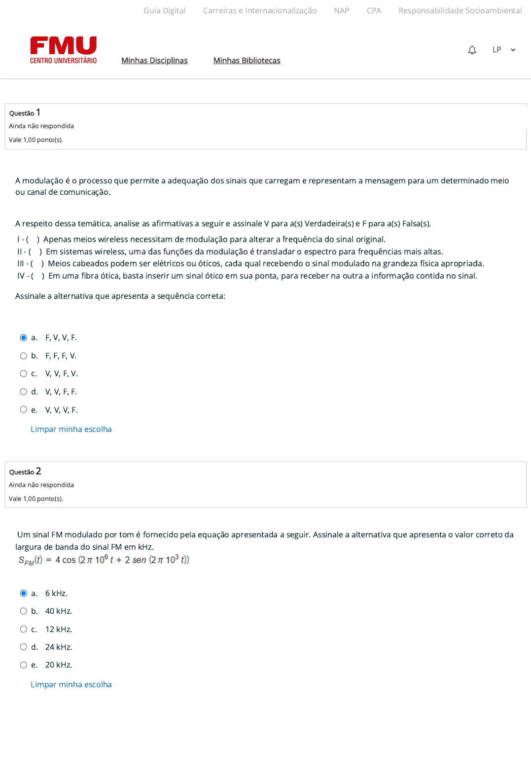 22/06/2023, 20:06 N2 (A5) https://ambienteacademico.com.br/mod/quiz/attempt.php?attempt=2653119&cmid=792083#question-2937508-10 1/5 Questão 1 Ainda não respondida Vale 1,00 ponto(s). Questão 2 Ainda não respondida Vale 1,00 ponto(s). A modulação é o processo que permite a adequação dos sinais que carregam e representam a mensagem para um determinado meio ou canal de comunicação. A respeito dessa temática, analise as a�rmativas a seguir e assinale V para a(s) Verdadeira(s) e F para a(s) Falsa(s). I - ( ) Apenas meios wireless necessitam de modulação para alterar a frequência do sinal original. II - ( ) Em sistemas wireless, uma das funções da modulação é transladar o espectro para frequências mais altas. III - ( ) Meios cabeados podem ser elétricos ou óticos, cada qual recebendo o sinal modulado na grandeza física apropriada. IV - ( ) Em uma �bra ótica, basta inserir um sinal ótico em sua ponta, para receber na outra a informação contida no sinal. Assinale a alternativa que apresenta a sequência correta: a. F, V, V, F. b. F, F, F, V. c. V, V, F, V. d. V, V, F, F. e. V, V, V, F. Limpar minha escolha Um sinal FM modulado por tom é fornecido pela equação apresentada a seguir. Assinale a alternativa que apresenta o valor correto da largura de banda do sinal FM em kHz. a. 6 kHz. b. 40 kHz. c. 12 kHz. d. 24 kHz. e. 20 kHz. Limpar minha escolha Guia Digital Carreiras e Internacionalização NAP CPA Responsabilidade Socioambiental Minhas Disciplinas Minhas Bibliotecas LP https://codely-fmu-content.s3.amazonaws.com/Moodle/GuiaDigital/Guia+digital/index.html https://carreiras.fmu.br/ https://codely-fmu-content.s3.amazonaws.com/Moodle/NAP/inicial/nap/fmu/index.html https://codely-fmu-content.s3.amazonaws.com/Moodle/CPA/landing_CPA/index.html https://portal.fmu.br/sustentabilidade https://ambienteacademico.com.br/ https://ambienteacademico.com.br/ https://ambienteacademico.com.br/course/view.php?id=236 22/06/2023, 20:06 N2 (A5) https://ambienteacademico.com.br/mod/quiz/attempt.php?attempt=2653119&cmid=792083#question-2937508-10 2/5 Questão 3 Ainda não respondida Vale 1,00 ponto(s). Questão 4 Ainda não respondida Vale 1,00 ponto(s). As transformadas de Fourier são convenientes para observar os vários componentes de frequência contidos em um sinal. A partir de um número N de amostras espaçadas de forma semelhante à transformada de Fourier, é possível recuperar um sinal x’(n), que é a soma das repetições necessariamente periódicas do sinal discreto original x(n). Considerando o conteúdo apresentado no enunciado, analise as asserções a seguir e a relação proposta entre elas. I. As amostras da transformada de Fourier podem fornecer uma representação efetiva e discreta da frequência para um sinal de comprimento �nito no tempo. POIS II. Essa representação só é válida se o número N de amostras da transformada de Fourier for maior ou igual ao comprimento L do sinal original. Assinale a alternativa correta. a. A asserção I é uma proposição verdadeira, e a asserção II é uma proposição falsa. b. As asserções I e II são proposições verdadeiras, e a II é uma justi�cativa correta da I. c. A asserção I é uma proposição falsa, e a II é uma proposição verdadeira. d. As asserções I e II são proposições falsas. e. As asserções I e II são proposições verdadeiras, mas a II não é uma justi�cativa correta da I. Limpar minha escolha A propagação de sinal modulado, por meio de ondas eletromagnéticas de radiofrequência, oferece a vantagem da mobilidade e a presença dispersa por toda uma região. Assinale a alternativa correta. a. Sinais por ondas eletromagnéticas estão sujeitos a variações dos fenômenos de propagação e podem ter comportamento e resultados variáveis. b. O alcance de sistemas de comunicação em RF pelo ar está limitado a poucos quilômetros, não sendo adequado para comunicação intercontinental. c. Comunicação wireless é possível apenas na faixa de radiofrequência, limitando muito o espectro e a capacidade. d. Os ruídos estão muito presentes nos sistemas de RF, pois o espectro já está poluído por diversos serviços. e. RF pelo ar oferece a vantagem de abranger uma área com garantias de atendimento. Limpar minha escolha Guia Digital Carreiras e Internacionalização NAP CPA Responsabilidade Socioambiental Minhas Disciplinas Minhas Bibliotecas LP https://codely-fmu-content.s3.amazonaws.com/Moodle/GuiaDigital/Guia+digital/index.html https://carreiras.fmu.br/ https://codely-fmu-content.s3.amazonaws.com/Moodle/NAP/inicial/nap/fmu/index.html https://codely-fmu-content.s3.amazonaws.com/Moodle/CPA/landing_CPA/index.html https://portal.fmu.br/sustentabilidade https://ambienteacademico.com.br/ https://ambienteacademico.com.br/ https://ambienteacademico.com.br/course/view.php?id=236 22/06/2023, 20:06 N2 (A5) https://ambienteacademico.com.br/mod/quiz/attempt.php?attempt=2653119&cmid=792083#question-2937508-10 3/5 Questão 5 Ainda não respondida Vale 1,00 ponto(s). Questão 6 Ainda não respondida Vale 1,00 ponto(s). A essência da comunicação está na oportunidade de transferir e distribuir conhecimento. Para realizar essa tarefa, o sistema de comunicação precisa utilizar um meio para conectar as partes e sinais protocolados, para carregar a mensagem. Com base no exposto acima, assinale a alternativa correta. a. Os sinais são a informação codi�cada, formados por elementos agrupados em símbolos. b. Sinais são funções matemáticas que representam organizadamente uma mensagem, preferencialmente, com informação. c. A informação, ou a mensagem, é transmitida em paralelo com os sinais; em um sistema de comunicação, alteram os sinais de forma aleatória. d. Mensagem, informação e conhecimento são sinônimos. São formados por elementos agrupados que podem ser entendidos. e. Informação e conhecimento são imateriais, não contabilizáveis. Mensagem se conta pelo número 