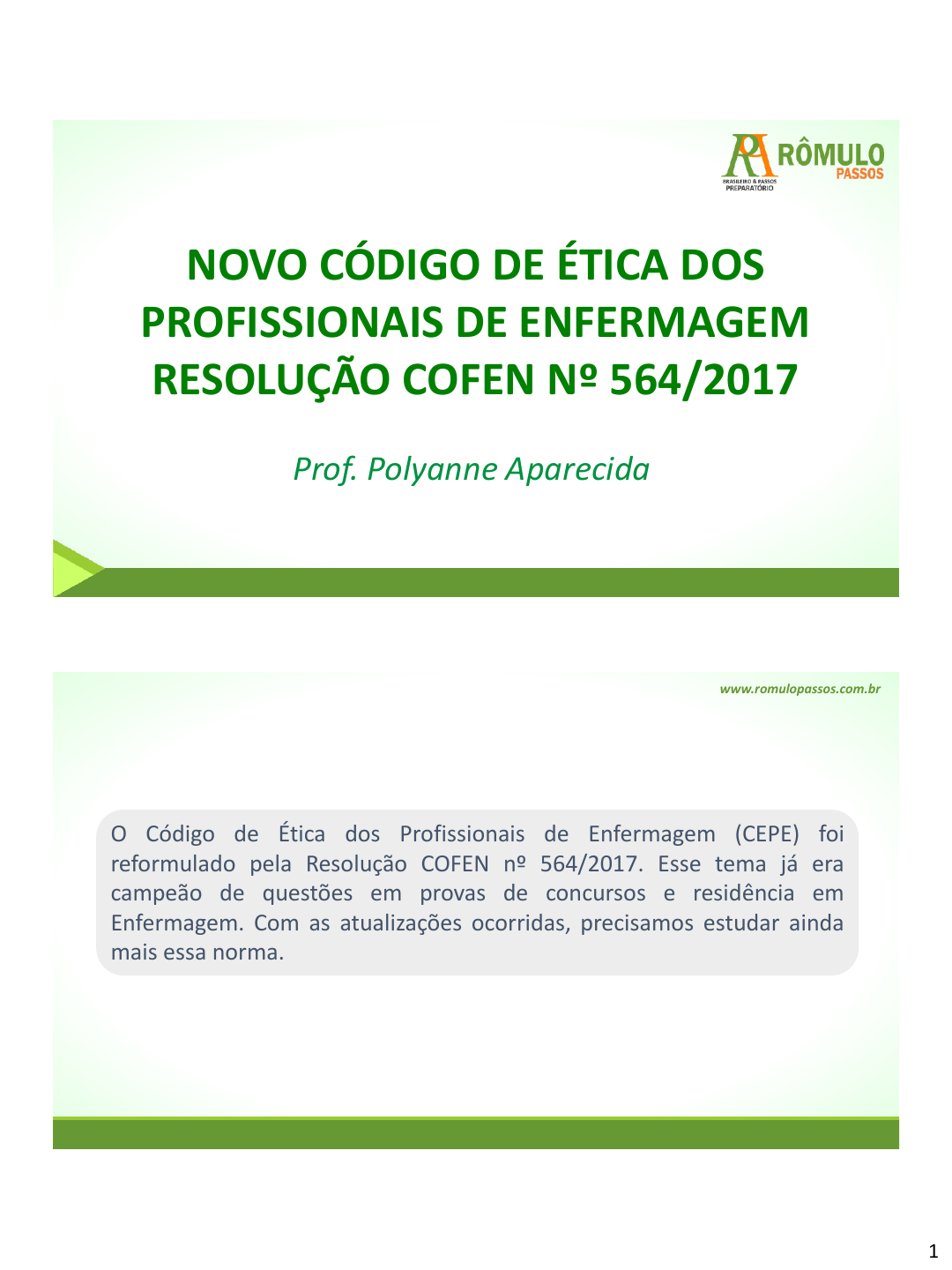 1 NOVO CÓDIGO DE ÉTICA DOS PROFISSIONAIS DE ENFERMAGEM RESOLUÇÃO COFEN Nº 564/2017 Prof. Polyanne Aparecida www.romulopassos.com.br O Código de Ética dos Profissionais de Enfermagem (CEPE) foi reformulado pela Resolução COFEN nº 564/2017. Esse tema já era campeão de questões em provas de concursos e residência em Enfermagem. Com as atualizações ocorridas, precisamos estudar ainda mais essa norma. Maria Sinthya Pinho Araujo - 04361703370 2 www.romulopassos.com.br O novo CEPE apresenta estrutura diferente do anterior. Agora, temos cinco capítulos, conforme descrição a seguir: Capítulo I – Dos Direitos Capítulo II – Dos Deveres Capítulo III – Das Proibições Capítulo IV – Das Infrações e Penalidades Capítulo V – Da Aplicação das Penalidades www.romulopassos.com.br O capítulo II trata apenas dos deveres, não havendo a referência expressa também de responsabilidade. Todavia, sabemos que são termos semelhantes. Vamos abordar neste capítulo os principais dispositivos de cada capítulo para fins de concurso e Residência na Enfermagem, especialmente as atualizações do novo CEPE. Maria Sinthya Pinho Araujo - 04361703370 3 www.romulopassos.com.br 1. (Câmara Legislativa- DF/FCC/2018) A Resolução do Conselho Federal de Enfermagem n° 564/2017 aprovou o novo Código de Ética dos profissionais de enfermagem, considerando várias legislações, sendo uma delas a a) Portaria n° 399, de 22 de fevereiro de 2006 (Pacto pela Saúde). b) Lei n° 8.078, de 11 de setembro de 1990 (Código do Consumidor). c) Resolução n° 237, de 19 de dezembro de 1997 (Meio ambiente). d) Resolução RDC n° 306, de 7 de dezembro de 2004 (Gerenciamento de resíduos de serviços de saúde). e) Lei n° 11.340, de 07 de agosto de 2006 (Lei Maria da Penha). www.romulopassos.com.br 2. (SETRABES /UERR/2018) A Resolução COFEN Nº 564/2017, que aprova o novo Código de Ética dos Profissionais de Enfermagem, aplica-se para quais profissionais? Marque a alternativa correta: a) Aplica-se para Enfermeiros e Técnicos de Enfermagem. b) Aplica-se para Enfermeiros, Técnicos de Enfermagem, Parteiras e Agente comunitários de Saúde. c) Aplica-se aos Enfermeiros, Técnicos de Enfermagem e Auxiliares de Enfermagem. Maria Sinthya Pinho Araujo - 04361703370 4 www.romulopassos.com.br 2. (SETRABES /UERR/2018) d) Aplica-se aos Enfermeiros, Técnicos de Enfermagem, Auxiliares de Enfermagem, Parteiras, Atendentes de Enfermagem e Cuidadores de idosos. e) Aplica-se aos Enfermeiros, Técnicos de Enfermagem, Auxiliares de Enfermagem, Obstetrizes e Parteiras, bem como aos atendentes de Enfermagem. Capítulo I – Dos Direitos www.romulopassos.com.br Prof. Polyanne Aparecida Maria Sinthya Pinho Araujo - 04361703370 5 www.romulopassos.com.br Art. 1º - Exercer a enfermagem com liberdade Segurança técnica científica ambiental autonomia e ser tratado sem discriminação de qualquer natureza, segundo os princípios e pressupostos legais, éticos e dos direitos humanos. www.romulopassos.com.br Art. 2º Exercer atividades em locais de trabalho livre de riscos e danos e violências física e psicológica à saúde do trabalhador, em respeito à dignidade humana e à proteção dos direitos dos profissionais de enfermagem. Maria Sinthya Pinho Araujo - 04361703370 6 www.romulopassos.com.br Aprimorar seus conhecimentos Art. 6º - Dos Direitos Aprimorar seus conhecimentos Art. 55º - Dos Deveres técnico-científicos; ético-políticos; socioeducativos; históricos; culturais; técnico-científicos; ético-políticos; socioeducativos; culturais; que dão sustentação à prática profissional. e do desenvolvimento da profissão. em benefício da pessoa, família e coletividade www.romulopassos.com.br Você pode observar que a qualificação profissional do profissional de enfermagem para dar sustentação à prática profissional é um direito, enquanto que para o beneficio da pessoa, família e coletividade e do desenvolvimento da profissão é um dever. Maria Sinthya Pinho Araujo - 04361703370 7 www.romulopassos.com.br Art. 8º - Requerer ao COREN de forma FUNDAMENTADA medidas cabíveis para obtenção de desagravo público; em decorrência de ofensa sofrida no exercício profissional ou que atinja a profissão. www.romulopassos.com.br Art. 11 Formar e participar da Comissão de Ética de Enfermagem, bem como de comissões interdisciplinares da instituição em que trabalha. Art. 12 Abster-se de revelar informações confidenciais de que tenha conhecimento em razão de seu exercício profissional. Maria Sinthya Pinho Araujo - 04361703370 8 www.romulopassos.com.br Aplicar o PROCESSO DE ENFERMAGEM Art. 14 instrumento metodológico p/ planejar, implementar, avaliar e documentar o cuidado à pessoa, família e coletividade. www.romulopassos.com.br Cuidado para não confundir! De acordo com o art. 37 do CEPE, é dever do profissional de Enfermagem: documentar formalmente as etapas do PROCESSO DE ENFERMAGEM, em consonância com sua competência legal. Maria Sinthya Pinho Araujo - 04361703370 9 www.romulopassos.com.br 3. (UFAL/COPEVE/2018) Em 2017, o COFEN publicou a Resolução nº. 0564/2017, que revisa o Código de Ética Profissional de Enfermagem – CEPE. Versa como um dos DIREITOS do profissional de enfermagem: a) cumprir a legislação de pesquisa quando envolver seres humanos. b) prestar a Assistência de Enfermagem isenta de discriminação de qualquer natureza. c) conhecer, cumprir e fazer cumprir o Código de Ética dos Profissionais de Enfermagem www.romulopassos.com.br 3. (UFAL/COPEVE/2018) d) cumprir prescrição a distância independentemente do contexto de prestação de cuidados. e) participar da prática multiprofissional, interdisciplinar e transdisciplinar com responsabilidade, autonomia e liberdade, observando os preceitos éticos e legais da profissão. Maria Sinthya Pinho Araujo - 04361703370 10 www.romulopassos.com.br 4. (AL-GO/IADES/2019) Segundo o Código de Ética dos Profissionais de E