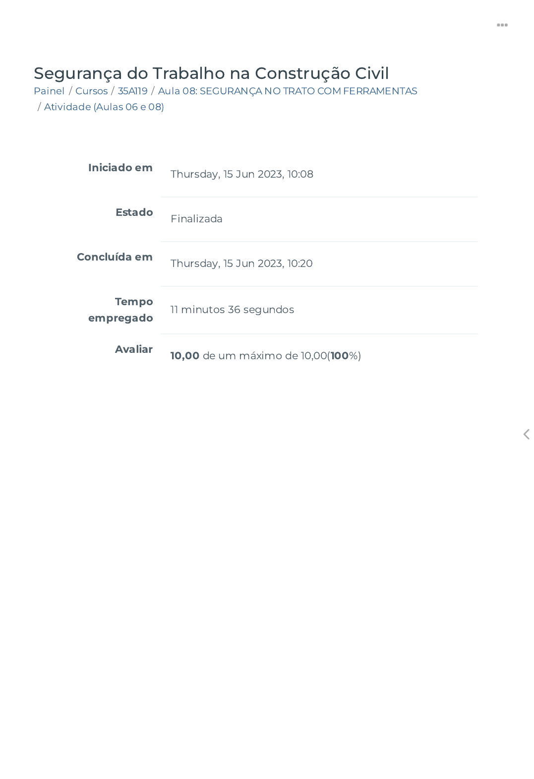 15/06/2023, 10:20 Atividade (Aulas 06 e 08) https://ava.politecnicabr.com.br/mod/quiz/review.php?attempt=5050461 1/12 Painel / Cursos / 35A119 / Aula 08: SEGURANÇA NO TRATO COM FERRAMENTAS / Atividade (Aulas 06 e 08) Segurança do Trabalho na Construção Civil Iniciado em Thursday, 15 Jun 2023, 10:08 Estado Finalizada Concluída em Thursday, 15 Jun 2023, 10:20 Tempo empregado 11 minutos 36 segundos Avaliar 10,00 de um máximo de 10,00(100%) https://ava.politecnicabr.com.br/my/ https://ava.politecnicabr.com.br/course/index.php https://ava.politecnicabr.com.br/course/view.php?id=1041 https://ava.politecnicabr.com.br/course/view.php?id=1041#section-10 https://ava.politecnicabr.com.br/mod/quiz/view.php?id=32277 https://ava.politecnicabr.com.br/ 15/06/2023, 10:20 Atividade (Aulas 06 e 08) https://ava.politecnicabr.com.br/mod/quiz/review.php?attempt=5050461 2/12 Questão 1 Correto Atingiu 1,00 de 1,00 Cabe a imposição de regras de comportamento visando eliminar ou minimizar oportunidades para ocorrência de acidentes com as ferramentas. Marque a alternativa que não corresponde as regras. Escolha uma opção: a. ambientes de trabalho sujos e/ou em desordem ampliam as chances de eventos indesejados em razão dos riscos não percebidos. b. ao apontar ou operar máquinas em direção às pessoas, tenha atenção. c. nas operações com ferramentas elétricas em locais úmidos, adote plataformas ou tapetes isolantes. d. não utilize adornos ( joias, crachás etc.), roupas folgadas e outros acessórios que possam provocar arrastamento pelas partes em movimento das ferramentas. e. segure-as sempre com �rmeza, para evitar que escapem das mãos, em especial as de alta rotação. https://ava.politecnicabr.com.br/ 15/06/2023, 10:20 Atividade (Aulas 06 e 08) https://ava.politecnicabr.com.br/mod/quiz/review.php?attempt=5050461 3/12 Questão 2 Correto Atingiu 1,00 de 1,00 Assinale (V) Verdadeiro ou (F) Falso. ( ) De acordo com a Resolução n. 357/CONAMA que estabelece diretrizes, critérios e procedimentos para a gestão dos resíduos da construção civil, esses podem ser originados das atividades de construção, reforma, reparos e demolições de estruturas e estradas, bem como por aqueles resultantes da remoção de vegetação e escavação de solo. Escolha uma opção: Verdadeiro Falso https://ava.politecnicabr.com.br/ 15/06/2023, 10:20 Atividade (Aulas 06 e 08) https://ava.politecnicabr.com.br/mod/quiz/review.php?attempt=5050461 4/12 Questão 3 Correto Atingiu 1,00 de 1,00 Assinale (V) Verdadeiro e (F) Falso, canteiro de obra. ( ) ambiente de produção (o canteiro de obras) sofre ou precisa sofrer contínuas modi�cações para poder acompanhar a dinâmica da evolução do produto em obtenção. ( ) Por de�nição, de acordo com o constante na NBR 12284/1991, o canteiro de obras é o “Conjunto de áreas destinadas à execução e apoio dos trabalhos da indústria da construção, dividindo-se em áreas operacionais e áreas de vivência”. ( ) Ao longo das fases da obra até a sua conclusão, o canteiro de obras e suas utilidades deverão responder às necessidades de áreas e facilidades especí�cas requeridas para o processamento seguro e racional da produção civil. ( ) Além das facilidades de ordem, limpeza e arrumação, um bom arranjo físico para o canteiro de obras – e o seu adequado dimensionamento – permitirá uma melhor visualização dos espaços e condução das atividades em desenvolvimento na obra, contribuindo para aprimorar o seu controle e gerenciamento, inclusive quanto ao patrimônio material envolvido. Escolha uma opção: a. V, V, F, V b. F, F, F, V c. V, F, F, V d. V, V, V, V e. F, V, F, V https://ava.politecnicabr.com.br/ 15/06/2023, 10:20 Atividade (Aulas 06 e 08) https://ava.politecnicabr.com.br/mod/quiz/review.php?attempt=5050461 5/12 Questão 4 Correto Atingiu 1,00 de 1,00 Assinale (V) Verdadeiro ou (F) Falso refente ao texto abaixo. As ferramentas mesmo as manuais mais simples, podem oferecer riscos em razão de sua utilização (uso indevido, quedas etc.) e preservação inadequadas, pelo que se requer rígido controle quanto ao emprego, guarda e conservação dessas, sendo, portanto, desejável quali�cação especí�ca para a satisfação dessas funções. Neste sentido, adverte a NR 18: ( ) devem ser apropriadas ao uso a que se destinam, proibindo- se o emprego das defeituosas, dani�cadas ou improvisadas, devendo ser substituídas pelo empregador ou responsável pela obra. Escolha uma opção: Verdadeiro Falso https://ava.politecnicabr.com.br/ 15/06/2023, 10:20 Atividade (Aulas 06 e 08) https://ava.politecnicabr.com.br/mod/quiz/review.php?attempt=5050461 6/12 Questão 5 Correto Atingiu 1,00 de 1,00 Ferramentas portáteis, diferenciadas de acordo com o modo de seu acionamento. Marque a alternativa adequada. Escolha uma opção: a. pneumáticas (ou com motores de combustão, p. ex. motosserras). b. operadas com pólvora (pistola de pregos, por ex.). c. hidráulicas (martelete, furadeira...). d. elétricas (torno de �xação, cunha hidráulica etc.). https://ava.politecnicabr.com.br/ 15/06/2023, 10:20 Atividade (Aulas 06 e 08) https://ava.politecnicabr.com.br/mod/quiz/review.php?attempt=5050461 7/12 Questão 6 Correto Atingiu 1,00 de 1,00 Para DÍAZ (1997: 362-363), as principais causas de acidentes com ferramentas podem ser agrupadas como decorrentes de: Marque a alternativa incorreta. Escolha uma opção: a. conservação e manutenção e�cientes. b. abandono de ferramentas em lugar perigoso. c. uso de ferramentas defeituosas. d. Uso de ferramentas inadequadas para a tarefa a realizar ou seleção da ferramenta. https://ava.politecnicabr.com.br/ 15/06/2023, 10:20 Atividade (Aulas 06 e 08) https://ava.politecnicabr.com.br/mod/quiz/review.php?attempt=5050461 8/12 Questão 7 Correto Atingiu 1,00 de 1,00 Assinale (V) Verdadeiro ou (F) Falso. ( ) Águas servidas deverá se dar em contenedores com um capacidade mínima de 100 (cem) litros ou s