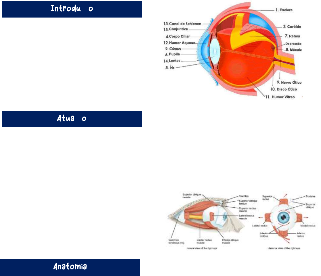 1 Oftalmologia veterinária É uma especialidade dedicada a manutenção da saúde ocular visando principalmente a restituição da visão. Na veterinária a visão é nosso principal objetivo, e infelizmente por conta da fala a agente acaba pegando muitos casos tardios, um exemplo é o glaucoma que é uma doença dentro da oftalmologia pior, e nos nossos pacientes pegamos isso muito tardio, e por eles não falar não dizem que tem a perda do campo visual, ou se tem uma dor de cabeça. Clínica, cirurgias na oftalmologia consegue se dedicar a microcirurgias, cirurgia geral, ultrassom ocular, exame eletrorretinografia (ERG) que é mais especifico e avalia se a retina estar funcionando bem ou não, e serve também como um exame de catarata, tem a opção de área de pesquisas, sendo assim uma medicina muito ampla. É um órgão bem complexo, e consegue lidar com tudo dentro do olho, e ver processos inflamatórios, é possível avaliar a parte sistêmica − A Dra contou que se apaixonou pela área porque foi através dos olhos que detectou uma piometra. A paciente tinha uma inflamação intraocular O olho possui uma túnica fibrosa que é a parte da córnea (área transparente), esclera, túnica vascular que pega a íris (parte colorida do olho), , o corpo ciliar garante que o olho recebe quantidades adequadas de líquido humor aquoso, o qual fornece nutrição para os tecidos e ajuda a manter a quantidade certa de pressão dentro do globo ocular, coroide que fica internamente ao olho, e a parte nervosa que é a parte principal do olho sendo a retina e nervo ótico (parte vascular que gera a imagem e faz o impulso elétrico que vai pro SNC) Existe também algumas musculaturas: M. reto dorsal, M. reto ventral, lateral e medial, e alguns músculos oblíquos que faz o movimento de rotação ocular (para cima e para baixo, lateral), e é preciso entender bem essa muscular para fazer uma boa cirurgia. Ex: fazer uma remoção ocular: Faz a ressecção de todos os músculos para depois conseguir remover todo bulbo ocular, e ter uma noção da parte de anatomia é o básico para ter uma percepção da via ocular 3 Túnicas • Fibrosa – córnea e esclera • Vascular – íris, corpo ciliar e coroide • Nervosa – retina e nervo óptico Músculos extraoculares • M. retos – dorsal, ventral medial e lateral • M. oblíquos – dorsal e ventral • M. retrator do bulbo ocular Os nervos cranianos estão muito envolvidos na parte ocular, tanto o que leva a visão, tanto de movimentação, tanto palpebral, como de forma ocular e ciliar da contração da pupilar de abrir e fechar, e tem essa responsabilidade por conta dos pares de nervos cranianos. De 12 pares de nervos cranianos 6 são responsáveis. çã çã 2 As glândulas são a principal e de terceira pálpebra estar 50% envolvido com a produção da via lacrimal, e nela tem a glândula e a cartilagem presente. A glândula meibomio e células caliciformes são responsáveis pela produção lacrimal, e faz a forma lipídica, aquosa e gordurosa desse olho Nervos cranianos • II óptico • III oculomotor • IV troclear • V trigêmeo • VI abducente Glândula principal e da terceira pálpebra • Glândula meibômio • Células caliciformes A glândula lacrimal quando disseca não tem como observar a glândula principal tão bem, mais a anatomia na literatura ela fica descrita no canto temporal, e a glândula da terceira pálpebra que fica retraída No ducto lacrimal, toda lagrima que é produzida pela glândula principal ou terceira pálpebra ela faz a lubrificação da córnea e do olho como um todo, e drena tanto no ducto inferior como no superior e gera no nariz, por isso sentimos a lagrima quando choramos. Em algumas raças braquiocefalicas esse ducto é muito tortuoso. Todo ser é capaz de ver uma parte/campo visual de coloração, e os animais falamos que são dicromáticos conseguindo ver dois campos de coloração, sendo mais visto o campo verde, azul e cinza, já os humanos têm uma visão tricromatica com um campo de visão maior para coloração. Os animais conseguem ver colorido, so que é uma visão mais pobre de cor, e o papagaio tem sempre uma visão cromática podendo ver até 5 tipos de cores Em toda área se inicia pela anamnese, e para o exame oftálmico específico é importante e essencial principalmente na rotina alguns aparelhos para oftalmologia, e são eles: Biomicroscopia que é uma lâmpada de fenda, sendo aquela que avalia o paciente com magnificação e consegue ver alguns detalhes como se tem relevo, se a córnea está profunda por conta de uma úlcera de córnea, consegue avaliar o grau de catarata, então é ampliar, visto que a catarata estar so na capsula posterior ou não, se estar na capsula posterior e assim consegue magnificar, á 3 Tonometria é muito avaliado para pressão intraocular, e tem alguns tipos de tonometro no mercado hoje em dia, e esse aparelho encosta na córnea e encontra o sopro no olho sendo o mesmo de humano que já foi em oftalmo e fez esse tipo de exame, e avaliamos a pressão intraocular parar ver se tem glaucoma ou uveite (inflamação) Teste lacrimal de Shirmer é um teste de padrão ouro para avaliar se o animal tem um olho seco. O olho seco nos cães está relacionado com algo imunológico, e os braquiocefalicos tem essa deficiência, principalmente os alérgicos que já tem o comprometimento imunológico, com esse teste de Shirmer consegue quantificar na fita e entender se tem alguma deficiência ou se ta produzindo de mais e as vezes tem uma lesão de córnea O reflexo visual avalia os pares de nervos cranianos para ver se o animal é visual, e faz alguns testes de obstáculos, ofuscamento como jogar uma luz forte no olho para ver se fecha, e esse teste não indica a visão e se o animal fecha a gente sabe que um dos pares de nervo craniano ta de boa funcionalidade. RPL é o reflexo pupilar direto e indireto que é que ele pisca quando jogar aa luz e pisca a pupila com u