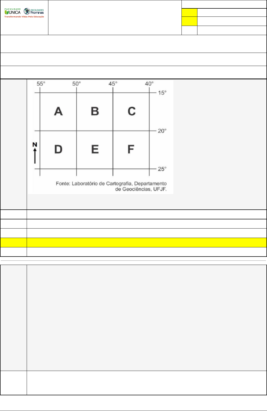 Pincel Atômico - 24/06/2023 12:35:55 1/3 ELIELSON SOUZA SILVA Exercício Caminho do Conhecimento - Etapa 3 (16234) Atividade finalizada em 16/06/2023 17:30:15 (965587 / 1) LEGENDA Resposta correta na questão # Resposta correta - Questão Anulada X Resposta selecionada pelo Aluno Disciplina: PESQUISA E PRÁTICA INTERDISCIPLINAR: CARTOGRAFIA, GEOGRAFIA URBANA E DA POPULAÇÃO [534047] - Avaliação com 4 questões, com o peso total de 1,67 pontos [capítulos - 1] Turma: Segunda Graduação: Segunda Graduação 6 meses - Licenciatura em Geografia - Grupo: FPD-FEV2022 - SGegu0A161122 [77029] Aluno(a): 91375829 - ELIELSON SOUZA SILVA - Respondeu 4 questões corretas, obtendo um total de 1,67 pontos como nota [354780_460 86] Questão 001 Considerando as referências espaciais esboçadas na figura acima, é possível afirmar que: o quadrante C está nos hemisférios setentrional e ocidental. o quadrante E está nos hemisférios setentrional e meridional. o quadrante D está nos hemisférios meridional e oriental. X o quadrante B está nos hemisférios meridional e ocidental. o quadrante A está nos hemisférios setentrional e oriental. [354779_460 77] Questão 002 “As representações espaciais estão presentes na vida do Homem, antes mesmo da escrita e da fala. Por meio de símbolos e desenhos é que o Homem representa suas primeiras apreensões do real, em que delimita e ocupa efetivamente o seu território (MORALES, 2008). No entanto, com o avanço das técnicas cartográficas e por meio do uso de recursos modernos que possibilitaram o Homem a ocupar os diversos lugares da Terra, criando cidades, estados, e outros fenômenos e objetos, a representação espacial passou a ganhar formas mais precisas por meio de representações cartográficas mais próximas do real”. Fonte: http://gaptaufpa.blogspot.com.br/2011/11/representacao-espacial-e-linguagem.html. Assinale a alternativa que melhor interpreta o significado das representações cartográficas na atualidade. O mapa é uma construção humana de simplificação do espaço real e, como uma ferramenta de comunicação, possui modos de transmitir as mensagens/informações, independentemente do nível de conhecimento de seus elaboradores e leitores. Pincel Atômico - 24/06/2023 12:35:55 2/3 Os produtos cartográficos (mapas, globos, croquis, etc.) ao longo de sua história passaram a ser utilizados para diversos fins, sempre de forma impessoal e imparcial. X um mapa nada mais é do que uma simplificação da realidade, onde o elaborador expressa, por meio de técnicas de desenho e um conhecimento das geometrias dos lugares, a representação dos objetos e fenômenos que se apresentam no espaço geográfico. no momento de se elaborar um produto cartográfico, o elaborador deverá optar pela forma de representação compatível para cada objeto, sem a necessidade de se preocupar com a escala de trabalho, sendo que o tipo de representação dependerá do tipo do objeto. Estas representações simbólicas foram sendo aperfeiçoadas com o advento das fotografias aéreas (satélites) e, posteriormente, com o desenvolvimento de imagens de sensores remotos embarcados em satélites (aerofotogrametria). [354780_460 81] Questão 003 A origem da geografia militar é prática, ligada a necessidade dos exércitos transporem os territórios inimigos. “Ela é definida como campo de estudo em 1832, pelo francês Théophile Lavalée, antes da geografia acadêmica, centrada em aspectos humanos e políticos”, aponta Ribeiro. “Cabe lembrar que questões geográficas ligadas a guerra estavam presentes muito antes, em textos de pensadores como Sun Tzu e Maquiavel, e ganharam destaque com as campanhas de Napoleão, no início do século 19”. O maior desenvolvimento da geografia militar acontece com as duas Guerras Mundiais no século 20, marcadas pelas disputas territoriais entre países. Porém, a Segunda Guerra Mundial (1939-1945) também leva a geografia a perder importância no planejamento militar, que passa a priorizar aspectos como logística, inteligência e estratégica. “O surgimento do conflito entre Estados Unidos e União Soviética (Guerra Fria), após 1945, aumenta a importância da geopolítica, mais focada em aspectos ideológicos, ocupando o lugar da geografia militar”, diz o geógrafo. Disponível em http://www.usp.br/agen/?p=31397. Desprivilegiada em meio ao mundo técnico-científico-informacional, a Geografia nunca perdeu a sua importância dentro das estruturas de defesa e inteligência dos Estado Nacionais, visto que a ocupação de uma determinada área está diretamente ligada a quantidade de recursos minerais identificados por sensoriamento remoto. estratégia de avanço das tropas está ligada as condições meteorológicas do local de origem e chegada. X compreensão do território e suas características físicas e sociais são determinantes para a formulação de estratégias e ações de ataque, defesa e diplomacia. formulação e interpretação de mapas é determinante para o avanço de fronteiras. leitura de escalas pode facilitar o cálculo de combustível utilizados pelos equipamentos de transporte. Pincel Atômico - 24/06/2023 12:35:55 3/3 [354779_460 79] Questão 004 Um grande divertimento para os turistas que passam pelo Observatório Real de Greenwich, nos arredores de Londres, é tirar fotografias com um pé de cada lado da representação do Meridiano de Greenwich. Esse Meridiano foi definido como o meridiano principal da Terra, o grau zero da longitude, em uma reunião realizada em Washington, em 1884. A linha de 0º de longitude define: a divisão da Terra em hemisfério norte e sul. a divisão entre a região tropical e a temperada. a divisão entre a região polar e temperada. X a divisão da Terra em hemisfério leste e oeste. a divisão da Terra em hemisfério meridional e setentrional.
