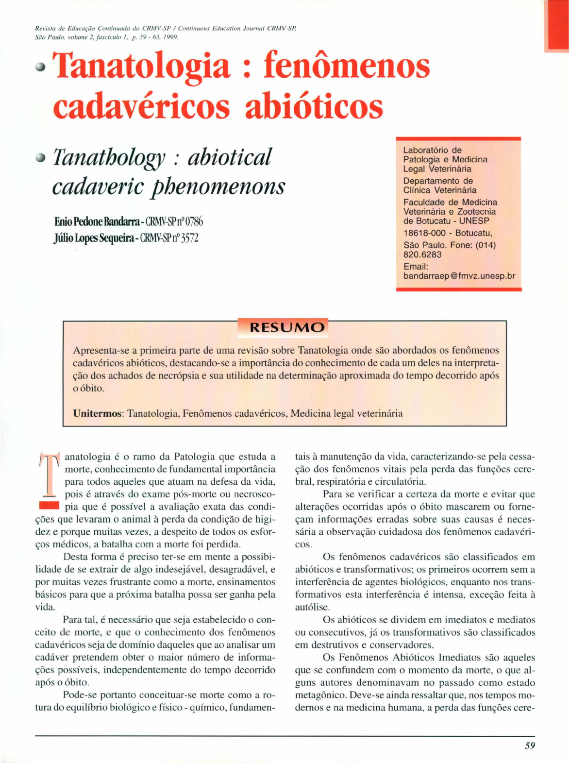Revista de EdLlcaçe;o ContinLlada do CRMV-SP / ContinuoLls Education JaLmwl CRMV-SP, Seio PaLllo. volLlme 2JascícLllo /. p. 59 - 63. /999. Tanatologia : fenômenos cadavéricos abióticos Tanathology : abiotical cadaveric phenomenons Enio Pedone Bandarra-CRMV-SP n° 0786 Júlio Lopes Sequeira-CRMV-SP n° 3572 I RESUMO Laboratório de Patologia e Medicina Legal Veterinária Departamento de Clínica Veterinária Faculdade de Medicina Veterinária e Zootecnia de Botucatu - UNESP 18618-000 - Botucatu, São Paulo. Fone: (014) 820.6283 Email: bandarraep@fmvz.unesp.br Apresenta-se a primeira parte de uma revisão sobre Tanatologia onde são abordados os fenômenos cadavéricos abióticos, destacando-se a importância do conhecimento de cada um dele na interpreta- ção dos achados de necrópsia e sua utilidade na determinação aproximada do tempo decorrido após o óbito. Unitermos: Tanatologia, Fenômenos cadavéricos, Medicina legal veterinária 'l "\ anatologia é o ramo da Patologia que estuda a morte, conhecimento de fundamental importância para todos aqueles que atuam na defesa da vida, ~ pois é através do exame pós-morte ou necrosco- - pia que é possível a avaliação exata das condi- ções que levaram o animal à perda da condição de higi- dez e porque muitas vezes, a despeito de todos os esfor- ços médicos, a batalha com a morte foi perdida. Desta forma é preciso ter-se em mente a possibi- lidade de se extrair de algo indesejável, desagradável, e por muitas vezes frustrante como a morte, ensinamentos básicos para que a próxima batalha possa ser ganha pela vida. Para tal, é necessário que seja estabelecido o con- ceito de morte, e que o conhecimento dos fenômenos cadavéricos seja de dominio daqueles que ao analisar um cadáver pretendem obter o maior número de informa- ções possíveis, independentemente do tempo decorrido após o óbito. Pode-se portanto conceituar-se morte como a ro- tura do equilíbrio biológico e físico - químico, fundamen- tais à manutenção da vida, caracterizando-se pela ces a- ção dos fenômenos vitais pela perda das funções cere- bral, respiratória e circulatória. Para se verificar a certeza da morte e evitar que alterações ocorridas após o óbito mascarem ou forne- çam informações erradas sobre suas causas é neces- sária a observação cuidadosa dos fenômenos cadavéri- cos. Os fenômenos cadavéricos são classificados em abióticos e transformativos; os primeiros ocorrem sem a interferência de agentes biológicos, enquanto nos trans- formativos esta interferência é intensa, exceção feita à autólise. Os abióticos se dividem em imediatos e mediatos ou consecutivos, já os transformativos são classificados em destrutivos e conservadores. Os Fenômenos Abióticos Imediatos são aqueles que se confundem com o momento da morte, o que al- guns autores denominavam no passado como estado metagônico. Deve-se ainda ressaltar que, nos tempos mo- dernos e na medicina humana, a perda das funções cere- 59 BANDARRA, E. P.; SEQUEIRA, J. L. Tanatologia: fenômenos cadavéricos abióticos. Revista de Educação Continuada do CRMV-SP I COIl/;IlUOUS Educa/;on JourI1a/ CRMV-SP. São Paulo, volume 2, fascículo I, p. 59 - 63, 1999. brais, a chamada morte cerebral é a determinante deste estado. Os fenômenos cadavéricos abióticos imediatos são: perda da consciência; desaparecimento dos movimentos e do tonus muscular, perda dos movimentos respiratórios e dos batimentos cardíacos, perda da ação reflexa a estí- mulos táteis, térmicos e dolorosos e perda das funções cerebrais. Somente o conjunto destes fenômenos caracteri- zam a morte, uma vez que, isoladamente, com exceção da perda das funções cerebrais, podem ser produzidos ou ocasionados por ação de substâncias químicas ou por vários tipos de processos mórbidos. Os fenômenos abióticos consecutivos são os se- guintes: desidratação, resfriamento do corpo, manchas de hipostase, rigidez cadavérica, coagulação do sangue, alterações oculares e autólise. Todos eles ocorrem em virtude da parada total das atividades metabólicas do organismo e da prevalência de fenômenos físicos a que estão sujeitos todos os corpos inertes. Deve-se destacar que as condições em que ocor- reu a morte a sim como o local da mesma causam, de maneira geral, alterações significativas no desenrolar dos fenômenos cadavéricos, havendo necessidade, portanto, de uma análise criteriosa de todos os dados obtidos para que se possa evitar interpretações er- rôneas. Desidratação A perda passiva de liquidos corpóreos, também denominada evaporação cadavérica, depende fundamen- talmente de fatores ambientais, tais como: temperatura ambiente, presença ou ausência de correntes de ar, in- tensidade das mesmas, umidade relativa do ar e meio em que se encontra o cadáver. As condições pregres- sas do animal antes do óbito também exercem papel importante no processo, o que requer um cuidado espe- cial na avaliação correta deste fenômeno, evitando-se erros de interpretação indesejáveis. A desidratação ca- davérica é melhor observada nos globos oculares e na perda de elasticidade da pele, devendo-se destacar que em virtude do decúbito do animal o processo ocorrido após a morte não se apresenta de forma uniforme por todo o tegumento. Resfriamento do cadáver Em virtude da ausência de atividade metabólica, um cadáver não produz nem mantém o calor, de forma 60 que a temperatura corpórea tende a se equilibrar com a temperatura ambiente. Esta perda de calor é, em média, de cerca de um grau centígrado por hora. Alguns fatores influenciam este fenômeno aumen- tando ou diminuindo este tempo; assim devem ser consi- derada a espécie e condições do cadáver, pois animais de grande porte tendem a perder calor mais lentamente que os de pequeno porte, da mesma forma os ruminantes não apresentam um resfriamento completo, pois os fenô- menos de fermentaç