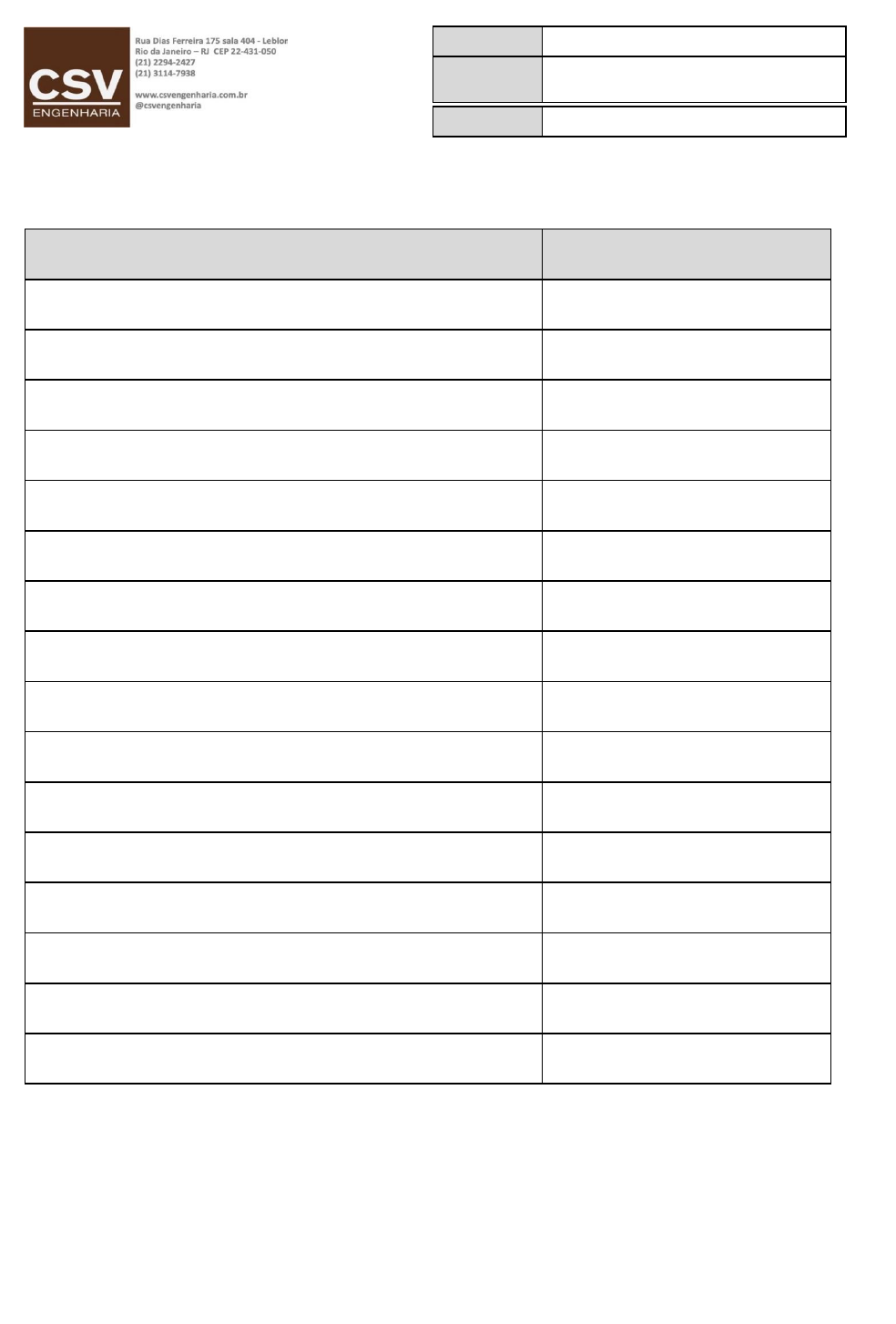Cliente: Local: Data: Teste das máquinas de ar condicionado Teste de torneiras (água fria e quente) Teste de duchinhas (água fria e quente) Teste de sifões Teste de registros (água fria e quente) Teste de descargas e bacias sanitárias Limpar ralos e fazer testes Auxiliar o cliente sobre deixar reserva de revestimentos para futuras manutenções Atividades Identificação do QDL Entrega do Manual do Proprietário com o As Built Identificação das chaves TÉRMINO DE OBRA Limpeza da obra Revisão dos interruptores e tomadas Status Teste do aquecedor Identificação dos controles de ar condicionado Teste de chuveiros (água fria e quente) Page 1