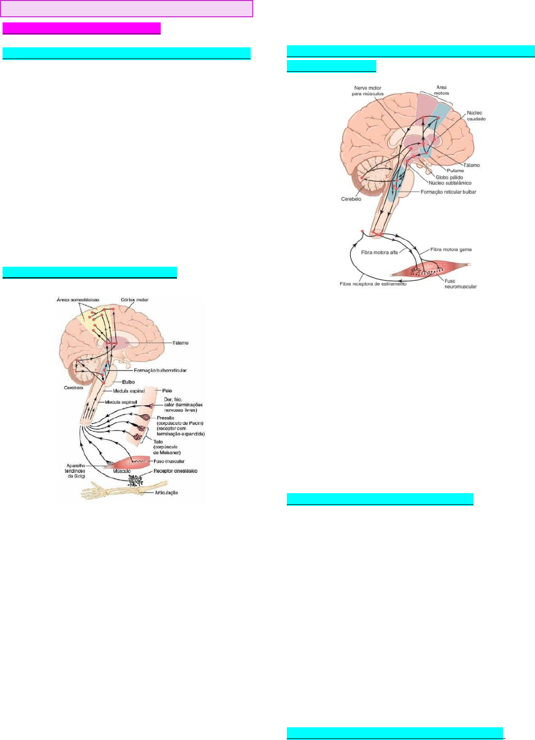 TUTORIAL II – MÓDULO VI PLANO GERAL DO SISTEMA NERVOSO DIVISÃO SENSORIAL DO SN – OS RECEPTORES SENSORIAIS: muitas atividades do SN se iniciam pelas experiências sensoriais que excitam os receptores sensoriais, sejam nos olhos, receptores auditivos, táteis ou outros. Essas experiências podem provocar reações cerebrais imediatas ou podem ser armazenadas no cérebro (memoria) por minutos, semanas ou anos. A porção somática do SN transmite a informação sensorial vinda de receptores localizados em toda superfície corporal e algumas estruturas profundas. Essa informação chega ao SNC pelos nervos periféricos e é conduzida para varias áreas sensoriais localizadas na medula espinhal, na formação reticular do bulbo, da ponte e do mesencéfalo, no cerebelo, no tálamo e em áreas do córtex cerebral. DIVISÃO MOTORA DO SN – OS EFETORES: o papel mais importante do SN é o de controlar as atividades do corpo, sendo realizada pelo controle da contração dos músculos esqueléticos, da contração da musculatura lisa e da secreção de substâncias químicas pelas glândulas endócrinas e exócrinas. Essas atividades são coletivamente chamadas de funções motoras, e os músculos e as glândulas são chamados de efetores, pois são as estruturas que efetuam as funções ditadas pelos sinais nervosos. Tem-se o neuroeixo motor “esquelético” do SN que controla a contração desse tipo muscular. Operando em paralelo a esse eixo, tem-se o sistema nervoso autônomo SNA, que exerce controle da musculatura lisa, das glândulas e outros sistemas internos do corpo. Os músculos esqueléticos podem ser controlados por diferentes parte do SNC, incluindo a medula espinhal, a formação da substancia reticular bulbar, pontina e mesencefálica, pelos gânglios da base, pelo cerebelo e pelo córtex motor. As estruturas inferiores controlam movimentos automáticos e instantâneos, e as regiões superiores controlam movimentos musculares complexos, deliberados, controlados por processos cognitivos cerebrais. PROCESSAMENTO DE INFORMAÇÕES – FUNÇÃO INTEGRATIVA DO SN: deve ser processada a informação aferentes, de modo que sejam efetuadas respostas mentais e motoras apropriadas. Sabe-se que mais de 99% das informações sensoriais é descartada pelo cérebro como irrelevante e sem importância. Mas, quando importante, a informação sensorial excita nossa mente e é canalizada para regiões integrativas e motoras. Tanto a canalização, quanto o processamento da informação, é chamada de funções integrativas do SN. Assim, se a pessoa encostar a mão no fogo, a resposta instantânea é afastar a mão, seguido de respostas associadas como afastar o corpo inteiro ou até gritar de dor. PAPEL DAS SINAPES NO PROCESSAMENTO: a sinapse é o ponto de contato entre um neurônio e o neurônio seguinte. Elas determinam as direções em que os sinais nervosos vão se distribuir pelo SN, sendo umas com facilidade e outras com dificuldade. Deve-se considerar que sinais facilitatórios e inibitórios vindos de outras áreas do SN podem controlar a transmissão sináptica, algumas vezes abrindo a sinapse e outras vezes, fechando. Alguns neurônios pós-sinápticos respondem com grande numero de impulsos, enquanto outras respondem com apenas alguns. Desse modo, as sinapses executam ação seletiva, algumas vezes bloqueando sinais fracos para que sinais fortes passem, e outros momentos selecionando e amplificando sinais fracos, e com frequência transmitindo tais sinais em muitas direções em vez de restringi-los á direção única. ARMAZENAMENTO DE INFORMAÇÃO – MEMÓRIA: apenas poucas informações sensoriais relevantes provocam resposta motora imediata, logo a maior parte é armazenada para o controle futuro das atividades motoras e para uso nos processos cognitivos. A maior parte desse armazenamento ocorre no córtex cerebral e mesmo as regiões subcorticais do encéfalo e a medula espinhal podem armazenar pequena quantidade de informação. Esse armazenamento é chamado de memoria e também é função exercida pelas sinapses. Cada vez que determinado sinal sensorial passa por sequencia de sinapses, essas sinapses ficam mais capazes de transmitir o mesmo sinal, ocorrendo o fenômeno chamado de facilitação. Quando muito facilitados, os sinais, gerados pelo próprio SNC, podem promover a transmissão de impulsos pela mesma sequencia de sinapses até na ausência da experiência sensorial. Isso da a sensação de estar experimentando as sensações originais, mas são apenas memorias das sensações. Uma vez armazenadas como memoria, elas fazem parte do mecanismo do processamento do cérebro para uso futuro forma de “pensamento”, ou seja, os processos cognitivos cerebrais comparam as novas experiências sensoriais com as memorias armazenadas. Desse modo, as memorias ajudam a selecionar nova informação sensorial importante e transferi-las ás áreas apropriadas de armazenamento da informação, para uso futuro, ou para áreas motoras, com o intuito de provocar respostas efetoras imediatas. PRINCIPAIS NÍVEIS FUNCIONAIS DO SNC o sistema nervoso humano herdou capacidades funcionais especiais de cada um dos estágios evolutivos humanos. NÍVEL MEDULAR: mesmo em situações em que a medula espinhal foi seccionada em níveis cervicais, muitas de suas funções altamente organizadas continuam sendo executadas. Os circuitos neurais intrínsecos da medula são responsáveis por movimento de marcha, reflexos que afastam o corpo de objetos que causam dor, reflexos que enrijecem as pernas contra a gravidade, reflexos que controlam os vasos sanguíneos locais, movimentos gastrointestinais e excreção urinária. Logo, os níveis supraespinhais do SN enviam sinais aos centros de controle da medula espinhal, comandando esses centros para que realizem suas funções. NÍVEL CEREBRAL INFERIOR OU SUBCORTICAL: as regiões encefálicas subcorticais (bulbo, ponte, mesencéfalo, hipotálamo, tálamo, cere