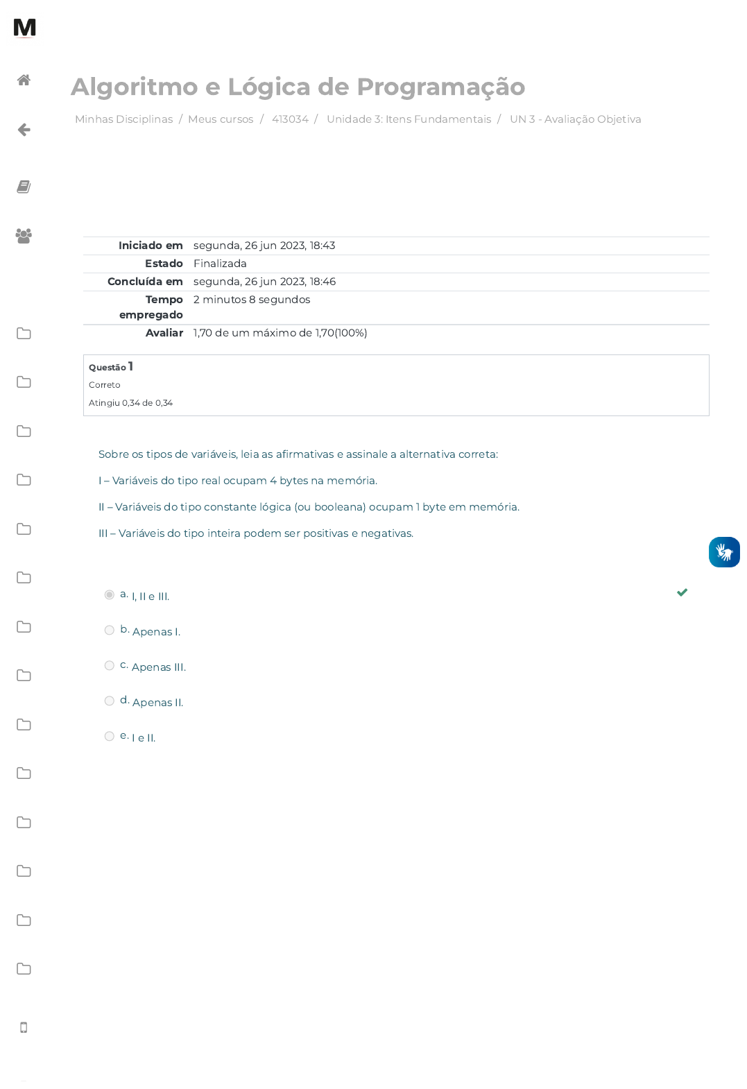 26/06/2023, 18:46 UN 3 - Avaliação Objetiva: Revisão da tentativa https://avap.multivix.edu.br/mod/quiz/review.php?attempt=3401052&cmid=1305803 1/4 Minhas Disciplinas / Meus cursos / 413034 / Unidade 3: Itens Fundamentais / UN 3 - Avaliação Objetiva Algoritmo e Lógica de Programação Iniciado em segunda, 26 jun 2023, 18:43 Estado Finalizada Concluída em segunda, 26 jun 2023, 18:46 Tempo empregado 2 minutos 8 segundos Avaliar 1,70 de um máximo de 1,70(100%) Questão 1 Correto Atingiu 0,34 de 0,34 Sobre os tipos de variáveis, leia as a�rmativas e assinale a alternativa correta: I – Variáveis do tipo real ocupam 4 bytes na memória. II – Variáveis do tipo constante lógica (ou booleana) ocupam 1 byte em memória. III – Variáveis do tipo inteira podem ser positivas e negativas. a. I, II e III. b. Apenas I. c. Apenas III. d. Apenas II. e. I e II. https://avap.multivix.edu.br/my/ https://avap.multivix.edu.br/course/view.php?id=20039 https://avap.multivix.edu.br/course/view.php?id=20039§ion=4 https://avap.multivix.edu.br/mod/quiz/view.php?id=1305803 https://avap.multivix.edu.br/my/ https://avap.multivix.edu.br/course/view.php?id=20039 https://avap.multivix.edu.br/user/index.php?id=20039 https://avap.multivix.edu.br/course/view.php?id=20039§ion=1 https://avap.multivix.edu.br/course/view.php?id=20039§ion=2 https://avap.multivix.edu.br/course/view.php?id=20039§ion=3 https://avap.multivix.edu.br/course/view.php?id=20039§ion=4 https://avap.multivix.edu.br/course/view.php?id=20039§ion=5 https://avap.multivix.edu.br/course/view.php?id=20039§ion=6 https://avap.multivix.edu.br/course/view.php?id=20039§ion=7 https://avap.multivix.edu.br/course/view.php?id=20039§ion=8 https://avap.multivix.edu.br/course/view.php?id=20039§ion=9 https://avap.multivix.edu.br/course/view.php?id=20039§ion=10 https://avap.multivix.edu.br/course/view.php?id=20039§ion=11 https://avap.multivix.edu.br/course/view.php?id=20039§ion=12 https://avap.multivix.edu.br/course/view.php?id=20039§ion=13 https://avap.multivix.edu.br/course/view.php?id=20039§ion=14 https://avap.multivix.edu.br/hooks/portal/ https://avap.multivix.edu.br/mod/page/view.php?id=1252%2F%22%20target%3D%22_blank https://avap.multivix.edu.br/ 26/06/2023, 18:46 UN 3 - Avaliação Objetiva: Revisão da tentativa https://avap.multivix.edu.br/mod/quiz/review.php?attempt=3401052&cmid=1305803 2/4 Questão 2 Correto Atingiu 0,34 de 0,34 Sendo A=5, B=3 e C=7, analise as condições a seguir e marque a opção correta no que tange ao resultado da avaliação de cada condição. (V é verdadeiro e F é falso): 1. (A+B) = C 2. (B+C) < A 3. C < A*B 4. (B+C) = 2*A 5. (C/B) > A Escolha uma opção: a. F-V-V-V-F b. F-F-V-V-F c. F-V-F-V-F d. F-F-V-V-V e. V-F-V-V-F https://avap.multivix.edu.br/my/ https://avap.multivix.edu.br/course/view.php?id=20039 https://avap.multivix.edu.br/user/index.php?id=20039 https://avap.multivix.edu.br/course/view.php?id=20039§ion=1 https://avap.multivix.edu.br/course/view.php?id=20039§ion=2 https://avap.multivix.edu.br/course/view.php?id=20039§ion=3 https://avap.multivix.edu.br/course/view.php?id=20039§ion=4 https://avap.multivix.edu.br/course/view.php?id=20039§ion=5 https://avap.multivix.edu.br/course/view.php?id=20039§ion=6 https://avap.multivix.edu.br/course/view.php?id=20039§ion=7 https://avap.multivix.edu.br/course/view.php?id=20039§ion=8 https://avap.multivix.edu.br/course/view.php?id=20039§ion=9 https://avap.multivix.edu.br/course/view.php?id=20039§ion=10 https://avap.multivix.edu.br/course/view.php?id=20039§ion=11 https://avap.multivix.edu.br/course/view.php?id=20039§ion=12 https://avap.multivix.edu.br/course/view.php?id=20039§ion=13 https://avap.multivix.edu.br/course/view.php?id=20039§ion=14 https://avap.multivix.edu.br/hooks/portal/ https://avap.multivix.edu.br/mod/page/view.php?id=1252%2F%22%20target%3D%22_blank https://avap.multivix.edu.br/ 26/06/2023, 18:46 UN 3 - Avaliação Objetiva: Revisão da tentativa https://avap.multivix.edu.br/mod/quiz/review.php?attempt=3401052&cmid=1305803 3/4 Questão 3 Correto Atingiu 0,34 de 0,34 Questão 4 Correto Atingiu 0,34 de 0,34 Sobre os tipos de variáveis, leia as a�rmativas e assinale a alternativa correta: I - Tipo inteiro é qualquer número inteiro, negativo, nulo ou positivo. II - Tipo real é qualquer número real, ou seja, valores com ponto decimal (ou ponto �utuante). III - Tipo caractere é a variável do tipo literal caractere usado para armazenar múltiplos caracteres. a. Apenas II. b. I e III. c. I, II e III. d. I e II. e. Apenas I. Considere o algoritmo acima apresentado. Ao executar o mesmo, a saída na tela será Escolha uma opção: a. 2, 4, 8 e 8. b. 0. c. 1. d. 2, 4, 8, 16 e 16. e. 0, 0, 0, 0 e 0. https://avap.multivix.edu.br/my/ https://avap.multivix.edu.br/course/view.php?id=20039 https://avap.multivix.edu.br/user/index.php?id=20039 https://avap.multivix.edu.br/course/view.php?id=20039§ion=1 https://avap.multivix.edu.br/course/view.php?id=20039§ion=2 https://avap.multivix.edu.br/course/view.php?id=20039§ion=3 https://avap.multivix.edu.br/course/view.php?id=20039§ion=4 https://avap.multivix.edu.br/course/view.php?id=20039§ion=5 https://avap.multivix.edu.br/course/view.php?id=20039§ion=6 https://avap.multivix.edu.br/course/view.php?id=20039§ion=7 https://avap.multivix.edu.br/course/view.php?id=20039§ion=8 https://avap.multivix.edu.br/course/view.php?id=20039§ion=9 https://avap.multivix.edu.br/course/view.php?id=20039§ion=10 https://avap.multivix.edu.br/course/view.php?id=20039§ion=11 https://avap.multivix.edu.br/course/view.php?id=20039§ion=12 https://avap.multivix.edu.br/course/view.php?id=20039§ion=13 https://avap.multivix.edu.br/course/view.php?id=20039§ion=14 https://avap.multivix.edu.br/hooks/portal/ https://avap.multivix.edu.br/mod/page/view.php?id=1252%2F%22%20target%3D%22_blank https://avap.multivix.edu.br/ 26/06/2023, 18:46 UN 3 - Avaliação Objetiva: Revisão da tentativa https://avap.multivix.edu.br/mod/quiz