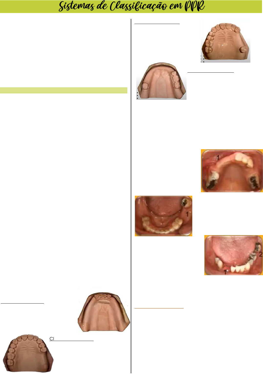 Ana Maria Ramos – PPR 2022.2 A classificação tem uma finalidade didática, facilidade na comunicação entre profissionais e técnicos e sistematização do desenho e do tratamento, pois para uma determinada denominação Classe I, por exemplo, o modo de raciocínio para a PPR será diferente para uma Classe III. Há 65.534 combinações possíveis considerando arco superior e inferior, com relação aos espaços protéticos existentes. Cerca de 60 classificações já foram propostas, sendo por aspectos biomecânicos, biológicos etc. CLASSIFICAÇÕES → Critério Funcional Considerando um paciente dentado, quando é mastigado um alimento sobre os dentes, ele está envolto no seu alvéolo com ligamentos periodontais. Esse periodonto serve como amortecedor ao impacto dessa mastigação e essa força acaba indo para o osso subjacente. Quando os pacientes começam a perder os dentes, os dentes que sobram começam a receber mais carga do que deveria. Dependendo do tamanho do espaço protético haverá uma variação de como essa carga será transmitida ao osso. A PPR fica entre a situação de uma prótese fixa (dentossuportadas) e uma total (mucossuportadas). A indicação da PPR é muito versátil, no entanto a complexidade e a maneira que ela irá funcionar irá variar da quantidade de dentes que esse paciente terá. Dessa forma, o transporte das cargas pode ser tanto via dente (dentosuportada), quanto via fibromucosa (mucosuportada), sendo consideradas dento- mucosuportada. → Critério Topográfico Classificação de Kennedy Foi sugerida em 1925, porém ainda hoje é a mais utilizada, pois se baseia na posição dos espaços edentados em relação aos dentes remanescentes no arco. É considerada simples e abrangente. Classe I de Kennedy Espaços protéticos bilaterais e situados atrás dos dentes suportes. Casos clássicos dentomucossuportados. Classe II de Kennedy Espaço protético unilateral e situado atrás dos dentes suportes. Classe III de Kennedy Espaços protéticos intercalar e unilateral. Classe IV de Kennedy Espaço protético inteiramente anterior aos suportes e que ultrapassa a linha mediana. Existem algumas modificações dessa classificação de Kennedy, onde outros espaços protéticos além dos principais serão considerados suplementares. Nesse caso, foram incorporadas as regras de Applegate. Modificação de Applegate No caso da imagem, o lado direito será utilizado na classificação de Kennedy (Classe III), no entanto ela não é pura, tendo mais um espaço protético, sendo chamada de Classe III com modificação 1. Na segunda imagem, temos uma Classe II de Kennedy, com modificação 1. Nesse último caso, temos uma Classe II de Kennedy com mais dois espaços protéticos, sendo nomeada de Classe II de Kennedy, com modificação II. Obs.: Quando vamos nomear os espaços protéticos, vamos nomear a Classe com números romanos e a modificação em algarismos arábicos. REGRAS DE APPLEGATE 1- A classificação geral deve ser feita após o preparo de boca, visto que novas exodontias poderão alterá- la. O paciente de prótese deve estar todo pronto (sem casos de exodontia, endodontia, restaurações no geral etc.); 2- Se o terceiro molar estiver ausente, não se deve levar em consideração a área edentada correspondente, pois eles não serão recolocados; 3- Se os terceiros molares estiverem presentes e forem Ana Maria Ramos – PPR 2022.2 utilizados como suportes, devem ser considerados na classificação; 4- A área correspondente aos segundos molares ausentes não será considerada na classificação, caso eles não sejam reposicionados. O segundo molar não é reposicionado em alguns casos, principalmente se não tem um antagonista; 5- Quando existirem áreas edentadas adicionais no mesmo arco, a área ou áreas mais posteriores determinam a classificação; 6- As áreas edentadas agregadas às que determinam a classificação primária, indicam-se como modificações dessa classe e são identificadas por um número; 7- A extensão da modificação não influencia em nada, o fator determinante é o número dos espaços protéticos. 8- Só as classes I,II e III podem ter modificações, visto que na classe IV as áreas edentadas adicionais seriam posteriores, portanto definiriam a definição. CLASSIFICAÇÃO ICK (IMPLANT-CORRECTED KENNEDY) Usa a classificação de Kennedy como base. REGRAS 1- Os espaços edêntulos que serão restaurados com próteses fixas sobre implante não serão incluídos na classificação; 2- Para evitar confusão, a maxila será apresentada com a parte arredondada do arco voltada para cima e a mandíbula com a parte arredondada para baixo, como se vê o paciente de frente; 3- A classificação sempre começará com Implant Corrected Kennedy Classe + descrição da classificação. Ex : ICK 1, para classe I de Kennedy. 4- A abreviação “max” para maxilar e “man” para mandibular pode proceder a classificação. A palavra modificação pode ser abreviada como “mod”; 5- Numerais Romanos serão usados para a classificação e numerais arábicos serão usados para o número de modificações e implantes; 6- É usado o sistema de numeração dentária da ADA (American Dental Association) para apresentar o número e a posição exata do implante no arco. Outros sistemas de numeração, como o FDI, podem ser usados assim como o nome do dente; 7- A classificação será na seguinte ordem: classificação principal, modificação, número de implantes entre parênteses, de acordo com a sua posição no arco precedido pelo sinal #. Ex: Max ICK I (#17,27), Man ICK I, mod 1 (#36,41,46); Obs.: a ordem dos implantes deve seguir a ordem crescente dos quadrantes. 8- A classificação pode ser usada depois da colocação de implantes para descrever uma situação de PPR com implantes, ou antes da colocação para indicar o número e a posição de futuros implantes com uma PPR; 9- Um nome diferente, Sistema de Classificação ICK foi d