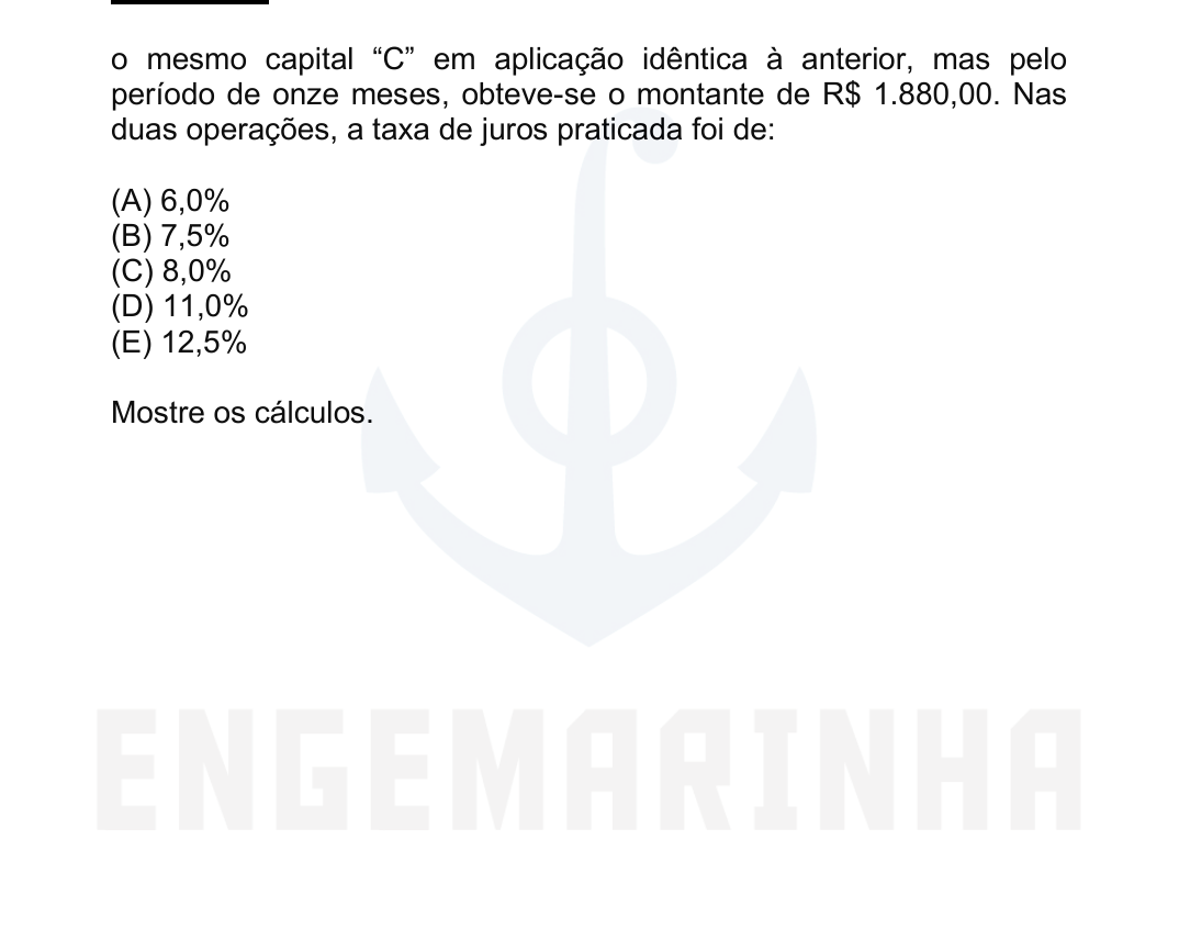 ANÁLISE FINANCEIRA ASSUNTO: Juros Simples Questão 1: Um capital “C”, aplicado em regime de juros simples durante cinco meses, rendeu montante de R$ 1.400,00. Investindo-se o mesmo capital “C” em aplicação idêntica à anterior, mas pelo período de onze meses, obteve-se o montante de R$ 1.880,00. Nas duas operações, a taxa de juros praticada foi de: (A) 6,0% (B) 7,5% (C) 8,0% (D) 11,0% (E) 12,5% Mostre os cálculos. ANÁLISE FINANCEIRA ASSUNTO: Juros Simples Questão 1: Um capital “C”, aplicado em regime de juros simples durante cinco meses, rendeu montante de R$ 1.400,00. Investindo-se o mesmo capital “C” em aplicação idêntica à anterior, mas pelo período de onze meses, obteve-se o montante de R$ 1.880,00. Nas duas operações, a taxa de juros praticada foi de: (A) 6,0% (B) 7,5% (C) 8,0% (D) 11,0% (E) 12,5% Mostre os cálculos. GABARITO: A alternativa correta é a letra C. Para calcular juros simples, utiliza-se a fórmula: 𝐹𝑉 = 𝑃𝑉(1 + 𝑖 ∗ 𝑡) Onde: 𝐹𝑉= valor futuro (Future Value), ou montante; 𝑃𝑉= valor presente (Present Value), ou capital inicial; 𝑖= taxa de juros; 𝑡= tempo (neste caso da questão, meses). Para chegar à resposta, devem-se montar as equações para as duas situações, igualando o valor presente e descobrindo a taxa de juros: Para 5 meses: 1400 = 𝑃𝑉(1 + 𝑖 ∗ 5) 𝑃𝑉 = 1400 (1 + 5𝑖) Para 11 meses: 1880 = 𝑃𝑉(1 + 𝑖 ∗ 11) 𝑃𝑉 = 1880 (1 + 11𝑖) Como o Valor Presente (capital inicial) é o mesmo, igualam-se as duas equações: 1400 (1 + 5𝑖) = 1880 (1 + 11𝑖) 1400 + 15400𝑖 = 1880 + 9400𝑖 6000𝑖 = 480 𝑖 = 480 6000 = 0,08 = 8% 𝑎. 𝑚. ANÁLISE FINANCEIRA ASSUNTO: Análise de Investimentos Questão 2: Um empreendedor vai abrir uma loja de café. Ele tem duas opções para comprar uma cafeteira profissional: a primeira é comprá-la à vista, por R$ 10.000,00, e a segunda, comprá-la a prazo, com 4 prestações de R$ 3.000,00. Sabendo-se que os pagamentos são realizados no início do período e a taxa de desconto aplicada é de 10%, conclui-se que o pagamento à vista representa: (A) uma economia maior que R$ 1.000,00 (B) uma economia de até R$ 999,00 (C) um prejuízo de até R$ 999,00 (D) um prejuízo maior que R$ 1.000,00 (E) o mesmo valor presente do pagamento a prazo Mostre os cálculos. ANÁLISE FINANCEIRA ASSUNTO: Análise de Investimentos Questão 2: Um empreendedor vai abrir uma loja de café. Ele tem duas opções para comprar uma cafeteira profissional: a primeira é comprá-la à vista, por R$ 10.000,00, e a segunda, comprá-la a prazo, com 4 prestações de R$ 3.000,00. Sabendo-se que os pagamentos são realizados no início do período e a taxa de desconto aplicada é de 10%, conclui-se que o pagamento à vista representa: (A) uma economia maior que R$ 1.000,00 (B) uma economia de até R$ 999,00 (C) um prejuízo de até R$ 999,00 (D) um prejuízo maior que R$ 1.000,00 (E) o mesmo valor presente do pagamento a prazo Mostre os cálculos. GABARITO: A alternativa correta é a letra B. Nesta questão, as prestações já são conhecidas (ou seja, é uma série uniforme de pagamento). Para resolver, devemos calcular o Valor Presente Líquido (VPL) da segunda opção, a prazo, e comparar com o à vista. Como o enunciado diz que os pagamentos são realizados no início do período, considera-se o primeiro pagamento no ato, ou seja, no período 0. Segue o cálculo: 𝑉𝑃𝐿 = 𝑃𝑀𝑇 (1 + 𝑖) + 𝑃𝑀𝑇 (1 + 𝑖) + 𝑃𝑀𝑇 (1 + 𝑖) + ⋯+ 𝑃𝑀𝑇 (1 + 𝑖) Onde 𝑃𝑀𝑇 é o pagamento/prestação no mês n e i é a taxa de desconto. Logo: 𝑉𝑃𝐿 = 3000 (1 + 0,1) + 3000 (1 + 0,1) + 3000 (1 + 0,1) + 3000 (1 + 0,1) 𝑉𝑃𝐿 = 3000 + 3000 1,1 + 3000 1,21 + 3000 1,331 𝑉𝑃𝐿 = 3000 + 2727,27 + 2479,33 + 2253,94 = 10460,54 Comparando o VPL do valor a prazo com o à vista, nota-se que há uma economia de R$ 460,54. ANÁLISE FINANCEIRA ASSUNTO: Análise de Investimentos Questão 3: Em um determinado projeto, o investimento em equipamentos, no ano zero, é de R$ 100.000,00 (cem mil reais) e as entradas de caixa anuais, entre os anos 1 (hum) e 6 (seis), são de R$ 30.000,00 (trinta mil) reais cada. Considerando-se uma taxa de desconto de 10% a.a., a ausência de impostos e uma depreciação dos equipamentos em R$ 2.000,00 a.a. (dois mil reais ao ano), o Valor Presente Líquido (VPL) do projeto, em reais, é de (A) 280.000,00 (B) 130.657,82 (C) 80.000,00 (D) 68.000,00 (E) 30.657,82 Mostre os cálculos. ANÁLISE FINANCEIRA ASSUNTO: Análise de Investimentos Questão 3: Em um determinado projeto, o investimento em equipamentos, no ano zero, é de R$ 100.000,00 (cem mil reais) e as entradas de caixa anuais, entre os anos 1 (hum) e 6 (seis), são de R$ 30.000,00 (trinta mil) reais cada. Considerando-se uma taxa de desconto de 10% a.a., a ausência de impostos e uma depreciação dos equipamentos em R$ 2.000,00 a.a. (dois mil reais ao ano), o Valor Presente Líquido (VPL) do projeto, em reais, é de (A) 280.000,00 (B) 130.657,82 (C) 80.000,00 (D) 68.000,00 (E) 30.657,82 Mostre os cálculos. GABARITO: O Valor Presente Líquido (VPL) é calculado para determinar o valor presente de pagamentos (𝑃𝑀𝑇 ) futuros ou fluxos de caixa (𝐹𝐶 ), sendo descontada uma taxa de juros estipulada. Ao cálculo, deve-se retirar o capital/investimento inicial (𝐼 ) no período 0. 𝑉𝑃𝐿 = 𝐹𝐶 (1 + 𝑖) + 𝐹𝐶 (1 + 𝑖) + 𝐹𝐶 (1 + 𝑖) + ⋯+ 𝐹𝐶 (1 + 𝑖) − 𝐼 Sendo assim, calcula-se: 𝑉𝑃𝐿 = 3000 (1 + 0,1) + 3000 (1 + 0,1) + 3000 (1 + 0,1) + 3000 (1 + 0,1) + 3000 (1 + 0,1) + 3000 (1 + 0,1) − 𝐼 𝑉𝑃𝐿 = 27272,72 + 24793,38 + 22539,44 + 20490,40 + 18627,63 + 16934,22 − 𝐼 𝑉𝑃𝐿 = 130753,82 − 100000 = 30753,82 ANÁLISE FINANCEIRA ASSUNTO: Análise de Investimentos Questão 4: Uma empresa está em face de duas possibilidades de investimentos que são apresentadas no Quad