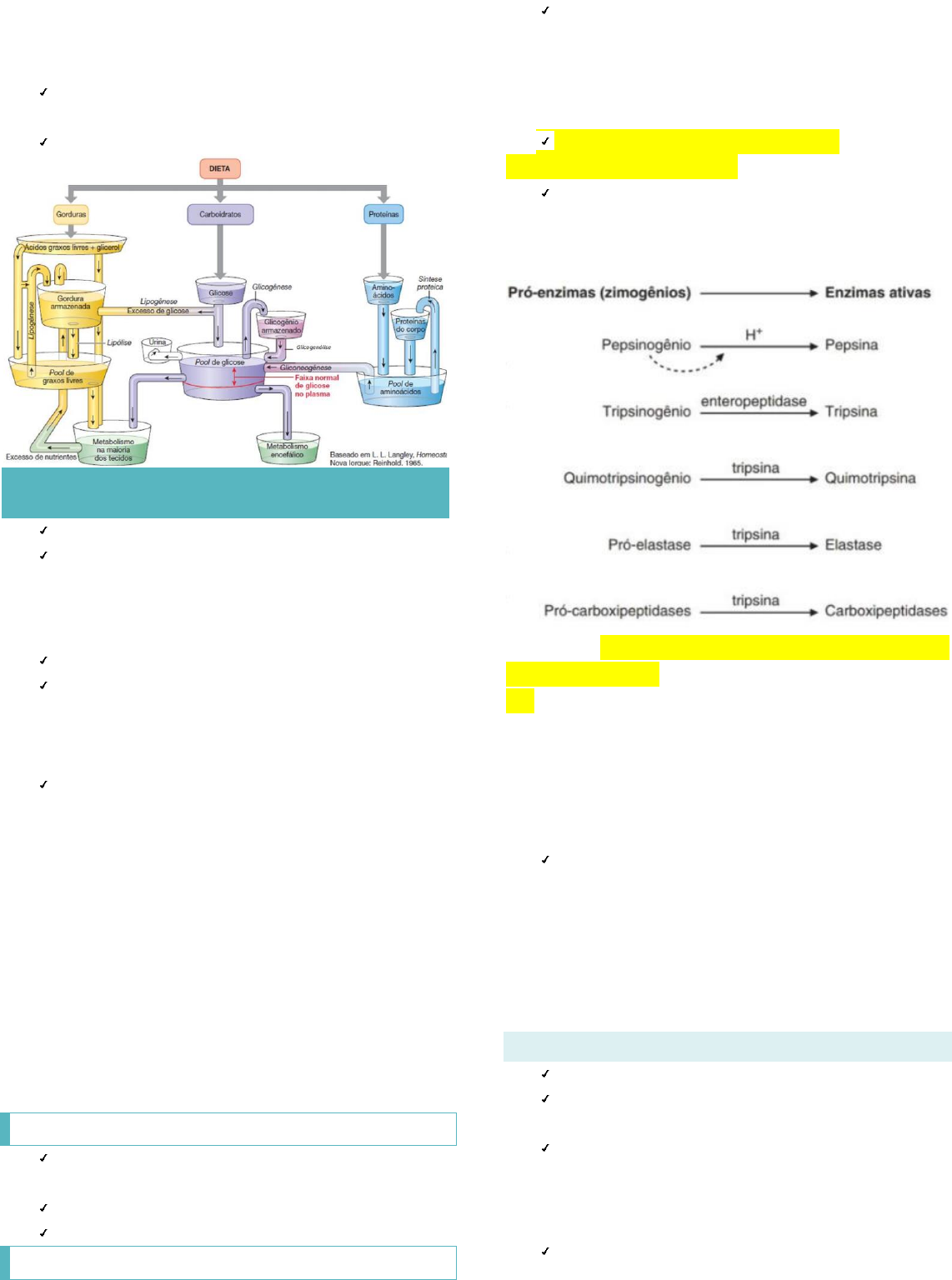 Millena Fernandes l @medmillena Digestão de proteínas, absorção e metabolismo de aminoácidos Transaminação e desaminação: processos necessários para a digestão de proteínas Metabolismo geral: PROTEÍNAS Proteínas: um dos compostos orgânicos básicos Contribuem para a produção de energia metabólica - Durante o período de jejum, quando se utiliza aminoácidos como fonte de energia - 10 a 15% da produção de energia do nosso organismo Último recurso do organismo utilizado como fonte de ATP A fração de energia metabólica obtida a partir de aminoácidos, sejam eles provenientes de proteínas da dieta ou de proteínas teciduais, varia muito de acordo com o tipo de organismo e com as condições metabólicas Os carnívoros consomem basicamente proteínas e, assim, devem obter a maior parte de sua energia a partir dos aminoácidos. - Pool de aminoácidos: provenientes da dieta e da degradação de proteínas do corpo, através de várias origens (proteínas endógenas) - A partir da gliconeogênese os aminoácidos podem ser convertidos em glicose (alanina -> glicose) - Importância dos aminoácidos vai além da síntese proteica. É essencial para criação enzimática Os aminoácidos NÃO possuem uma forma de armazenamento como o glicogênio e os triglicerídeos. Entretanto, eles podem ser convertidos em carboidrato ou gordura para armazenamento. Aminoácidos Carbono alfa, ligado a uma grupo amino, outro carboxila, um hidrogênio e o grupo R 20 aminoácidos diferentes compõem as nossas proteínas O que diferencia os aminoácidos: cadeia lateral (grupo R) Digestão das proteínas As proteínas são degradas até aminoácidos - Digestão de carboidratos inicia na boca (não ocorre no estômago, devido o pH) - Intestino delgado: finaliza a digestão dos carboidratos - Digestão de gorduras: ocorre no intestino delgado Início da digestão de proteínas: estômago - Fim da digestão: intestino delgado As enzimas que digerem as proteínas são produzidas como precursores inativos (ZIMOGÊNIOS – enzima na forma inativa), os quais são maiores do que as enzimas ativas - Importância dos zimogênios: para que as enzimas não consumam o tecido que a produziu (evitar autofagia – ex: pancreatite) OBS: para que uma única proteína seja degradada, há a participação de várias enzimas Colecistocina (CCK): hormônio responsável pela liberação e ativação dos zimogênios no intestino delgado Os zimogênios são produzidos no pâncreas - Proteases: exopeptidases e endopeptidases APLICAÇÃO CLÍNICA Anormalidades digestivas. Em indivíduos com deficiência na secreção pancreática (p. ex., devido à pancreatite crônica, à fibrose cística ou à remoção cirúrgica do pâncreas), a digestão e a absorção de gorduras e proteínas são incompletas. O resultado é o aparecimento anormal de lipídeos nas fezes (uma condição denominada esteatorreia), assim como de proteínas não digeridas. Pepsinogênio Secretado pelas células do estômago É ativado pela ação do ácido clorídrico secretado pelas células parietais A própria acidez do ácido clorídrico causará a ativação do pepsinogênio (autocatálise) - Ele mesmo se ativa na presença do pH muito ácido (ação autocatalítica) Forma ativa: pepsina (primeira enzima a entrar em contato com as proteínas) Millena Fernandes l @medmillena - Quebra ligações peptídicas, gerando polipeptídeos (diminui o tamanho da proteína) Não quebra cada uma das ligações polipeptídicas - Formação de proteínas: a + a se ligam a partir de uma ligação peptídica. - Importância da acidez do estômago na digestão de proteínas: contribui parcialmente para a desnaturação proteica. Quando proteínas da dieta chegarem ao estômago, parte dela será desnaturada e facilitará a atividade da pepsina Tripsinogênio Presente no intestino Ativado pela ação da enteropeptidase Enzima produzida no intestino delgado e ativa o tripsinogênio Forma ativa: TRIPSINA - A partir do momento que é ativada, essa enzima é importante para a ativação dos outro zimogênios Tripsina (Arg e Lys), quimiotripsina (Trp, Tys, Phe, Met e Leu) e elastase (Ala, Gly e Ser) (ENDOPEPTIDASES): quebram as ligações mais internas das proteínas OBS: A enteropeptidase, desse modo, desencadeia uma cascata de atividades proteolíticas, pois a tripsina é o ativador comum de todos os zimogênios pancreáticos Carboxipeptidases (região C terminal) e aminopeptidases (região N terminal) (EXOPEPTIDASES): degradam as ligações peptídicas mais externas das proteínas (ala, ile, leu, val, arg e lys) Enzimas digestivas são várias que degradaram uma única proteína. Cada uma atua em uma ligação peptídica específica - Porção inicial da proteína: região amino terminal (N-terminal) - Porção final da proteína: região carboxila terminal (C-terminal) Peptídeos: aminoácidos ligados Processos principais para a degradação proteica Proteínas endógenas: há 2 mecanismos que realizam esse mecanismo de degradação Millena Fernandes l @medmillena Em células procarióticas - Meia vida curta (tempo que 50% das proteínas são degradadas) : prolina, glutamato, treonina e serina Tempo de vida da hemoglobina: 120dias; hemoglobina falciforme tem uma meia vida de poucos minutos O primeiro é efetuado por proteases de lisossomos, as catepsinas, e é utilizado principalmente para a degradação de proteínas extracelulares, internalizadas por endocitose, e proteínas citosólicas de meia-vida longa O segundo processo ocorre no citosol por meio da proteína ubiquitina. Para marcar a proteína destinada à degradação, várias moléculas de ubiquitina são ligadas sequencialmente à proteína, formando uma cadeia de poliubiquitina. A proteína, então ubiquitinada, torna-se apta a interagir com um grande complexo proteolítico multienzimático, o proteassomo. Ele é formado por dezenas de subunidades e, à custa de ATP, é capaz de catalisar a hidrólise de liga