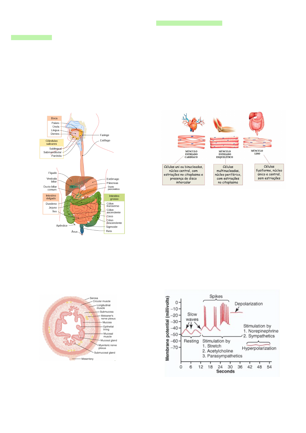 FISIOLOGIA SISTEMA GASTROINTESTINAL (TBL) Princípios Gerais Para desempenhar sua função, o tubo digestivo necessita de: ☆ movimentação do alimento pelo trato alimentar; ☆ secreção de soluções digestivas e digestão dos alimentos; ☆ absorção de água, de diversos eletrólitos e produtos da digestão; ☆ circulação de sangue através dos órgãos gastrointestinais para transporte de substâncias absorvidas; ☆ controles de todas essas funções pelos sistemas nervoso e hormonal locais. Observações: ☆ quando a digestão está acontecendo, o ideal é que o fluxo sanguíneo aumente ☆ esse fluxo é controlado pelo sistema nervoso e endócrino ☆ existem vários órgãos anexos que fazem parte da função gastrointestinal ☆ existem 4 camadas que formam o tubo digestivo, presentes desde a boca até o anus - Camada serosa: camada única de células que reveste o tubo - Camada muscular: responsável pelo movimento - Camada mucosa e submucosa: mais próximas à luz do órgão - A camada muscular, nas áreas de esfíncter, é mais espessa e significativa, sendo mais importante percentualmente - Na submucosa encontram-se grande parte das glândulas Motilidade gastrointestinal ☆ a motilidade depende das camadas de músculo liso (camada muscular longitudinal e circular); ☆ diferenciação dos tipos de músculo pode ser dada pela distribuição das fibras - músculo estriado esquelético: fibras estão em paralelo - músculo cardíaco: estriado: fibras dispostas em forma de rede (sincício) - músculo liso: rede de fibras (sincício) ☆ as fibras musculares lisas dispõem em feixes de até 1000 fibras paralelas conectadas eletricamente (através de junções abertas), que asseguram baixa resistência à movimentação dos íons de uma célula muscular para a seguinte; - Músculo estriado esquelético: fibras em paralelo - Músculo cardíaco: estriado, fibras dispostas em forma de rede (sincício) - Músculo liso: rede de fibras (sincício) Atividade elétrica do músculo liso gastrointestinal ☆ a condução dos sinais elétricos de forma longitudinal é mais rápida que a lateral; ☆ cada camada muscular representa uma rede de feixes de músculo liso (feixes estão fundidos em vários pontos, formando uma espécie de malha); - Assim, cada camada muscular funciona como um sincício, isto é, quando um potencial de ação é disparado em qualquer ponto dentro da massa muscular, ele geralmente se propaga em todas as direções no músculo. ☆ A condução de impulso elétrico é mais lenta na fibra lisa do que na fibra esquelética ☆ Para a contração acontecer, precisa-se dos íons cálcio ligados a uma proteína: calmodulina ☆ A atividade elétrica do músculo liso é inconstante, instável ☆ No repouso da fibra gastrointestinal, vaza uma quantidade de íons que faz com que o potencial varie (entre -60 e -50): potencial em onda lenta ☆ A onda lenta é causada pelo vazamento de sódio ☆ Potencial de ação: momento em que a contração acontece (entra mais cálcio do que sódio) ☆ Ondas lentas: ritmo das contrações é determinado pelas ondas lentas ☆ Potencial de repouso: potencial de onda lenta (mudanças lentas e ondulatórias de repouso e suas intensidades) ☆ Potencial limiar: mínimo necessário para que ocorra o potencial de ação (em média -40mV) - abrir canais de sódio ☆ As ondas lentas estabelecem a frequência e o ritmo das contrações ☆ A despolarização depende mais de cálcio do que de sódio ☆ Há perda súbita da negatividade da membrana Alterações na voltagem do potencial de membrana em repouso ☆ Normal: -56mV (altera) ☆ Despolarização: fibra se torna + excitável ☆ Hiperpolarização: fibra se torna - excitável ☆ O sistema gastrointestinal é excitado pelo sistema nervoso parassimpático e é inibido pelo sistema nervoso simpático Papel do Ca++ e a contração muscular ☆ Nas ondas lentas, não há entrada de cálcio, só de sódio (não geram contrações) ☆ Contração tônica em alguns músculos lisos gastrointestinais Papel do retículo endoplasmático na contração do músculo liso ☆ As cavéolas são análogas ao sistema de túbulos do músculo esquelético ☆ Cálcio liberado no retículo: calmodulina (gera ATP) Controle hormonal: responsável pela motilidade gastrointestinal Colecistocinina: ☆ célula da mucosa do duodeno e jejuno em resposta a produtos da degradação de lipídios, ácidos graxos e monossacarídeos no conteúdo intestinal ☆ Esse hormônio é liberado pelo duodeno e tem como função principal a liberação da bile para o intestino delgado (produzida pelo fígado e armazenada na vesícula biliar) ☆ Inibe, moderadamente, a motilidade gástrica Secretina: ☆ células da mucosa do duodeno em resposta ao suco gástrico ácido ☆ Inibe a motilidade da maior parte do trato digestivo Peptídeo gástrico inibidor: ☆ secretado pela mucosa da parte superior do intestino delgado em resposta a ácidos graxos, aminoácidos e carboidratos ☆ Diminui a atividade motora do estômago e diminui a velocidade do esvaziamento gástrico Tipos de movimentos no trato digestório Propulsivos: ☆ peristáltico; empurram o alimento para frente; movimento de massa ☆ Anel contrátil aparece no tubo e move-se adiante ☆ Estímulo: distensão do intestino, irritação do epitélio de revestimento e sinais nervosos excitatórios (parassimpático) ☆ Quando o tubo é distendido, existe uma resposta involuntária no ponto de distensão: contração na região anterior e relaxamento na região posterior - faz com que o trajeto ocorra em um sentido ☆ A contração peristáltica impede que o alimento vá no sentido contrário ☆ Movimento direcional das ondas peristálticas: em direção ao ânus ☆ Relaxamento receptivo: reflexo mioentérico ou reflexo peristáltico Movimento de mistura: ☆ contrações peristálticas provocam mistura quando há bloqueio da progressão por um esfíncter, con