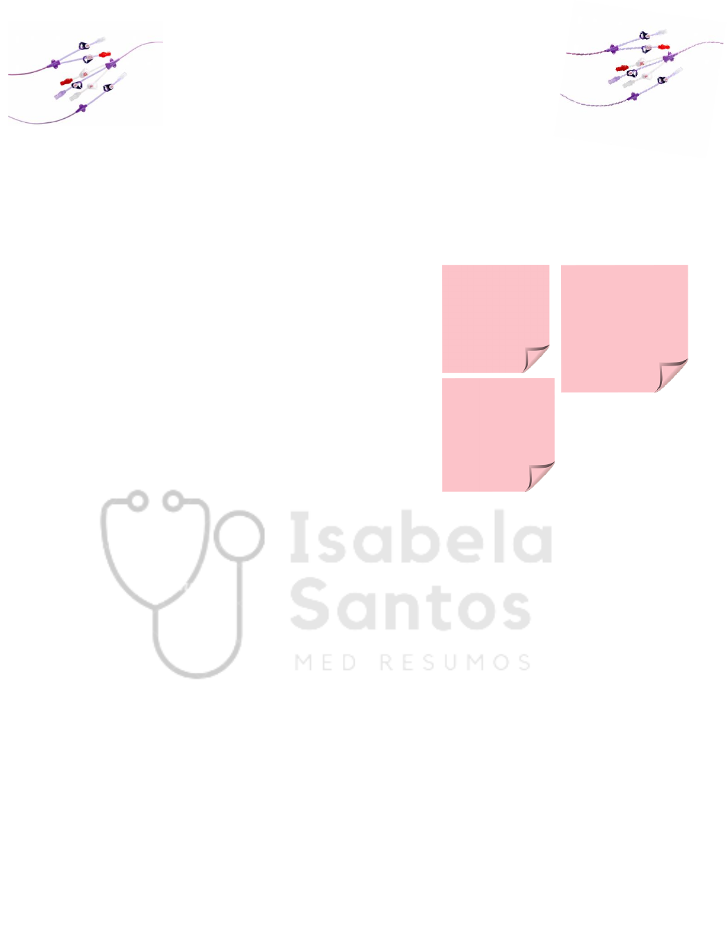 Isabela Santos – Med Resumos O que é acesso venoso central? - Consiste em um cateter posicionado em um grande vaso profundo Qual a importância do acesso venoso central? Utilizado quando houver: 1. Indisponibilidade de acesso periférico ou falha de acesso 2. Soluções incompatíveis com infusão periférica 3. Terapias extracorpóreas 4. Monitorização hemodinâmica 5. Implantação de dispositivos e terapias endovasculares Classificação do cateter 1. Tempo de permanência → até 30 dias ou mais 2. Tipo de cateter → implantável ou não implantável 3. Sítio de inserção → veia jugular interna, veia subclávia ou veia femoral Indicações para o acesso venoso central 1. Cateter de hemodiálise 2. Marcapasso 3. Cateter de artéria pulmonar 4. Filtro de veia cava 5. Cateter venoso central → maior indicação Observação: o acesso venoso central é utilizado para colocar o cateter venoso central Contraindicações 1. Absolutas → não existe 2. Relativas → distúrbios da coagulação, infecção no sítio de punção, proximidade a feridas, traqueostomia, áreas queimadas, distorções anatômicas e proximidade a lesões vasculares. Qual o melhor sítio de punção? Vai depender da habilidade do médico, disponibilidade do sítio e finalidade Acesso Venoso Central 1. Quando já tentou várias vezes um acesso periférico e não conseguiu 2.Líquidos com alta osmolaridade → geram flebite, trombose, colaba e irrita a veia periférica NÃO PODE SER USADO PARA EXPANSÃO VOLÊMICA Isabela Santos – Med Resumos Sítios de punção Acesso jugular interno Vantagens: bem exposta na região cervical, pode ser guiado por USG, menor risco de pneumotórax, hemorragia passível de compressão. Desvantagens: risco de hematoma cervical grave, risco de lesão do ducto torácico, difícil de ser realizado durante IOT ou RCP ou em pacientes com colar cervical. Acesso veia subclávia Vantagens: menor infecção, pouca variação anatômica, boa opção em obesos, pode ser realizado em paciente com colar cervical. Desvantagens: difícil auxílio por USG, maior risco de pneumotórax e hemotórax, impossibilidade de compressão de sangramentos internos. Acesso veia femoral Vantagens: menor risco de complicações imediatas, compressível, sem risco de complicações pulmonares (hemotórax ou pneumotórax) Desvantagens: maior risco de contaminação, infecção e trombose Isabela Santos – Med Resumos Complicações Preparação geral 1.Consentimento → explique o que vai fazer para o paciente e se apresente 2.Posicionamento → posição de trendelemburg + palpação da região a ser puncionada Materiais 1.Kit de acesso central: agulha, seringa, fio guia, dilatador e cateter 2.Kit sutura + fio nylon 3-0 + gaze, seringa e soro Material para assepsia 1.Algodão e álcool 70% seguido de iodo a 10% Equipamento para paramentação + anestésico local Técnica de Seldinger – Jugular interna • Consiste em punção, passagem do fio guia e dilatação • Usa o triângulo de sedillot como parâmetro anatômico (formado pela cabeça esternal e clavicular do músc. Esternocleidomastóideo) • Posiciona o paciente na posição de trendelemburg com a cabeça rotacionada contralateral ao local de punção • Realiza punção no ápice do triângulo de sedillot na posição de 30-45º apontada para o mamilo ipsilateral (do mesmo lado) • Após puncionar a veia passa o fio guia e retira a agulha • Faz um piquezinho com o bisturi • Passa o dilatador • Passa o cateter • Fixação Técnica de Seldinger – Subclávia • Utiliza como parâmetro anatômico a linha hemiclavicular 01 a 02cm para lateral e 01 a 02cm para baixo • Posiciona o paciente na posição de trendelemburg com a cabeça rotacionada contralateral IMEDIATAS TARDIAS • Trombose • Infecção • Punção arterial • Hematoma • Pneumotórax • Hemo/Quilo/Hidrotórax • Arritmia • Embolia Isabela Santos – Med Resumos • Realiza a punção direcionada para fúrcula esternal com angulação de 30º e reduz para 15º após inserção para região posterior a clavícula • Sempre preferir a veia direita Técnica de Seldinger – Femoral • Utiliza como referencial anatômico o trígono femoral que é limitado superiormente pelo ligamento inguinal (entre espinha ilíaca anterossuperior e sínfise púbica) • Sempre palpar a artéria femoral e lembrar que veia estará medial • Realiza a punção Cuidados gerais 1. Limpeza 2. Retirar assim que possível 3. Retirar se sinais infecciosos 4. Não é recomendado troca periódica Preceitos gerais para passagem de cateter venoso central 1. Preparo do paciente 2. Paramentação estéril 3. Antissepsia 4. Anestesia local 5. Técnica de Seldinger 6. Fixação e curativo estéril 7. Imagem de controle Isabela Santos – Med Resumos Passo a passo do procedimento – OSCE 1. Se apresentar para o paciente, explicar o procedimento e pedir autorização 2. Posicionamento do paciente em trendelemburg 3. Higienização das mãos 4. Paramentação estéril 5. Realizar antissepsia do local 6. Colocar o campo cirúrgico 7. Realizar anestesia local (bloqueio anestésico com lidocaína a 2% com agulha hipodérmica) 8. Encontrar o referencial anatômico para punção 9. Acoplar a agulha de punção na seringa 10. Puncionar o sítio escolhido (sempre puncionar aspirando) 11. Desacoplar a seringa da agulha 12. Inserir o fio guia (até a 2ª marca) 13. Após passar o fio guia, retiro o suporte do fio guia e retiro a agulha 14. Com a lâmina do bisturi realizar “piquezinho” para facilitar a introdução do dilatador 15. Conectar o dilatador ao fio guia e introduzir de forma circular 16. Retirar o dilatador 17. Introduzir o cateter de acesso venoso (previamente salinizado) e retirar o fio guia 18. Conectar o cateter ao equipo de soro e verificar o refluxo de sangue 19. Salinizar as vias do cateter e aplicar tampas de vedação 20. Fixar o cateter (dispositivo de trava e fio de nylon) 21. S