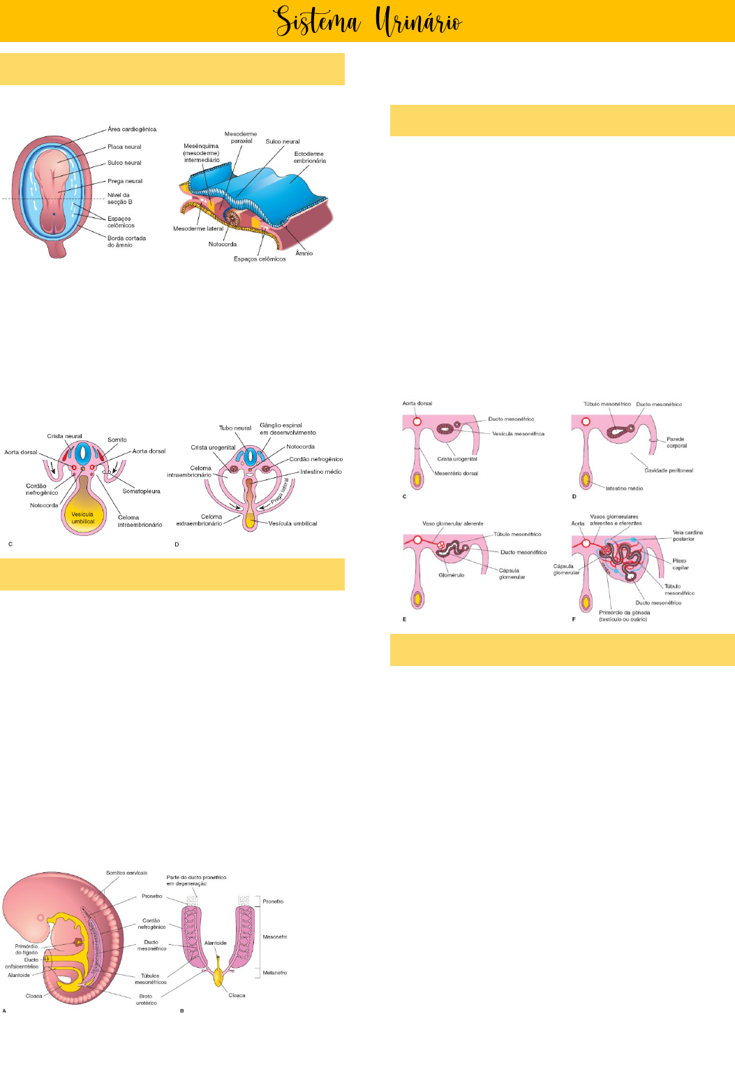 Embriologia do sistema urinário Desenvolve-se a partir do mesênquima intermediário derivado da parede dorsal do embrião Durante o dobramento do embrião no plano horizontal o mesênquima é deslocado ventralmente e perde sua conexão com os somitos A crista urogenital se forma e da origem ao cordão nefrogênico (urinário) e a crista gonadal (reprodutor) por vias de sinalização Desenvolvimento dos rins e ureteres Três conjuntos sucessivos de rins se desenvolvem nos embriões humanos. O 1º– pronefro – é rudimentar e não funcional. O 2º – mesonefro –desenvolvido e funciona brevemente durante o período fetal. O 3º– metanefro – forma os rins permanentes. Pronefro Os pronefros transitórios bilaterais aparecem no início da quarta semana. Localizados na região do pescoço Os ductos pronéfricos dirigem-se caudalmente e se abrem na cloaca e os pronefrons logo se degeneram; entretanto, a maioria das partes dos ductos pronéfricos persiste e é utilizada pelo segundo conjunto de rins. Mesonefro Final da quarta semana, caudalmente ao pronefro Os rins mesonéfricos consistem em 40 glomérulos com túbulos mesonéfricos Os túbulos se abrem nos ductos mesonéfricos, originalmente os ductos pronéfricos. Os ductos mesonéfricos se abrem na cloaca O mesonefro produz urina entre as semanas 6 e 10, até que os rins permanentes comecem a funcionar O mesonefro se degenera no final da 12ª semana; seus túbulos tornam-se os dúctulos eferentes dos testículos. Metanefro Início da quinta semana, se torna funcional aproximadamente 4 semanas depois. A produção da urina continua durante toda a vida fetal e é excretada na cavidade amniótica e forma uma parte do líquido amniótico. Os rins permanentes se desenvolvem a partir de duas fontes •O broto uretérico (divertículo metanéfrico) •O blastema metanefrogênico (massa metanéfrica do mesênquima). O broto uretérico é um divertículo a partir do ducto mesonéfrico, próximo à sua entrada na cloaca. O broto uretérico é o primórdio do ureter, da pelve renal, do cálice (subdivisões da pelve renal) e dos túbulos coletores. O broto alongado penetra no blastema metanefrogênico – derivado do cordão nefrogênico –, que forma os néfrons O pedúnculo do broto uretérico torna-se o ureter, e a parte cranial do divertículo sofre repetidas ramificações e se diferenciam nos túbulos coletores do metanefro Os túbulos coletores retos sofrem repetidas ramificações, formando sucessivas gerações de túbulos coletores. As quatro primeiras gerações de túbulos aumentam e se aglutinam para formar os cálices maiores as quatro gerações seguintes se unem para formar os cálices menores. A extremidade de cada túbulo coletor arqueado induz grupos de células mesenquimais no blastema metanefrogênico a formar pequenas vesículas metanéfricas que se alongam e se tornam os túbulos metanéfricos As extremidades proximais desses túbulos são invaginadas pelos glomérulos. O corpúsculo renal (glomérulo e sua cápsula) e seu túbulo contorcido proximal, a alça do néfron (alça de Henle), e o túbulo contorcido distal formam um néfron Cada túbulo contorcido distal entra em contato com um túbulo contorcido arqueado. Os túbulos coletores tornam-se confluentes, formando um túbulo urinífero (conjunto de néfron + túbulos coletores) Até a 36ª semana o número de néfrons aumenta Os rins fetais são subdivididos em lobos. A lobulação desaparece durante a infância à medida que os néfrons aumentam de tamanho. A maturação funcional dos rins ocorre após o nascimento, mas nenhum néfron adicional é formado Ocorre o alongamento dos túbulos contorcidos proximais e aumento do tecido intersticial Broto uretérico e blastema metanefrogênico estimulam um ao outro para o desenvolvimento final do rim e ureter Mudanças posicionais dos rins Os rins metanéfricos em desenvolvimento ficam próximos um do outro na pelve Conforme o abdome e a pelve crescem, os rins gradualmente se realocam no abdome e se afastam um do outro Atingem sua posição adulta em cada lado da coluna vertebral na nona semana. Essa “ascensão” resulta principalmente do crescimento relativo do corpo do embrião caudal aos rins. Conforme os rins mudam de posição, também giram medialmente, aproximadamente 90°. Por volta da nona semana, os rins entram em contato com as glândulas suprarrenais à medida que atingem sua posição adulta Mudanças no suprimento sanguíneo dos rins Inicialmente, as artérias renais são ramos das artérias ilíacas comuns Posteriormente, os rins recebem seu suprimento sanguíneo da extremidade distal da aorta Os rins recebem seus ramos mais craniais, que se tornam as artérias renais, a partir da aorta abdominal. Normalmente, os ramos caudais primordiais sofrem involução e desaparecem Desenvolvimento da bexiga urinária O seio urogenital é dividido em três partes •Uma parte vesical, que forma a maior parte da bexiga e é contínua com o alantoide •Uma parte pélvica, que se torna a uretra no colo da bexiga, a parte prostática da uretra nos homens e a uretra inteira nas mulheres •Uma parte fálica, que cresce em direção ao tubérculo genital– o primórdio do pênis ou do clítoris. A bexiga se desenvolve principalmente da parte vesical do seio urogenital, porém o trígono (área triangular na base da bexiga entre as aberturas dos ureteres) é derivado da extremidade caudal dos ductos mesonéfricos Inicialmente, a bexiga é contínua com o alantoide O alantoide sofre constrição e se torna um cordão fibroso e espesso, o úraco Em adultos, o úraco é representado pelo ligamento umbilical mediano. Conforme a bexiga aumenta, partes distais dos ductos mesonéfricos são incorporadas dentro de sua parede dorsal Esses ductos contribuem para a formação do tecido conjuntivo no trígono da bexiga. O epitélio de toda a bexiga é derivado da endoderme do seio urogenital. As outras camadas da parede da bexiga