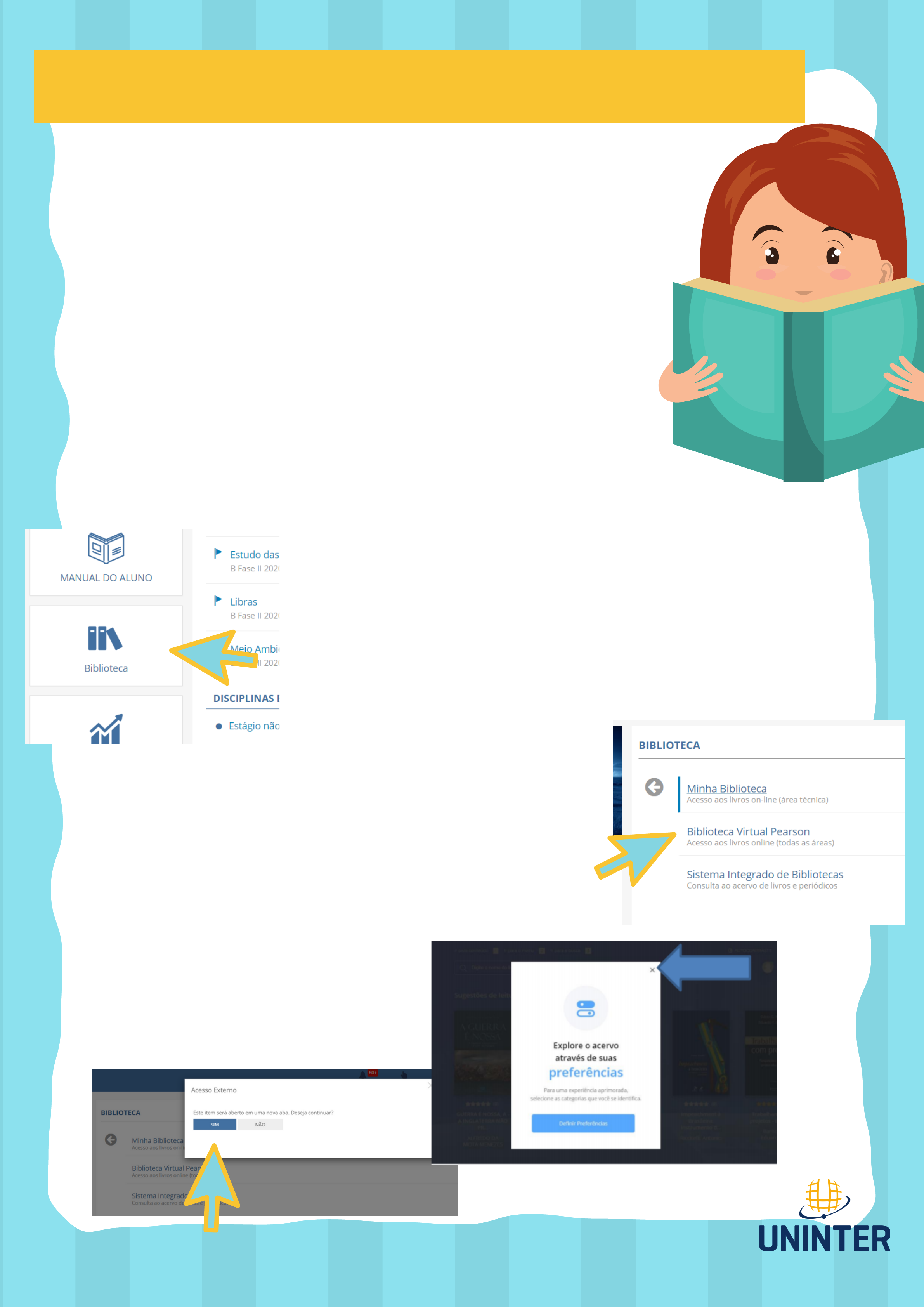 Entre as ferramentas que seu AVA UNINTER oferece temos a Biblioteca Virtual Pearson. Este espaço está totalmente disponível para que você desfrute das mais variadas obras de leituras ampliando ainda mais seus conhecimentos. E aí? Você já acessou este ambiente? Se sim, ótimo! Continue usufruindo dessa ferramenta que a UNINTER faz questão de proporcionar a todos seus estudantes. Mas, caso ainda não acessou. Que tal começar agora? É muito fácil! Acompanhe o tutorial que preparamos para você. O L Á , A C A D Ê M I C O S U N I N T E R ! ! ! Primeiramente você precisa entrar no seu AVA, certo? 1) Acesse com seu RU e senha seu AVA UNINTER. 2) Na sala de aula, na barra esquerda, clique no ícone Biblioteca 3) Abrirá uma tela com três opções. 4) Clique na opção “Biblioteca Virtual Pearson”. 5) Na tela seguinte aparecerá uma mensagem 6) Clique na opção “SIM”. 7) Na próxima tela, clique no “X”. 8) Olha só! Você está na página da Biblioteca Virtual Pearson. 9) Clique no campo que mostra a seta. 10) Imediatamente aparecerá o campo para você digitar o nome do livro que deseja consultar 11) Digite o nome do livro. 12) Após digitar o nome do livro, ele aparecerá logo abaixo. 13) Clique para selecionar o seu livro. 14) Na próxima imagem ele aparecerá no acervo. 15) Clique no livro. 16) Selecione a opção “Ler agora”.. Prontinho! Seu livro está disponível para sua consulta e leitura. Para seguir as páginas utilize a seta da direita. E se desejar voltar às páginas anteriores utilize a seta da esquerda. Agora é com você. Aproveite ao máximo este ambiente de conhecimentos! Ótimas leituras!