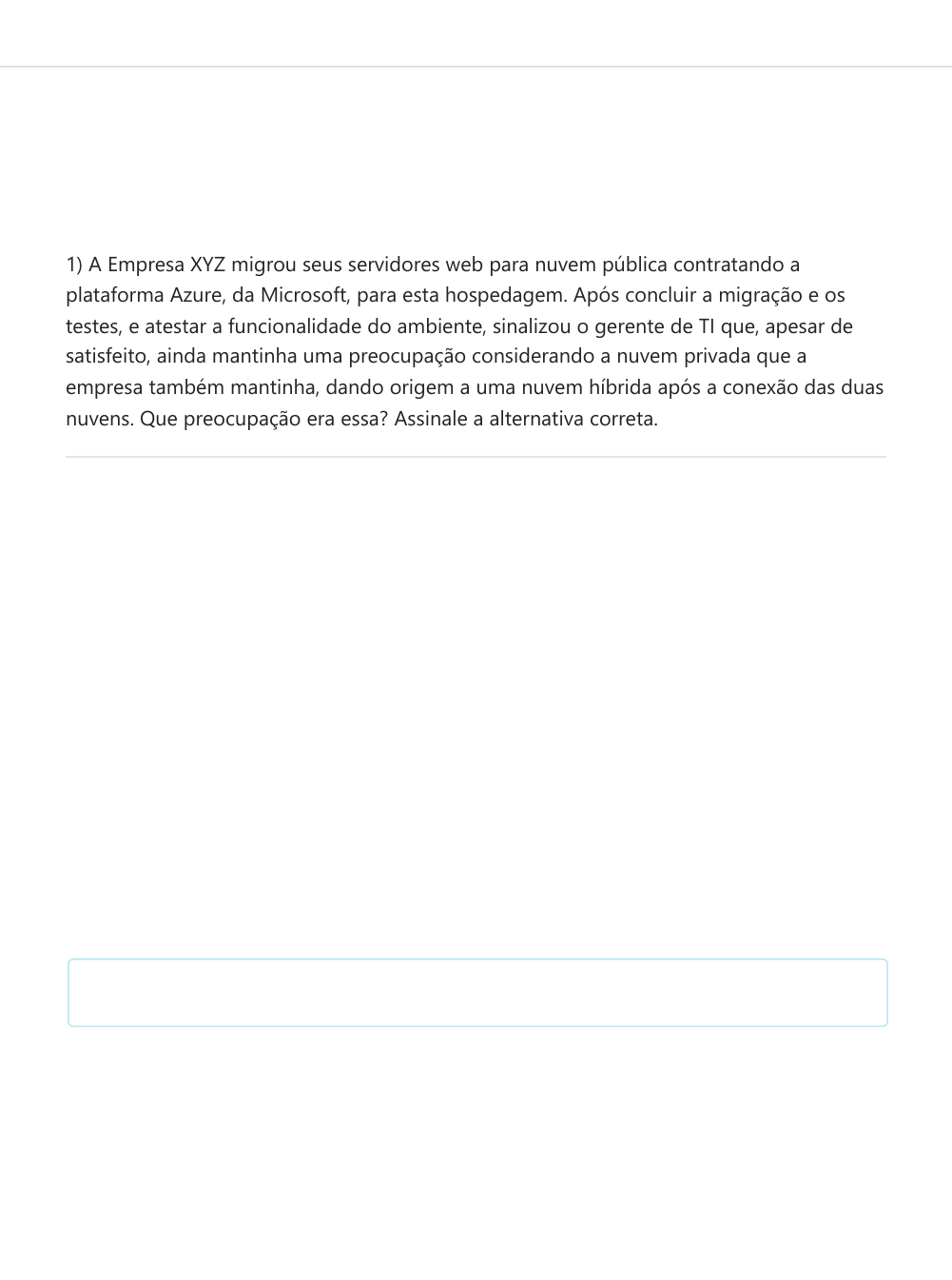 Segurança da informaç Cloud computing Professor(a): Fernanda Rosa da Silva (Especialização) 1) A Empresa XYZ migrou seus servidores web para nuvem pública contratando a plataforma Azure, da Microsoft, para esta hospedagem. Após concluir a migração e os testes, e atestar a funcionalidade do ambiente, sinalizou o gerente de TI que, apesar de satisfeito, ainda mantinha uma preocupação considerando a nuvem privada que a empresa também mantinha, dando origem a uma nuvem híbrida após a conexão das duas nuvens. Que preocupação era essa? Assinale a alternativa correta. Alternativas: A perda de acesso ao servidor caso o ambiente do provedor apresente falha, causando danos aos servidores de forma irreversível. A segurança dos dados, pelo fato de a nuvem estar suscetível ao vazamento de informações constantemente, trazendo risco de ameaça à integridade. Possível incompatibilidade de softwares, capaz de ocasionar falhas na migração de carga entre os dois ambientes. CORRETO O acesso aos servidores, considerando que o link de internet principal vem apresentando intermitência, o que pode tornar a nuvem inacessível. O alto custo na contratação, considerando a baixa demanda suportada e o processamento limitado e o valor do serviço estabelecido pelos provedores de nuvem pública. a organização, ao contratar uma nuvem pública, estabeleceu conexão com a nuvem privada existente, formando, assim, uma nuvem híbrida. Quando a nuvem hibrida é utilizada, é possível que, ao mover a carga de um ambiente para o outro, alguns aplicativos apresentem problemas de incompatibilidade se não forem corretamente convertidos e tratados. Código da questão: 58363 Resolução comentada: https://kroton.platosedu.io/lms/m/ https://kroton.platosedu.io/lms/m/aluno/index/2771536 https://kroton.platosedu.io/aluno/disciplina/atividade/25826430 https://kroton.platosedu.io/aluno/disciplina/atividade/25826431 https://kroton.platosedu.io/lms/m/ http://www.biblioteca-virtual.com/ https://kroton.platosedu.io/lms/m/mensagem/index 2) Os serviços, quando hospedados na nuvem, são classificadas como: aplicações com demanda variável, crescimento exponencial ou com pico de processamento. Sobre os tipos que definem tais aplicativos, é correto dizer que: Alternativas: A diferença entre as aplicações com demanda variável e as com picos de processamento é que a primeira não pode ser mensurada. Já a segunda pode ter seu comportamento previsto e, em ambos os casos, o problema é resolvido alocando recursos rapidamente. CORRETO Todas as aplicações são de crescimento exponencial, sendo assim, nenhuma delas pode ser estática, sem crescimento de sua base de dados, pois nenhuma aplicação é utilizada somente para consultas de dados, mantendo a base estática. Aplicações de crescimento exponencial são aquelas já criadas na nuvem após um planejamento que define os recursos que serão utilizados em longo prazo, assim, não é necessário gerenciar os elementos envolvidos e o custo-benefício se torna melhor. Aplicações com demanda variável e com crescimento exponencial são aquelas que enfrentam períodos específicos de alta demanda, em que os recursos devem ser aumentados pelo tempo necessário. Aplicações com pico de processamento são aquelas que atingem frequentemente a máxima capacidade dos recursos computacionais, não sendo um tipo ideal para migrar para nuvem. quando uma aplicação é criada na nuvem ou migrada e continua recebendo dados constantemente, crescendo com o tempo, ela é considerada de crescimento exponencial, com exceção daquelas utilizadas somente de consulta, que não apresentam alteração considerável. Algumas são consideradas de demanda variável por constantemente necessitarem de recursos computacionais mais ou menos robustos e consequentemente, de maior controle na nuvem, por outro lado, existem aplicações com pico de demanda que exigem essa atenção em períodos mais específicos, como oferta, mês de maiores vendas, ou seja, períodos predefinidos. Código da questão: 58384 Resolução comentada: https://kroton.platosedu.io/lms/m/ http://www.biblioteca-virtual.com/ https://kroton.platosedu.io/lms/m/mensagem/index 3) Considere as camadas da nuvem e os recursos oferecidos em forma de serviço deste modelo. Serviços em qualquer camada suportam a arquitetura-base da nuvem, sendo assim, considere a figura a seguir e, em seguida, leia e associe as duas colunas: Figura 1 – A estrutura de serviços da nuvem Fonte: elaborada pelo autor Assinale a alternativa que traz a associação correta entre as duas colunas: Alternativas: I – A; II – B; III – C. I – A; II – C; III – B. CORRETO I – B; II – C; III – A. I – C; II – A; III – B. I – C; II – B; III – A. no cenário de uma estrutura de nuvem, IaaS é utilizado para a construção de PaaS que, por usa vez, é utilizado para implementar SaaS na camada superior. Código da questão: 58380 Resolução comentada: https://kroton.platosedu.io/lms/m/ http://www.biblioteca-virtual.com/ https://kroton.platosedu.io/lms/m/mensagem/index 4) 5) Sobre as características da nuvem, considere as seguintes afirmações e classifique-as em verdadeiras (V) ou falsas (F): ( ) Permite uso conforme necessidade – autosserviço sob demanda. ( ) Facilita alterações repentinas com recursos estáticos – rápida elasticidade. ( ) O custo é gerado à medida que os serviços são utilizados – serviços mensuráveis. ( ) Atende vários usuários ao mesmo tempo em um mesmo ambiente – pool de recursos. ( ) Não é necessário acesso à internet, sendo possível uso off-line. Amplo acesso à rede. Assinale a alternativa que contenha a sequência correta: Alternativas: V – V – V – V – F. V – F – V – V – V. V – F – V – V – F. CORRETO F – V – V – V – F. F – F – V – F – F. uma das características da nuvem é oferecer serviços sob demanda, além disso, eles podem ser m