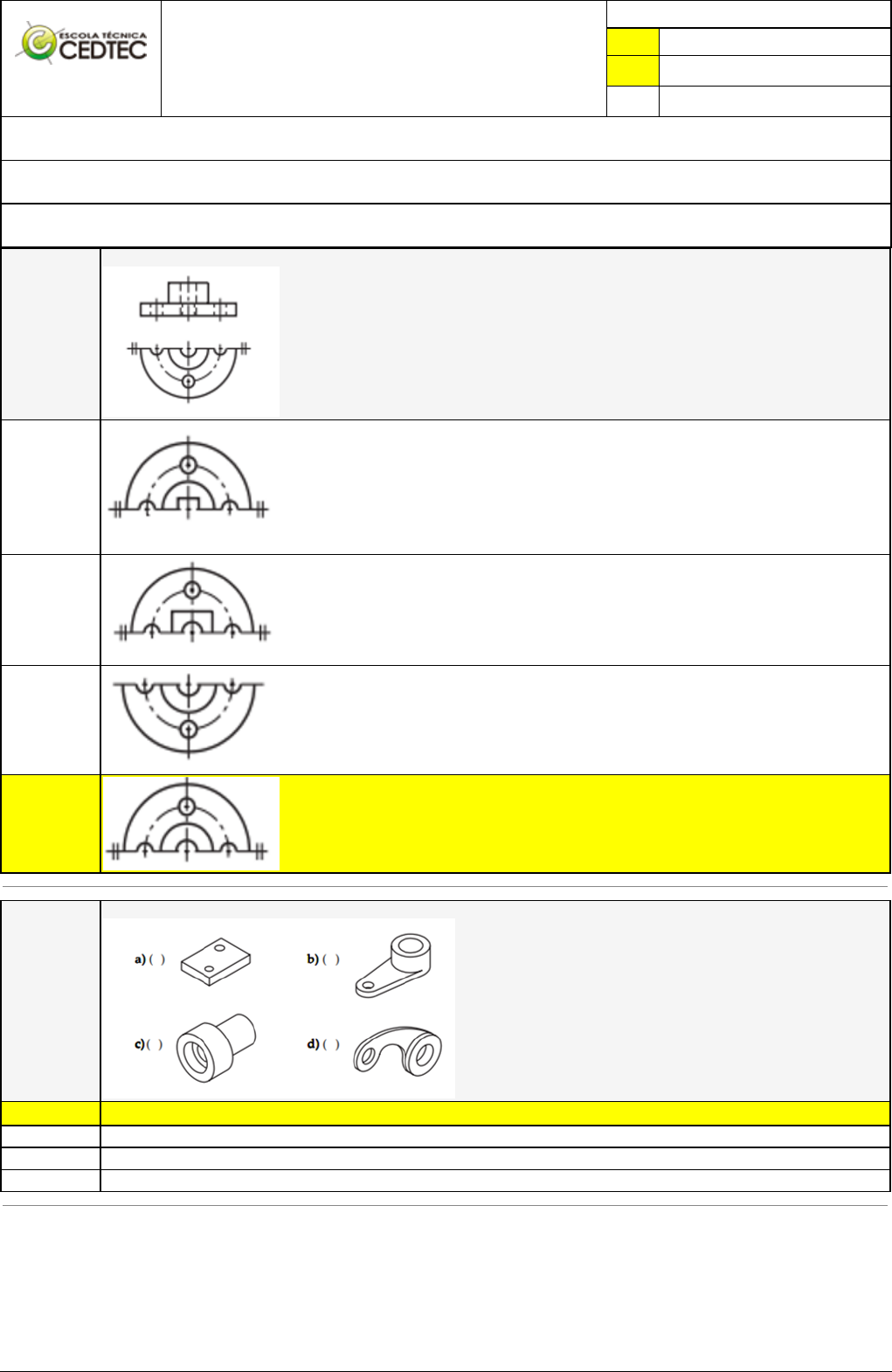 Pincel Atômico - 29/06/2023 19:33:42 1/2 GISLANE SANTOS DIAS OLIVEIRA Exercício Caminho do Conhecimento - Etapa 8 (640) Atividade finalizada em 22/06/2023 22:32:13 (929224 / 2) LEGENDA Resposta correta na questão # Resposta correta - Questão Anulada X Resposta selecionada pelo Aluno Disciplina: DESENHO MECÂNICO [838631] - Avaliação com 4 questões, com o peso total de 6,50 pontos [capítulos - 113] Turma: Curso Técnico: Mecânica - Grupo: EAD - 05/23 - EAD MEC [88398] Aluno(a): 91455539 - GISLANE SANTOS DIAS OLIVEIRA - Respondeu 4 questões corretas, obtendo um total de 6,50 pontos como nota [350245_54792] Questão 001 Marque com um X a alternativa que corresponde à parte simétrica da meia vista representada abaixo: X [350246_54795] Questão 002 Assinale com um X as duas peças que podem ser representadas com vistas parciais (meia vista ou ¼ de vista): X b e c c e d a e d a e b Pincel Atômico - 29/06/2023 19:33:42 2/2 [350246_54805] Questão 003 Marque com um X a alternativa que indica desenhos com vistas auxiliares: b e c a e c X a e d b e d [350245_54798] Questão 004 Analise o desenho abaixo e marque um X na alternativa que indica a medida da altura da face menor: X 20 15 10 2