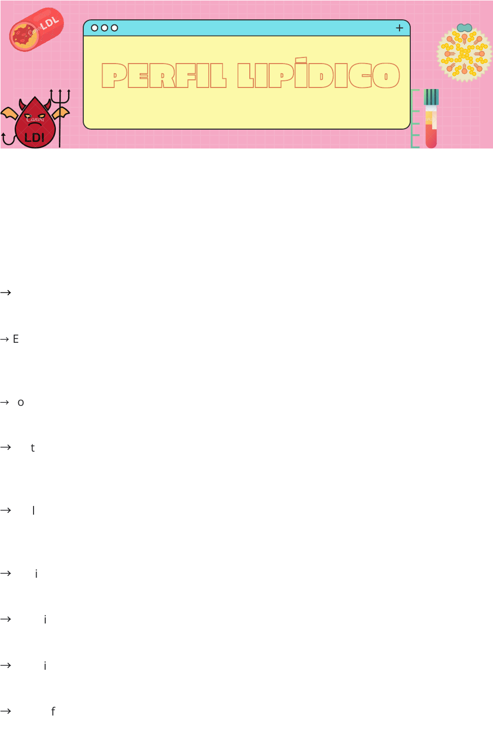 Perfil lipídico: anteriormente denominado lipidograma, consiste em uma série de exames laboratoriais com o objetivo de identificar distúrbios dos níveis de lipídeos que impactam o risco cardiovascular, como colesterol e triglicerídeos. Visão geral: → os distúrbios do metabolismo dos lipídico exercem papel fundamental na aterosclerose e na doença cardíaca coronariana (DCC) → Existe uma clara relação entre a elevação dos níveis séricos de colesterol e o infarto do miocárdio, e no nível tecidual, os depósitos se formam em áreas onde há dano celular endotelial e constituem uma parte proeminente das lesões ateroscleróticas. → colesterol: componente estrutural essencial de membrana celular e precursor de hormônios esteroides e ácidos biliares → Outro lipídeo, o TG, é uma das principais fontes de energia para as células. O colesterol e TGs ( triglicerídeos) são os lipídeos mais importantes no estudo e monitoramento do risco de DCC. → Os lipídeos são solúveis em solventes orgânicos apoiares, como o clorofórmio e o éter, contudo, permanecem relativamente insolúveis na presença de solventes polares, como a água → Os lipídios fisiológica e clinicamente mais importantes presentes no plasma são os ácidos graxos, os triglicerídeos (triacilgliceróis), os fosfolipídios e o colesterol → Os ácidos graxos podem ser saturados (sem duplas ligações entre seus átomos de carbono), mono ou poli-insaturados – com uma ou mais duplas ligações na sua cadeia → Os triglicerídeos são as formas de armazenamento energético mais importante no organismo, constituindo depósitos no tecido adiposo e no músculo → Os fosfolipídios atuam na formação de bicamadas, que são as estruturas básicas das membranas celulares PERFIL LIPÍDICOPERFIL LIPÍDICO → O colesterol é precursor dos hormônios esteroides, dos ácidos biliares e da vitamina D, além de ter importantes funções nas membranas celulares, influenciando a sua fluidez e o estado de ativação de enzimas ligadas a membranas. → Assim, o colesterol e os TGs não viajam pelo plasma como moléculas livres flutuantes, mas como parte de macromoléculas solúveis em água denominadas lipoproteínas Funções dos lipídeos: Lipoproteínas → As lipoproteínas são partículas que transportam lipídios apolares (insolúveis em água) em seu núcleo → Esses complexos são constituídos por quantidades variáveis de colesterol e seus ésteres, triglicerídeos, fosfolipídios e proteínas denominadas apolipoproteínas, sendo solúveis no meio aquoso plasmático devido à natureza hidrófila da parte proteica → Com base na densidade lipoproteínas são divididas em: → Nas últimas décadas, acumularam-se evidências relacionando as desordens de uma ou mais frações lipídicas no sangue (dislipidemias) com significativas e crescentes morbidade e mortalidade por doença vascular e/ou pancreática. A avaliação laboratorial das dislipidemias é definida pelas determinações de: • Colesterol total (CT). 1. energética: ácidos graxos podem ser degradados em Acetil-CoA ou estocados sob forma de triglicerídeos, quando ligado a um glicerol 2. estrutural: fosfolipídios formam a bicamada de membranas celulares e principalmente células do tecido nervoso 3. hormonal: formam esteroides como hormônios sexuais, glicorticóides e mineralocorticoides 4. digestória: forma sal biliar para emulsificação de gorduras 5. imunológica: forma as prostaglandinas (tramboxanos e leucotrienos) 6. transportadora: carrega vitaminas lipossolúveis ( vit. A,D,E e K) 1. quilomícrons = ricas em triglicerídeos de origem intestinal 2. lipoproteínas de densidade muito baixa (VLDL= very low density lipoprotein) = ricas em triglicerídeos de origem hepática 3. lipoproteínas de densidade baixa (LDL= low density lipoprotein)= ricas em colesterol 4. lipoproteínas de densidade alta (HDL= high density lipoprotein)= ricas em colesterol • Triglicerídeos (TG). • Colesterol ligado à HDL (HDL-C). • Colesterol ligado à LDL (LDL-C). → O colesterol contido nas lipoproteínas apresentam sob duas formas: → as lipoproteínas apresentam um arranjo micelar: → As lipoproteínas podem ser diferenciadas de acordo com a densidade, tamanho da partícula, composição química e mobilidade eletroforética → Cada lipoproteína está associada a apolipoproteínas específicas que exercem funções importantes no transporte dos lipídeos, como ativação/inibição das enzimas envolvidas no metabolismo lipídico, e também na ligação das lipoproteínas a receptores na superfície celular 1. colesterol livre: um álcool não esterificado polar 2. éster de colesterol: uma forma hidrofóbica onde o colesterol encontra-se ligado aos ácidos graxos Os lipídeos hidrofóbicos, como os ésteres de colesterol e os TGs, ficam localizados na região central da partícula Os lipídeos hidrossolúveis, como o colesterol livre e os fosfolipídios (FLs), permanecem organizados na superfície com os grupos polares voltados para o lado externo As apolipoproteinas -a porção proteica das lipoproteínas - também se encontram dispostas sobre a superfície → As lipoproteínas são comumente diferenciadas umas das outras com base em sua mobilidade eletroforética e densidade de flutuação → A densidade de uma partícula de lipoproteína é determinada principalmente por seu conteúdo de proteína e triglicerídeos → O processo de ultracentrifugação separa as lipoproteínas de acordo com suas densidades de flutuação. A densidade de uma partícula de lipoproteína é determinada principalmente por seu conteúdo de proteína e TGs → Lipoproteínas com grande conteúdo de triglicerídeos e pouca quantidade de proteínas (QM e VLDL) são menos densas do que aquelas com grande conteúdo proteico e pouca quantidade de triglicerídeos (HDL). LDL e IDL são mais densas do que a VLDL, porém, menos densas que a HDL. → Em termos func