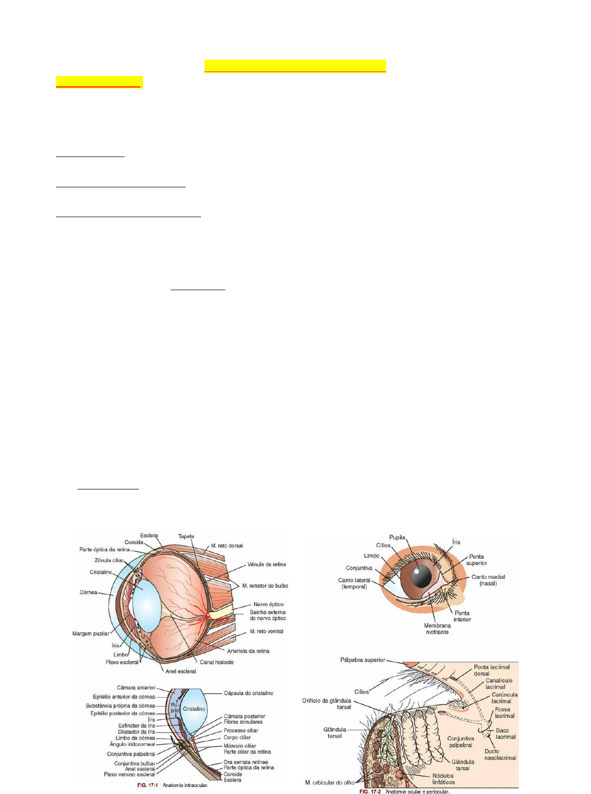 Página 1 de 9 CLÍNICA CIRÚRGICA AULA 05/05/2023 PRINCIPAIS DOENÇAS OCULARES NA ROTINA CLÍNICA CERATITES SUPERFICIAIS E ULCERATIVAS LESÕES CORNEANAS: se existe uma lesão corneana existe um fator predisponente, ou algo pra isso. É a estrutura mais exposta por isso a frequência. Para o olho trabalhar bem precisamos dos anexos oculares, eles podem ser nomeados (pálpebra ocular, músculos ocu- lares, gordura retrobulbar...) que fazem com que o olho funcione normalmente. A camada mais avançada é a córnea, estrutura mais exposta e por isso as lesões ocorrem nela. Fatores externos: alterações palpebrais, ciliares, traumas, má formações dos anexos, colonização bacteriana A superfície ocular não é estéril, temos uma microbiota residente. Fatores ligados a outros tecidos: uveítes, doenças infecciosas (todas). Muitas vezes o problema primário não é a córnea, mas existe algo que reflete no globo ocular. Fatores internos da própria córnea: distrofias, degenerações, problemas lacrimais (olho seco, falta de lágrima – KCS, ceratoconjuntivite seca; e problemas na composição da lágrima) CÓRNEA: Histologicamente 4 camadas; fisiologicamente 5 camadas. Camada mais superficial é o filme lacrimal. Tudo funciona bem se ele estiver funcionando adequadamente. • CAMADA DE REVESTIMENTO → Epitélio pavimentoso sem queratina, 7 a 9 camadas com células justapostas. É hidrofóbica Lágrima faz nutrição e oxigenação da córnea. Epitélio mantém superfície corneana, favorece lubrificação. • ESTROMA → lâminas de colágeno organizadas perfeitamente para que a córnea seja transparente. A luz passa de maneira adequada por conta dessa organização. É hidrofílico, e se estiver exposto absorve água/líquido – edema, que ocasiona opacidade [aspecto azulado é pelo contraste com o fundo do olho do animal]. • MEMBRANA DE DESCEMET → camada bem fina que fica exatamente na base do estroma. É elástica, delgada. • ENDOTÉLIO → muito fina, mais interna, conectada pelo líquido intraocular, funciona como bomba ativa – dentro da córnea temos líquido e quem tira esse líquido de dentro é o endotélio. Ele é único com células lado a lado, elas têm capacidade reduzida de regeneração – se começamos a perder endotélio acumula líquido dentro da córnea, gerando edema, clinicamente percebemos com opacidade que mesmo com o animal melhorando-a não se faz. Exemplo Hepatite infecciosa canina que destrói células endoteliais e depois da doença ocorre síndrome do olho azul, animal permanece com olho opaco a vida toda prejudicando a visão. Deturgescência é a capacidade da córnea de manter sua hidratação controlada, de se manter desidratada. Córnea para se manter transparente não tem pigmento, vasos, mielina. Mas é altamente inervada e precisa manter sua deturgescência. Um animal com doença corneana apresenta vasos e pigmento na córnea, perdendo a transparência. Página 2 de 9 1. ÚLCERA CORNEANA: Para afirmar que é uma ulceratite superficial → precisamos de um colírio. Ela vai corar de maneira superficial por rosa bengala e lisamina verde. 2. ÚLCERA SUPERFICIAL: Em uma lesão que invade um pouco estroma, é uma úlcera superficial, que vai se corar por Fluoresceína. 3. ÚLCERA ESTROMAL PROFUNDA: perdemos muito colágeno (lesão direta ou ação de enzimas). Medicamento que inibe as defesas da superfície ocular, inibe cicatrização e potencializa colagenase. Prejudicando cicatrização da úlcera, é tóxico. Testar fluoresceína antes do corticoide. 4. DESCEMETOCELE: lesão muito profunda no estroma e só vemos a membrana (bolsa) de Descemet. A membrana não se cora, então se fazemos Fluoresceína e vemos que o fundo da lesão não se cora, indica a Descemetocele, perfuração eminente. Sinais clínicos: dor, blefarospasmo (sinal de desconforto, dor), hiperemia conjuntival, secreção ocular, opacidade de córnea, neovascularização, pigmentação, ulceração, lacrimejamento, epifora (Poodle com canto do olho marrom – lá- grima que escorre e pigmenta o pelo. No canto do olho temos ponto de drenagem), uveíte reflexa. Braquicefálicos produzem menos lágrimas, tem pregas de pele, mais pelos. CERATITES SUPERFICIAIS → testam negativo com Fluoresceína A porção aquosa do filme lacrimal é depositado em cima do olho e drenado em baixo, enquanto piscamos distribuímos ele. 50% são perdidos na evaporação, então dependendo da quantidade de lagrima não é drenado, e a porção do olho que ficará mais tempo sem lágrima será a porção nasal. PRINCÍPIOS PARA O TRATAMENTO DAS CERATITES ATB (Antimicrobianos): • Inicial empírico • Cultura e antibiograma • Frequência variável QID a hr/hr (varia de a cada 6h até de hora em hora) • Tobra/Genta/Quinolonas (geralmente usamos essa sequência, que é variável) Pannus → doença autoimune, gera ceratite superficial, próprio organismo tentando combater a córnea. Gera tecido de granulação em cima do olho. Responde bem a imunossupressores. Úlcera geografia → contorno deixa de ser circular. Geralmente por material abrasivo, lesão mecânica. Sequestro corneano → mais comum em felinos. Degeneração da córnea, com característica de uma placa pigmentada no olho, geralmente marrom ou preta. • SEROSA → lágrima • MUCOIDE • PURULENTA → pus • MUCOPURULENTA Página 3 de 9 Evitar produtoras de colagenase, então sendo possível vamos adotar o uso de antimicrobianos. A cultura e antibio- grama demora em torno de 5-7 dias, então no início usamos empiricamente. Definimos as melhores escolhas. No início usamos a Tobramicina, quando chegar antibiograma aí fazemos ajuste. Não usamos injetável porque córnea não tem vaso então não temos perfusão ideal de antibiótico. MIDRIÁTICO/CICLOPLÉGICO: • Reduzir espasmo/dor • Uveíte • Midríase • Atropina 0,5 a 1% - BID Dentro do olho temos a úvea que tem vasos e músculos, toda vez que temos uma inflamação