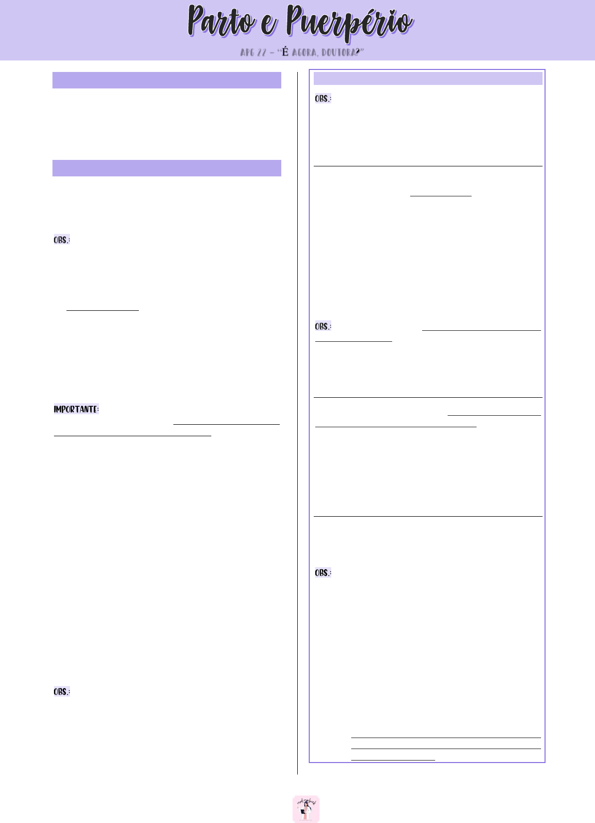1 Júlia Morbeck – @med.morbeck Objetivos 1- Conhecer o trabalho de parto, com ênfase em dinâmica fetal e uterina. 2- Entender as fases e a assistência do parto. 3- Entender o puerpério. Trabalho de parto ↠ O momento do nascimento é determinado por um ajuste entre a maturação fetal e os mecanismos que deflagram a parturição (FERNANDES, 2018). A média da duração da gravidez humana única é de 280 dias (40 semanas) contados a partir do primeiro dia do último período menstrual, sendo definida a gravidez a termo como o período de 259 dias até 293 dias, após o último ciclo (37 a 41 e 6/7 semanas) (FERNANDES, 2018). ↠ Trabalho de parto é o período que vai desde o início das contrações uterinas regulares associadas ao apagamento e à dilatação cervical até a expulsão do concepto e da placenta. O reconhecimento do início do TP nem sempre é simples, pois, muitas vezes, o seu diagnóstico só é confirmado retrospectivamente (MARTINS-COSTA et al., 2017). A admissão de uma parturiente para acompanhamento do TP deve ser feita com base no grau de dilatação e na presença de contrações uterinas regulares e frequentes. Quando a gestante chega ao centro obstétrico (CO) com colo apagado, dilatação cervical de 4 cm ou mais e contrações uterinas com frequência de pelo menos 2 a cada 10 minutos, presume-se que tenha alcançado a fase ativa do TP. Esse método presuntivo de identificar o TP traz muitas incertezas durante os períodos iniciais (MARTINS-COSTA et al., 2017). ↠ O TP e o parto não podem ser considerados um processo passivo no qual um motor de contrações empurra um objeto rígido inanimado através de uma abertura fixa. A habilidade do feto em “negociar” o sucesso final de passar por essa trajetória depende de uma complexa interação de três variáveis: (FERNANDES, 2018). • O poder propulsor, fornecido pelas contrações uterinas; • A mobilidade do passageiro (móvel-feto); • A passagem (trajeto duro e mole do canal de parto). Mecanismo do parto fisiológico: apresentação cefálica fletida em bacia ginecoide (MONTENEGRO; FILHO, 2017). FASES DA FISIOLOGIA DA ATIVIDADE CONTRÁTIL UTERINA O útero é composto por músculo liso e, portanto, tem como unidade funcional a fibra muscular lisa (FERNANDES, 2018). ↠ De modo didático, a atividade miometrial ao longo da gravidez poderia ser dividida nas seguintes fases (FERNANDES, 2018). Fase zero: inibição ativa ↠ A atividade miometrial inibida: durante a maior parte do período gestacional o útero tem sua cinética quiescente, decorrente da ação atribuída a várias substâncias inibidoras, a saber: (FERNANDES, 2018). • Progesterona; • Prostaciclinas (prostaglandina – PG – 1 e 2); • Relaxina; • Óxido nítrico; • Peptídeos relacionados ao gene da calcitonina; • Peptídeos relacionados ao hormônio da paratireoide; • Adrenomodulina; • Peptídeo vasoativo intestinal. Importante destacar que o útero apresenta atividade contrátil durante toda a gravidez, embora a frequência, localização e intensidade das contrações, cujo somatório define o chamado trabalho uterino, não são suficientes para deflagrar o processo da parturição (FERNANDES, 2018). Fase 1: Atividade miometrial ↠ Período próximo ao termo, quando o útero começa a reagir às ações de substâncias com poder uterotrópico, por exemplo, os estrogênios. A fase é reconhecida pela ativação dos receptores associados a proteínas (CAP), principalmente os de ocitocina e de PGs, dos canais de íons e aumento das chamadas conexinas-43, que fazem parte das GAP (comunicações intercelulares). Esse processo aumenta a sincronia elétrica miometrial e facilita a efetiva coordenação das contrações (FERNANDES, 2018). Fase 2 ↠ Fase de estimulação, quando o útero, “devidamente preparado”, pode ser estimulado pelos agonistas uterotônicos como as PGs E2 e F2-alfa, as endotelinas-1 e a ocitocina (FERNANDES, 2018). Teleologicamente, é razoável considerar que o feto, alcançando suficiência na maturidade de seus órgãos, “sinalizasse” para o processo de parturição se iniciar. O “sinal” que seria emitido pelo concepto não é conhecido ou foi identificado no ser humano, sendo apenas sugerido (FERNANDES, 2018). ↠ Alternativamente, nos humanos, o “sinal de partida” poderia ser transmitido dos pulmões ou rins, por meio de secreções ou excreções desses órgãos, para o interior do líquido amniótico – o braço parácrino do sistema de comunicação do binômio mãe-feto (FERNANDES, 2018). ↠ Esta fase do processo poderia ser dividida em três estágios individualizados: (FERNANDES, 2018). • O primeiro deles começa quando podem ser identificadas contrações com frequência, intensidade e duração suficientes para provocar demonstráveis esvaecimento e dilatação do colo uterino. Terminaria quando a dilatação APG 22 – “É AGORA, DOUTORA?” 2 Júlia Morbeck – @med.morbeck atingisse suficiente espaço para permitir a passagem do feto, havendo importante liberação da ocitocina no plasma materno nesse momento, mas predominam os níveis de PGs no líquido amniótico e na corrente sanguínea materna, que aumentam de modo significativo durante todo o processo; • O segundo estágio começaria quando a dilatação atingisse seu máximo e terminaria quando o feto é expulso do ventre materno. Neste momento, a ocitocina plasmática aumenta de modo dramaticamente intenso; • O terceiro estágio inicia-se imediatamente após o parto do feto, terminando com a expulsão completa da placenta e das membranas e, ao contrário do que se considera em geral, com o prosseguimento regular da atividade uterina, com contrações muito fortes e de alta intensidade, agora desacompanhadas de dores ou desconforto maiores, mas passíveis de serem demonstradas ou até percebidas pela mãe. Há forte retração do volume uterino com a saída de seu conteúdo principal e a placenta se 