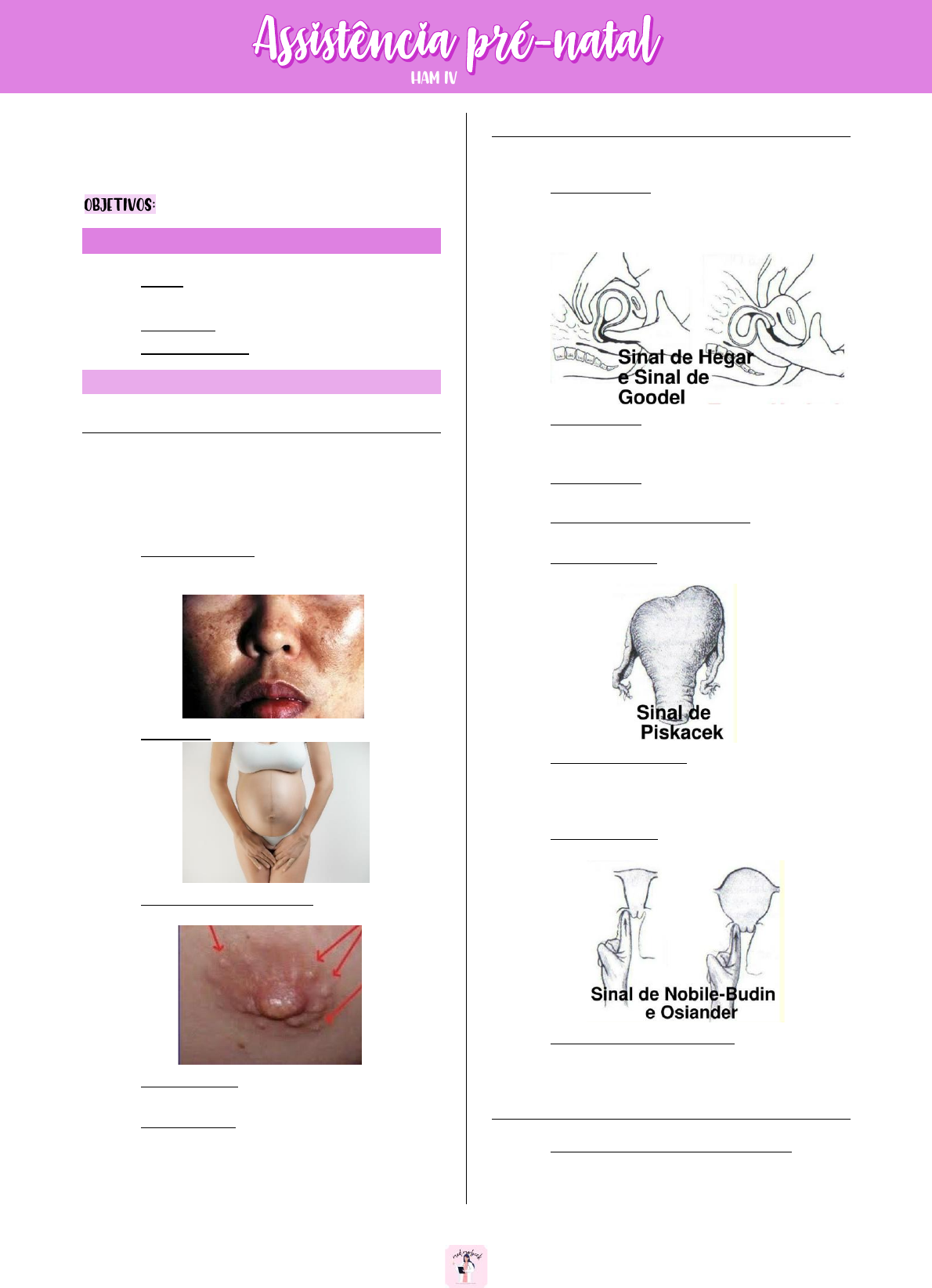 1 Júlia Morbeck – @med.morbeck • Promover a saúde; • Orientar sobre alterações fisiológicas; • Antever e evitar complicações; redução da mortalidade materna e perinatal. Diagnóstico • Clínico: sinais de presunção, probabilidade e certeza; • Laboratorial: Beta-HCG; • Ultrassonográfico: desenvolvimento embrionário. CLÍ NICO SINAIS DE PRESUNÇÃ O • Atraso menstrual até 14 dias; • Náuseas e vômitos; • Aumento da sensibilidade álgica mamária; • Polaciúria; • Cloasma gravídico: manchas provocadas pelo aumento da produção de melanina circundando parte da testa, ao redor do nariz, bochecha e lábio superior. • Linha nigra: pigmentação da linha alba. • Tubérculo de Montgomery: hipertrofia das glândulas sebáceas nas aréolas. • Sinal de Hunter: hiperpigmentação da aréola primária e aparecimento da aréola secundária com limites imprecisos. • Rede de Haller: aumento da vascularização venosa na mama. SINAIS DE PROBABILIDADE • Atraso menstrual de mais de 14 dias; • Sinal de Goodel: amolecimento do tecido uterino – na gravidez os tecidos ficam mais congestos, mais umedecidos. • Sinal de Hegar: amolecimento do istmo uterino (durante o toque bimanual, a sensação é semelhante à separação do corpo da cérvice). • Sinal de Kluge: coloração violácea da vagina, entre 8 e 12 semanas. • Sinal de Jacquemier (Chadwick): coloração violácea do meato urinário e da vulva, entre 8 e 12 semanas. • Sinal de Piskacek: assimetria uterina a palpação (no local onde implantou o zigoto). • Sinal de Nobile-Budin: quando o útero aumenta de tamanho ele ocupa o fundo de saco –percepção pelo toque do preenchimento do fundo de saco pelo útero gravídico (útero se torna globoso). • Sinal de Osiander: percepção do pulso da artéria vaginal ao toque vaginal. • Aumento do volume uterino: o útero aumenta de tamanho em cerca de 1 cm por semana após quatro semanas de gestação. SINAIS DE CERTEZA • Ausculta dos batimentos cardiofetais com o estetoscópio de Pinard (a partir de 20 semanas) ou o sonar (a partir de 10 a 12 semanas); 2 Júlia Morbeck – @med.morbeck • Sinal de puzos: (rechaço fetal intrauterino): durante o exame bimanual, um discreto impulso no útero, por meio do fundo de saco anterior, deslocará o feto no líquido amniótico para longe do dedo do examinador. A tendência do retorno do feto faz com que ele seja novamente palpável. • Percepção de partes e movimentos fetais pelo examinador: por meio da palpação abdominal, é possível perceber movimentos do feto a partir de 18 a 20 semanas. LABORATORIAL O hCG é secretado na circulação materna após a implantação, que ocorre 6 a 12 dias após a ovulação. Esse é o primeiro momento em que o hCG pode ser detectado com um teste ultrassensível, e valores acima de 25 mUI/mL sugerem gravidez em curso (FERNANDES, 2018). • Hormônio Gonadotrofina Coriônica Humana; • Acima de 25 mUI/ml considera reagente; • Valores duplicam a cada 48 horas (até 30 dias). • Nível de hCG se estabiliza em torno da 8ª e 10ª semana de gestação. O cincisiotrofobastro que produz esse hormônio. O hCG mantém o corpo lúteo e estimula o corpo lúteo a produzir, principalmente, a progesterona. O beta hCG não é adequado para datar gestação. Fatores que influenciam a escolha de fazer o teste na urina ou no soro incluem a duração do atraso menstrual, necessidade de precisão, conveniência e custo. Uma vez que os testes de urina são ligeiramente menos sensíveis do que os do soro, os testes de soro são preferíveis quando o atraso da menstruação é menor que uma semana, especialmente quando a exclusão da gravidez é um fator importante no atendimento à paciente (FERNANDES, 2018). A causa mais comum de um resultado falso-negativo é quando a ovulação ocorreu mais tarde que o esperado e o teste é realizado muito próximo da concepção. Se há suspeita de gravidez, apesar de negativo, o teste deve ser repetido em uma semana. Esperar uma semana ou duas após uma falha menstrual, antes de realizar um teste de gravidez na urina, não só minimiza resultados falsos-negativos, mas também diminui a tendência de realizar um teste de hCG no soro (sérico) para excluir ou confirmar a gravidez muito precoce após um teste de urina negativo. Mulheres com ciclos irregulares devem esperar pelo menos 14 dias a partir de um ato sexual antes de obter um teste de gravidez (FERNANDES, 2018). Raramente, um teste sorológico de gravidez positivo não é devido à gravidez. Os imunoensaios modernos para hCG, seja na urina ou no soro, identificam especificamente a subunidade beta do hCG, tornando a reação cruzada com subunidades de outros hormônios [hormônio luteinizante (LH), hormônio folículo-estimulante (FSH) e hormônio tireoestimulante (TSH)] improvável. Testes de gravidez falsos-positivos são raros e devidos a: Secreção de hCG por um tumor; Secreção pituitária de hCG, tipicamente em mulheres perimenopáusicas; Interferência por anticorpos humanos contra anticorpos animais ou humanos (teste sérico positivo, mas o teste de urina geralmente é negativo) (FERNANDES, 2018). ULTRASSONOGRÃ FICO ↠ É possível visualizar o saco gestacional por meio da ultrassonografia transvaginal. O saco gestacional é visualizado entre 4,5 e 5 semanas de gestação (três a quatro semanas após a ovulação), quando atinge tamanho de 2 a 4 mm no seu diâmetro médio. O saco vitelino é a primeira estrutura a ser visualizada no saco gestacional e aparece entre cinco e seis semanas, permanecendo até aproximadamente 10 semanas; a atividade cardíaca pode ser detectada pela primeira vez em 5,5 a 6 semanas. Essas estruturas são observadas um pouco mais tarde com a abordagem transabdominal (FERNANDES, 2018). ↠ Medições biométricas (por exemplo, tamanho do saco gestacional, comprimento cabeça-nádega, diâmetro biparietal, comprimento do fêmur) são utilizadas para es